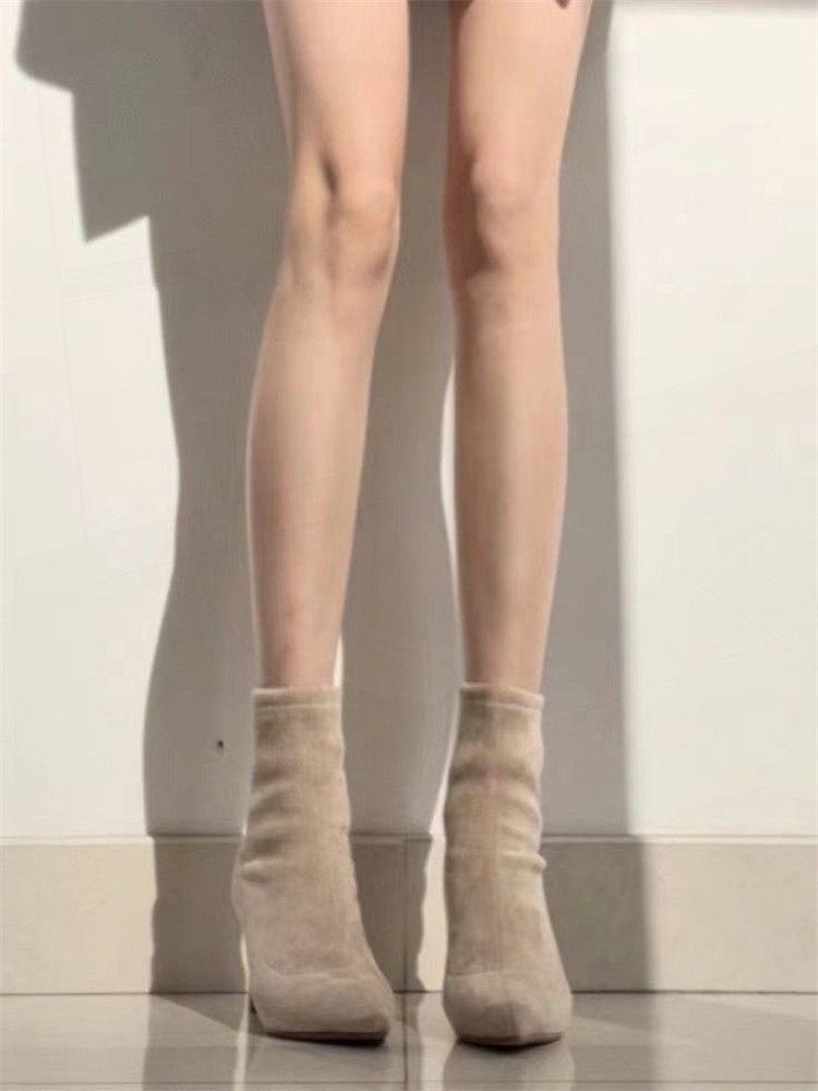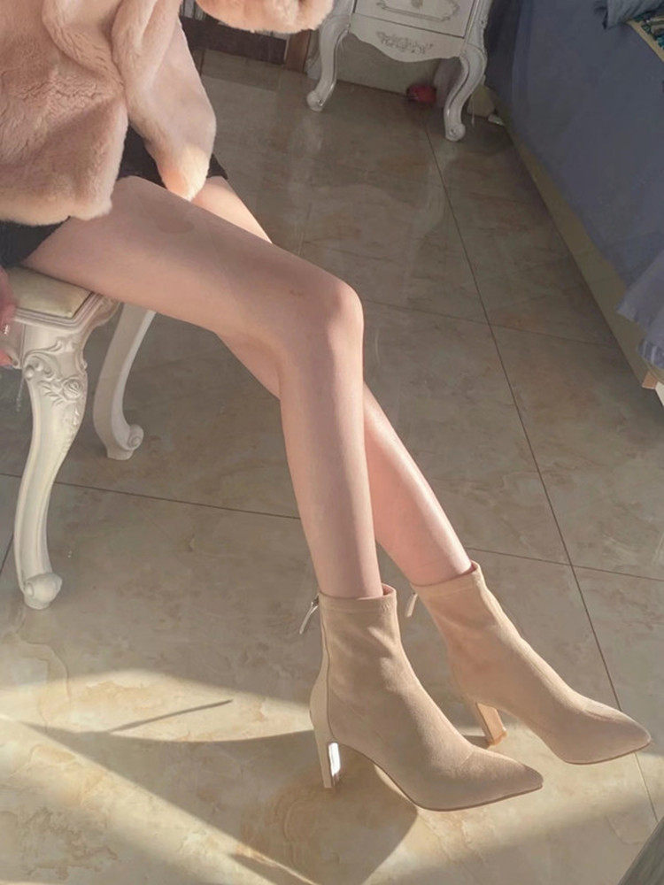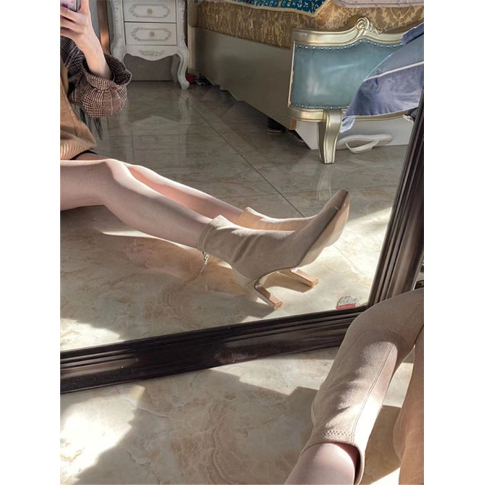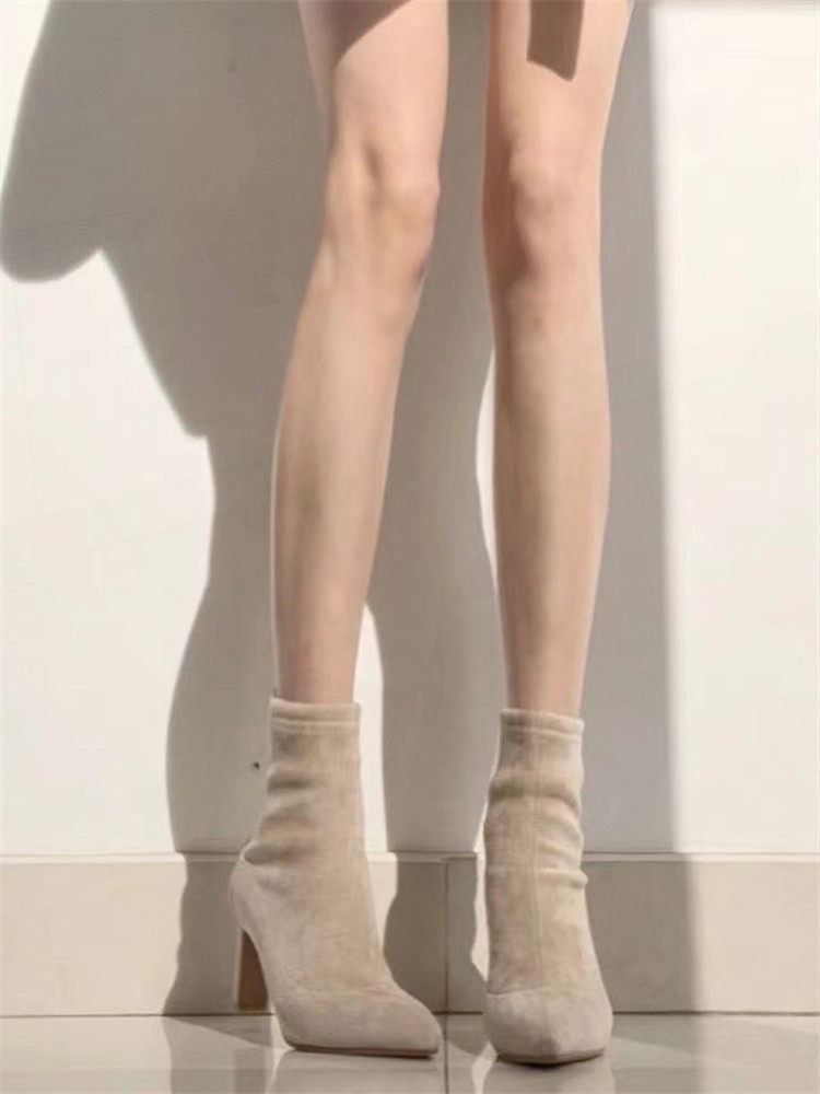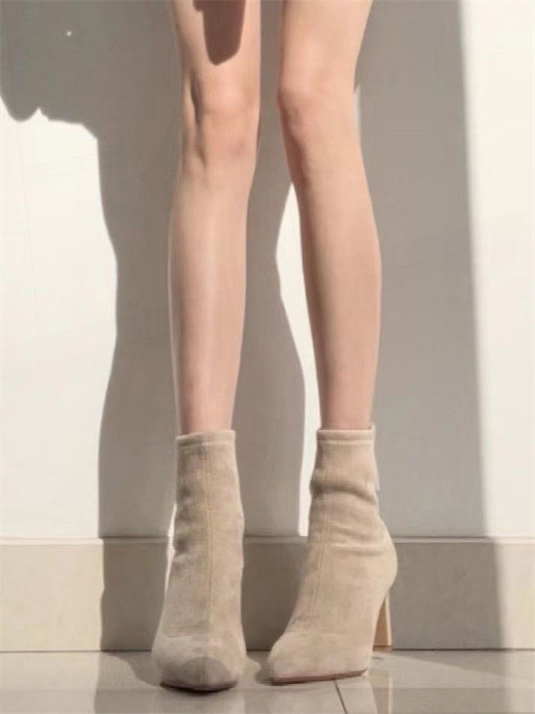 杏色高跟短靴女2023年秋冬新款絨面細跟尖頭高跟鞋粗跟彈力襪子靴