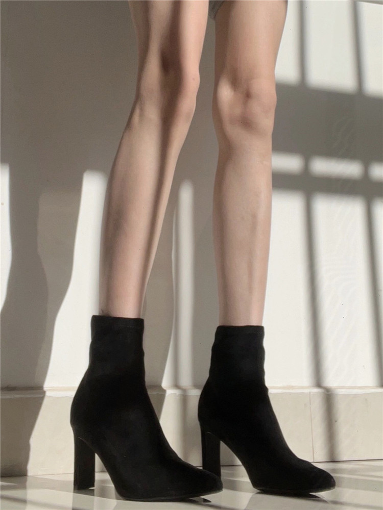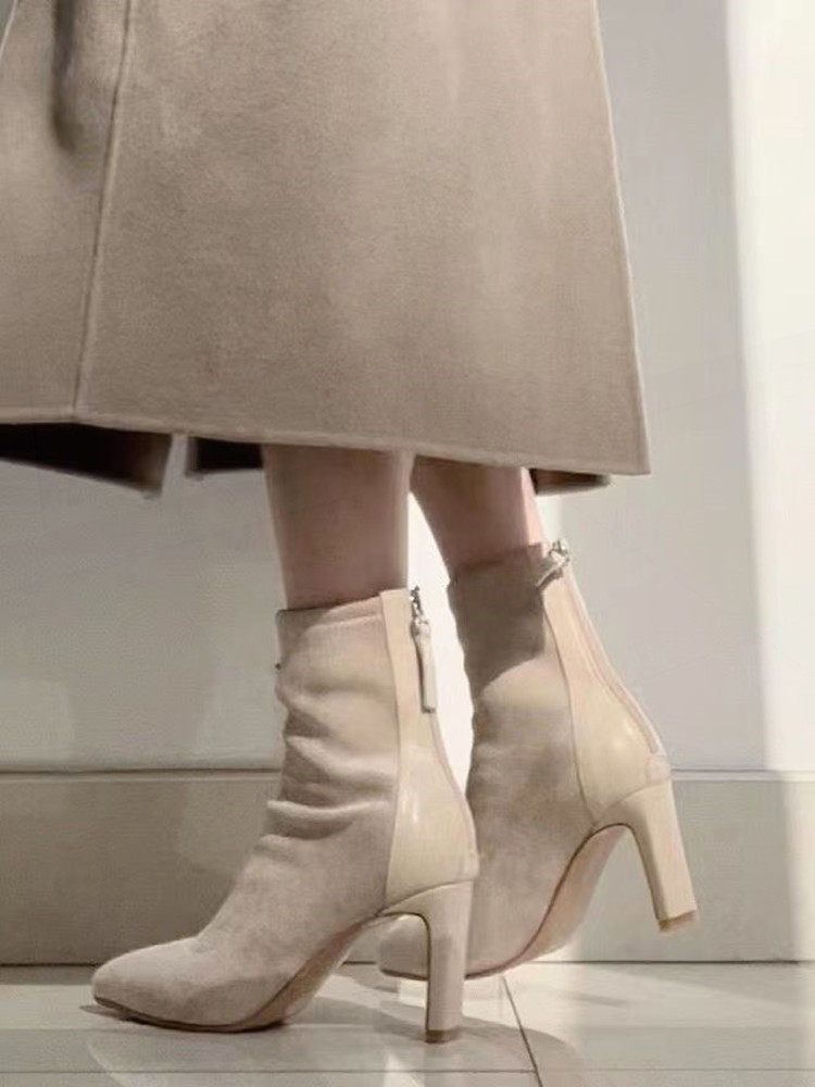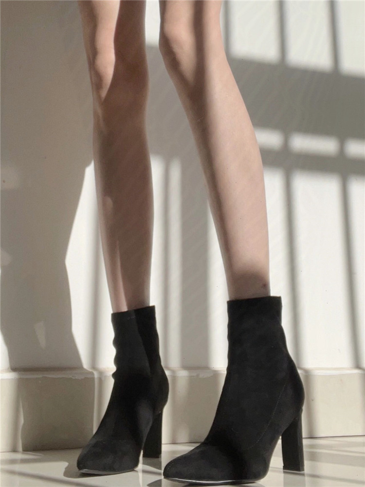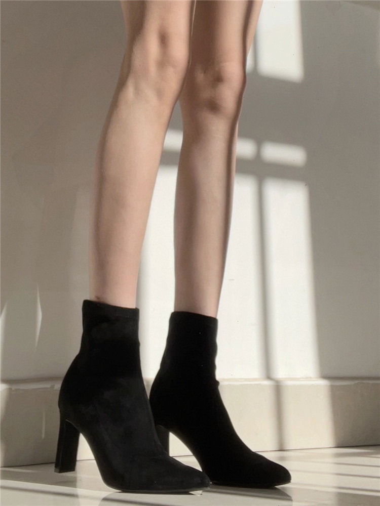 杏色高跟短靴女2023年秋冬新款絨面細跟尖頭高跟鞋粗跟彈力襪子靴