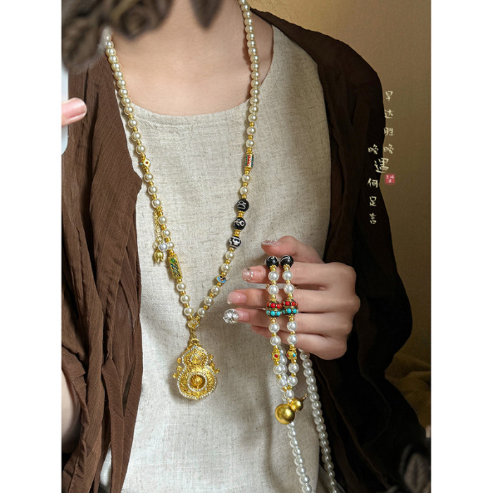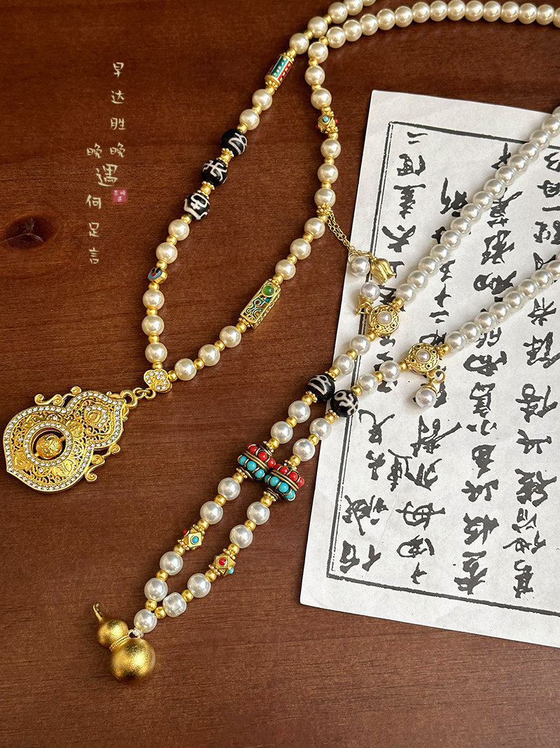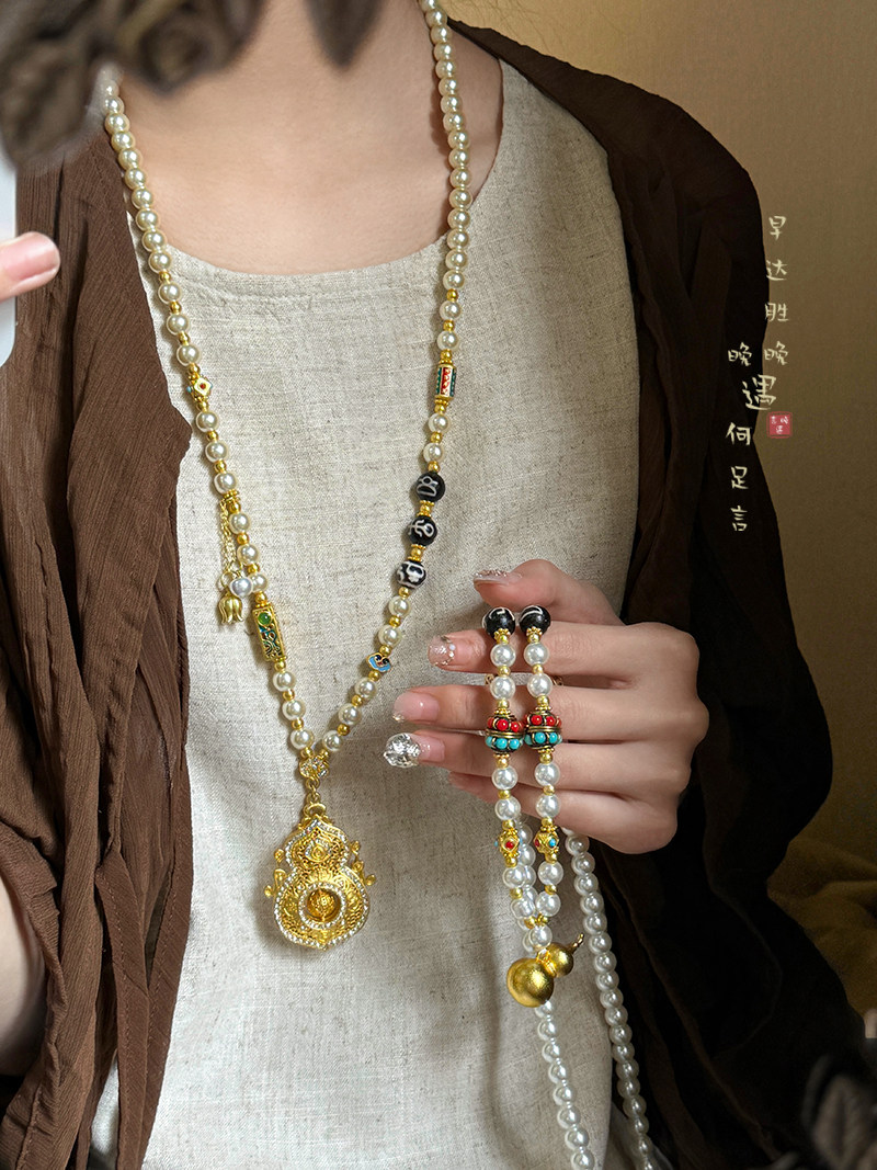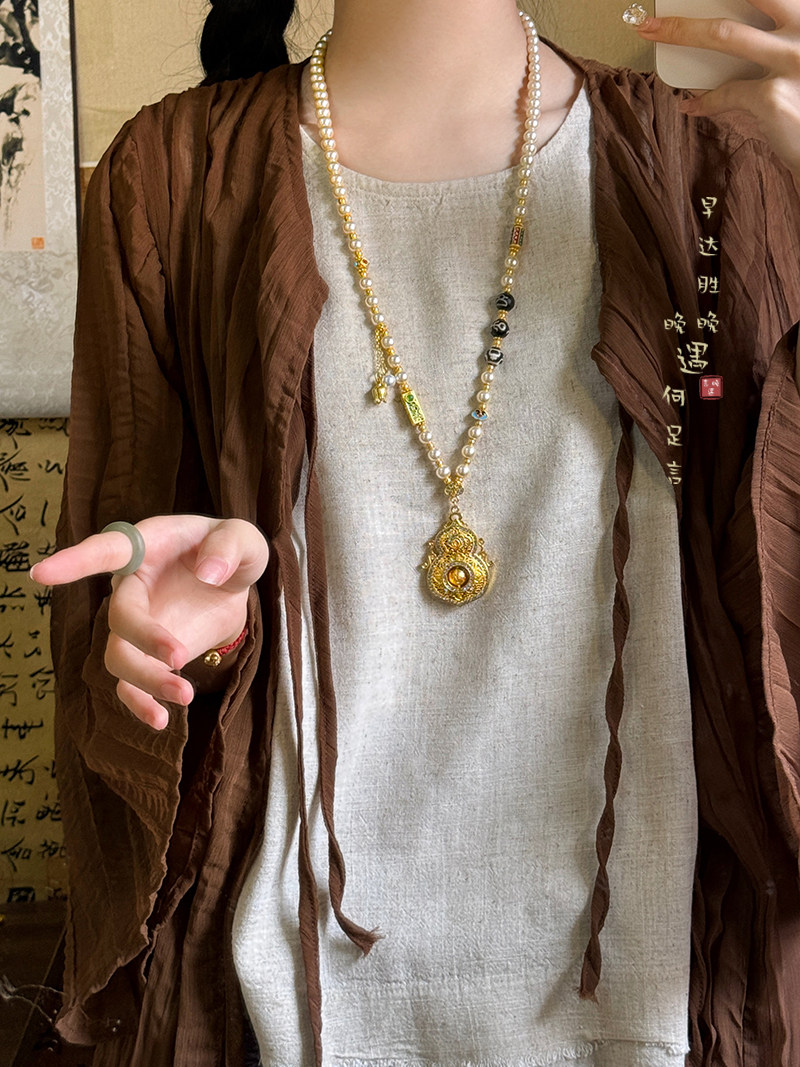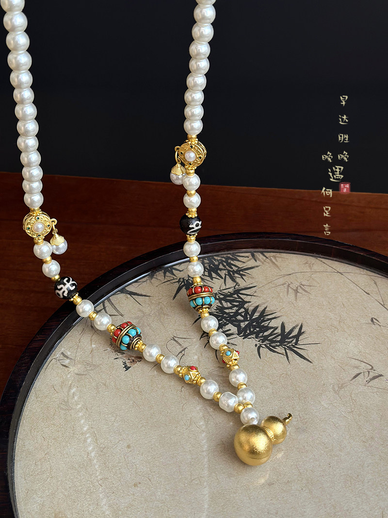 古法金色葫蘆仿珍珠吊墜項鍊女款新中式國風高級感長款毛衣鏈配飾