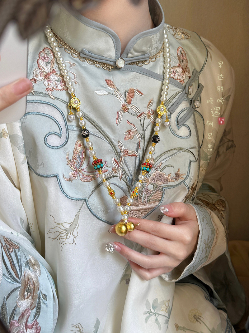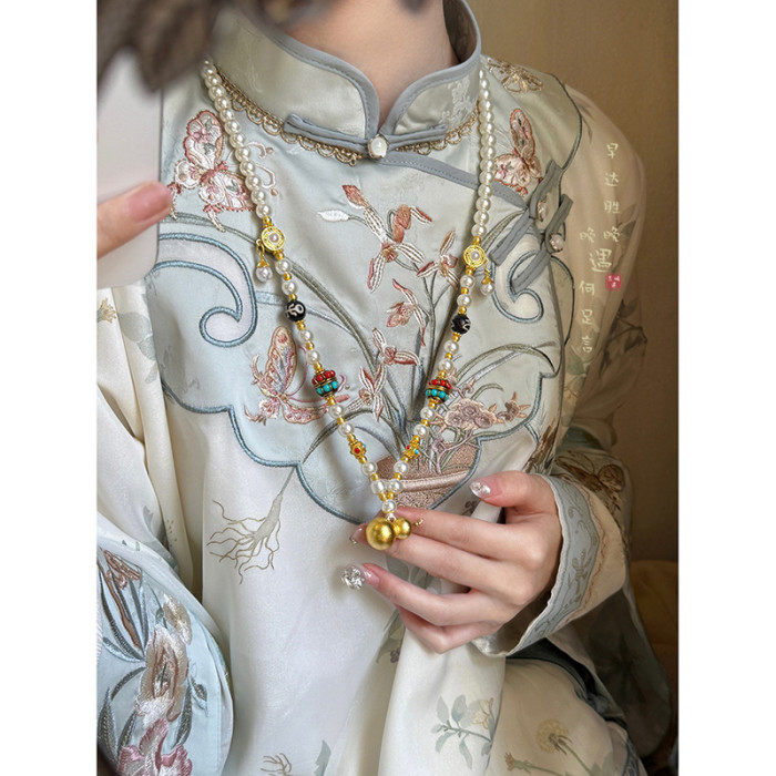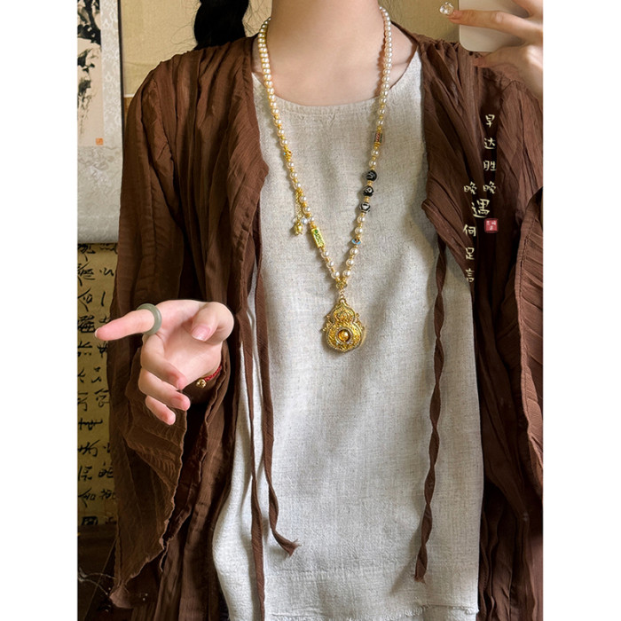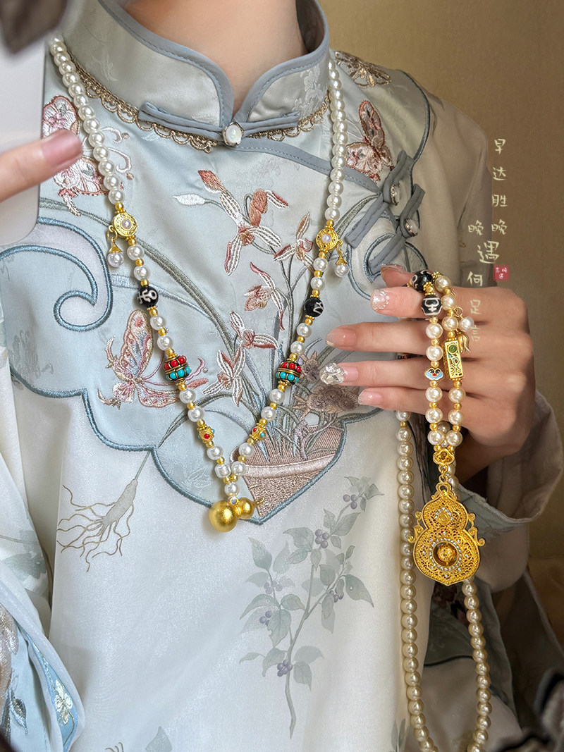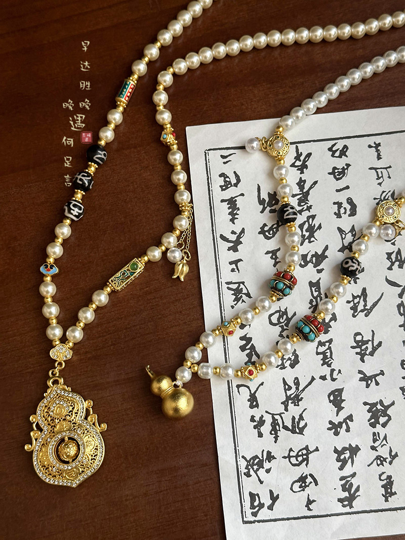 古法金色葫蘆仿珍珠吊墜項鍊女款新中式國風高級感長款毛衣鏈配飾