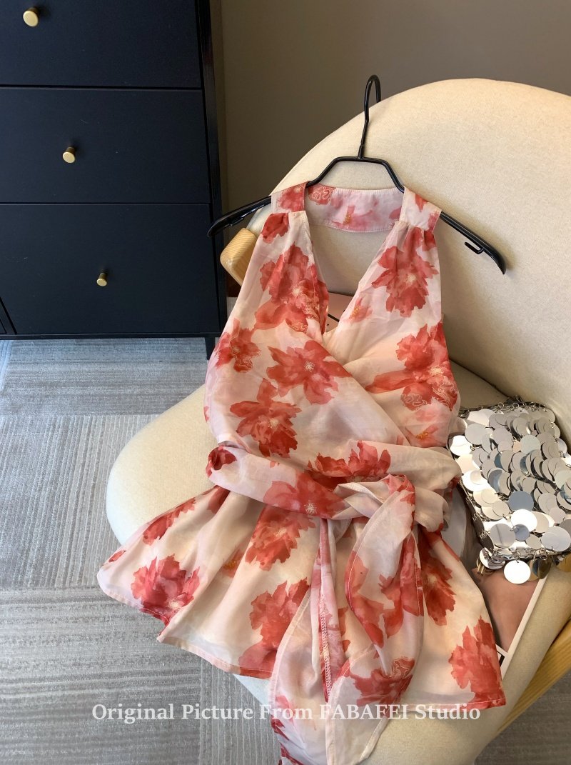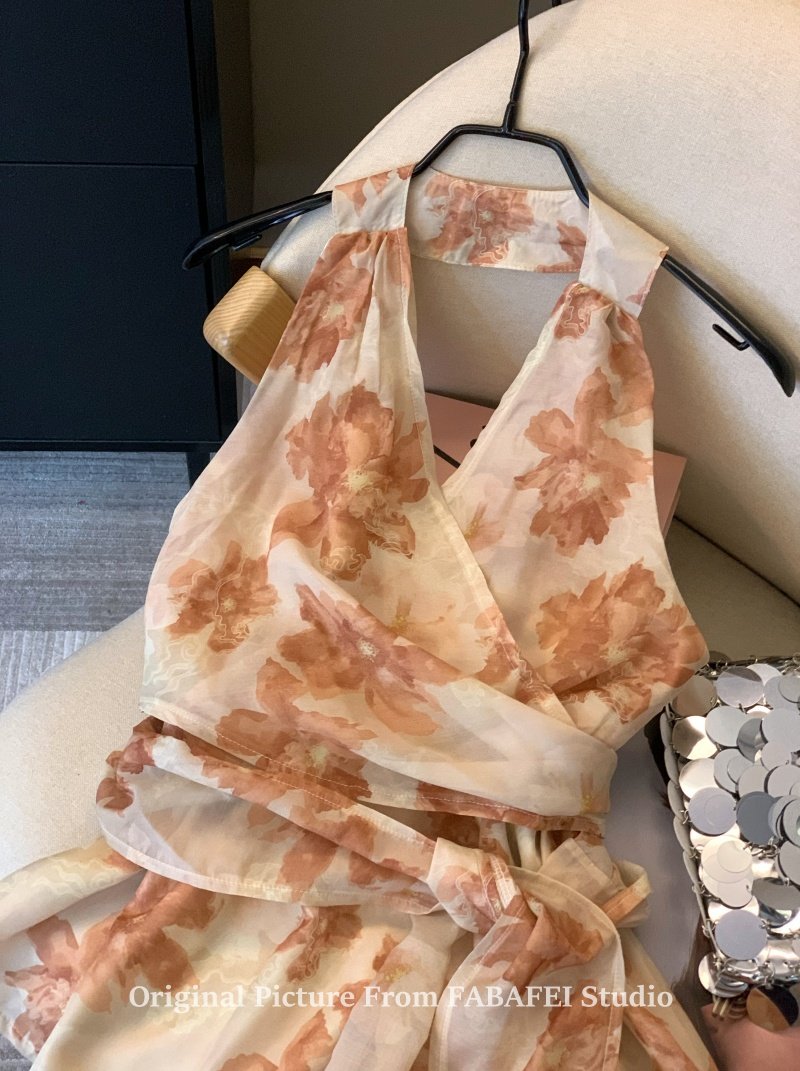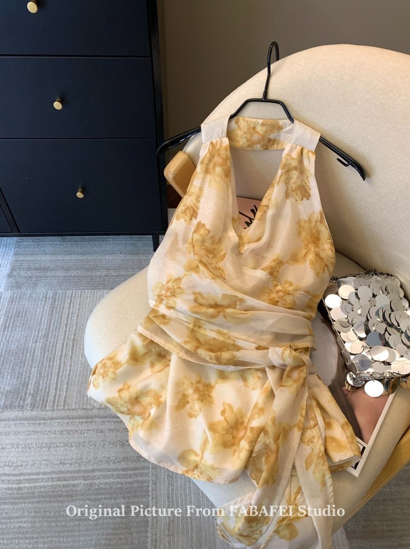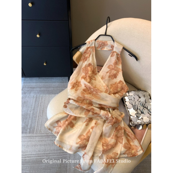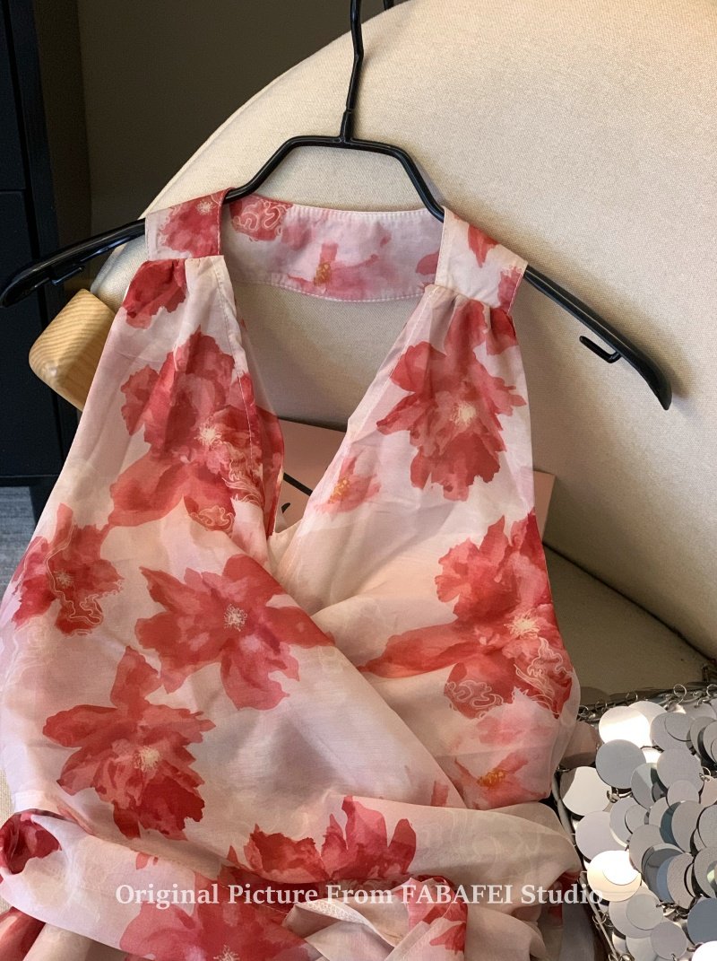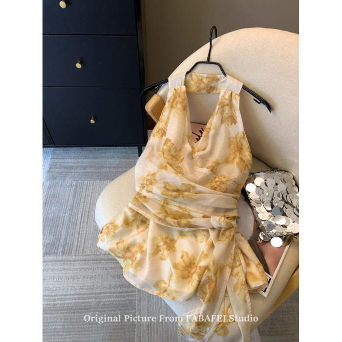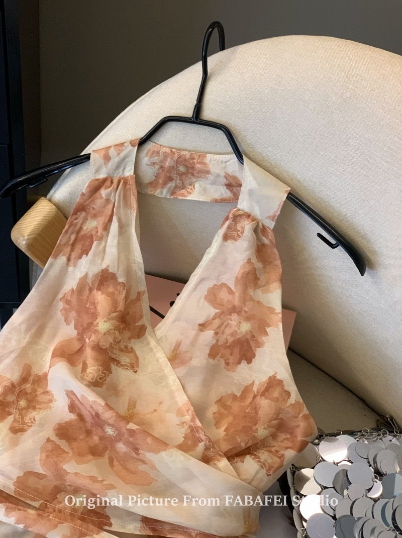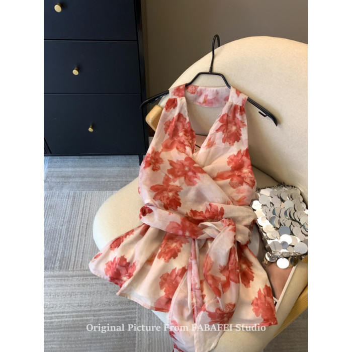 自畱爆款推薦~海邊度假碎花v領掛脖背心女夏季辣妹露背雪紡小上衣