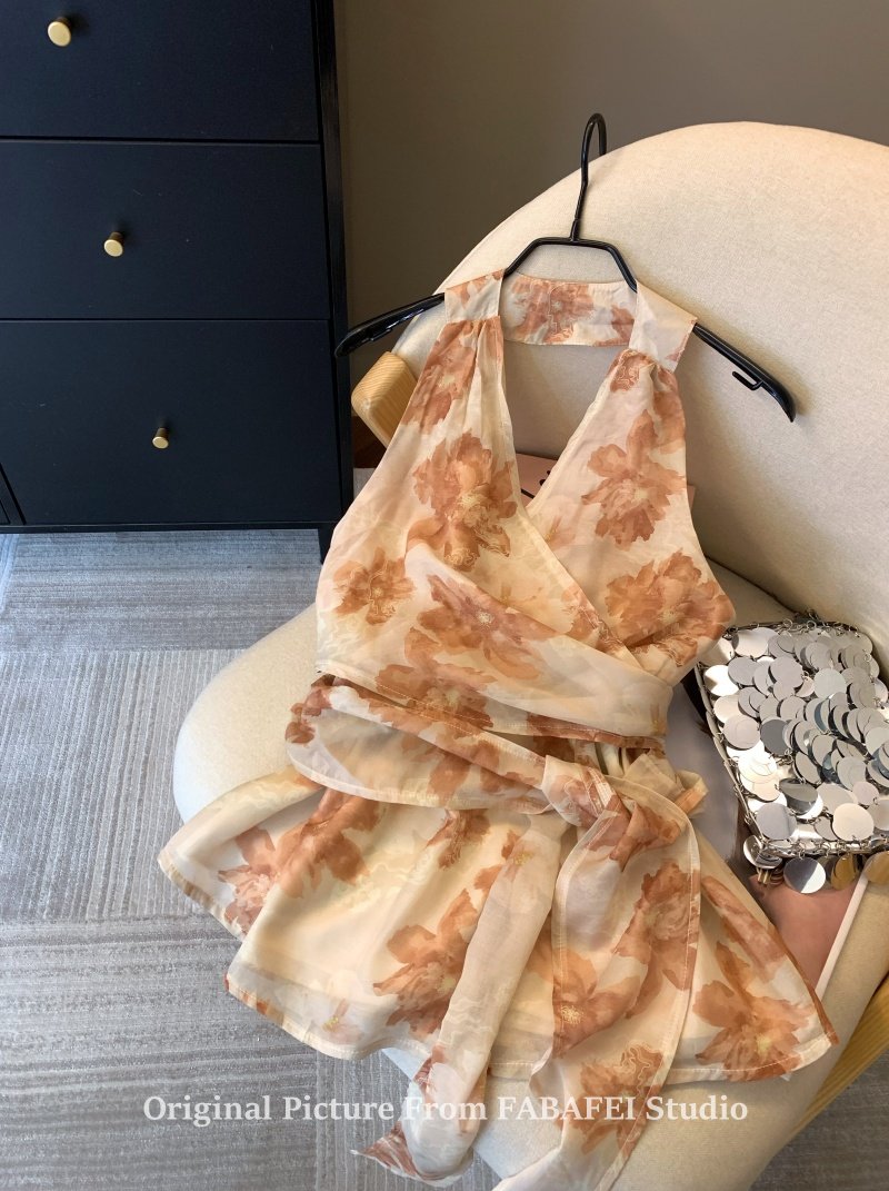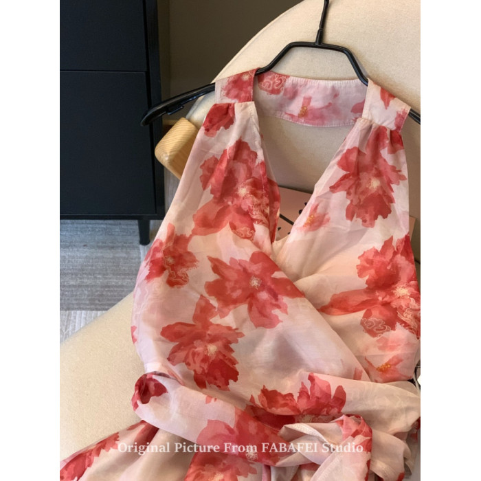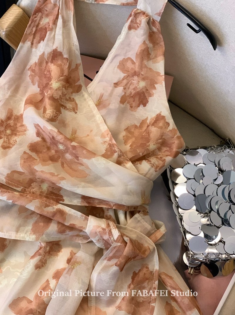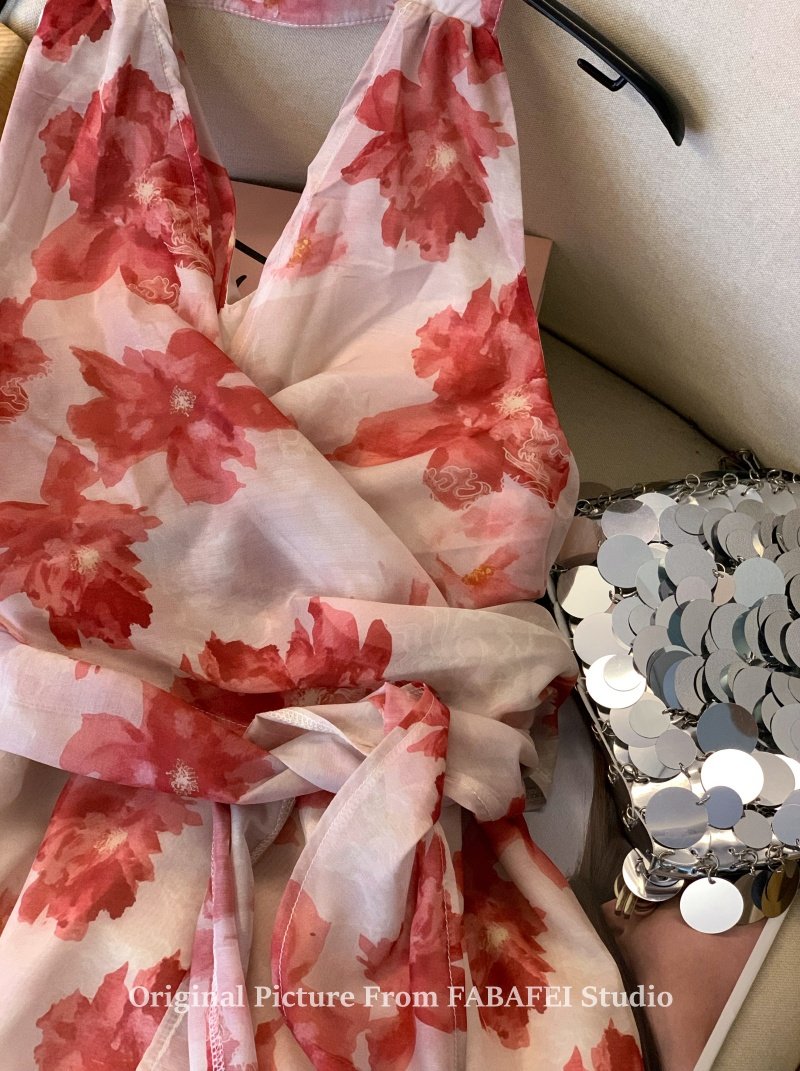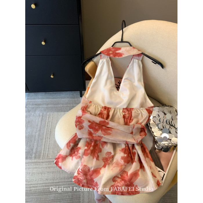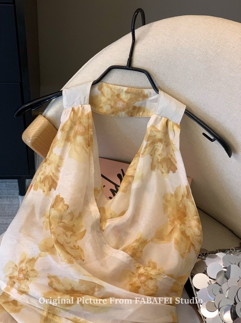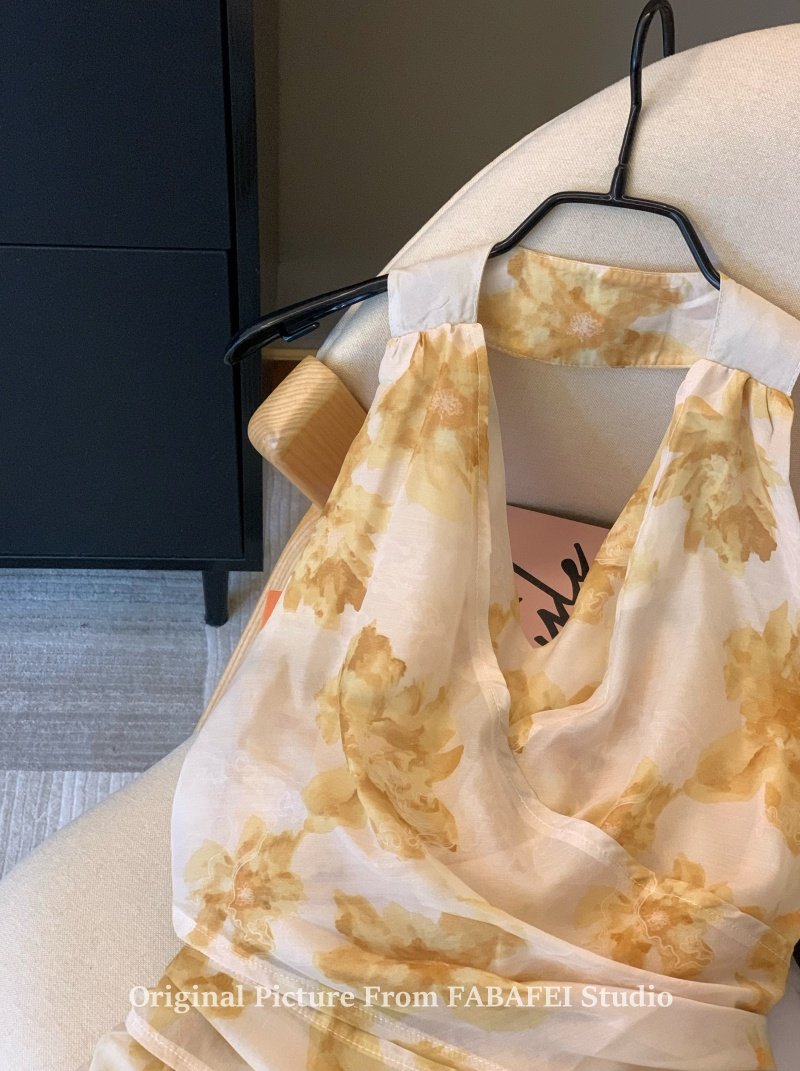 自畱爆款推薦~海邊度假碎花v領掛脖背心女夏季辣妹露背雪紡小上衣