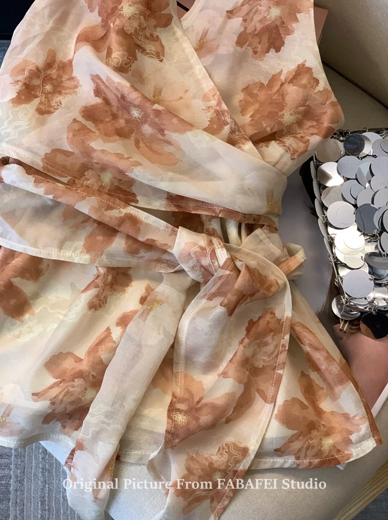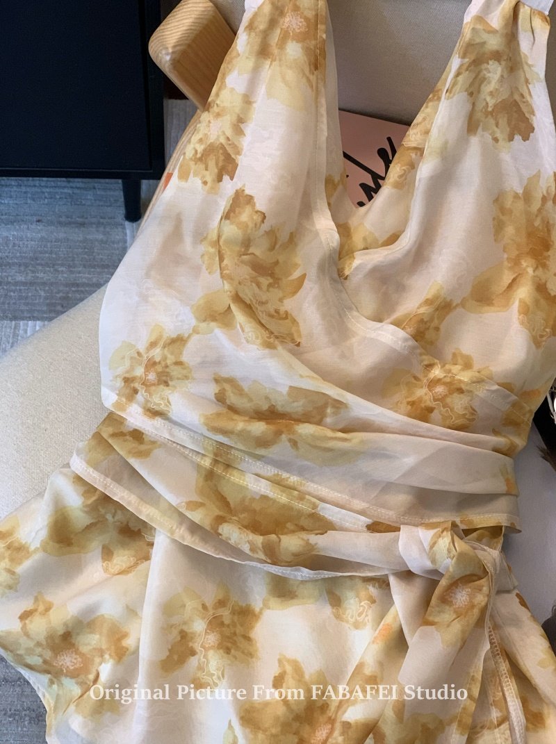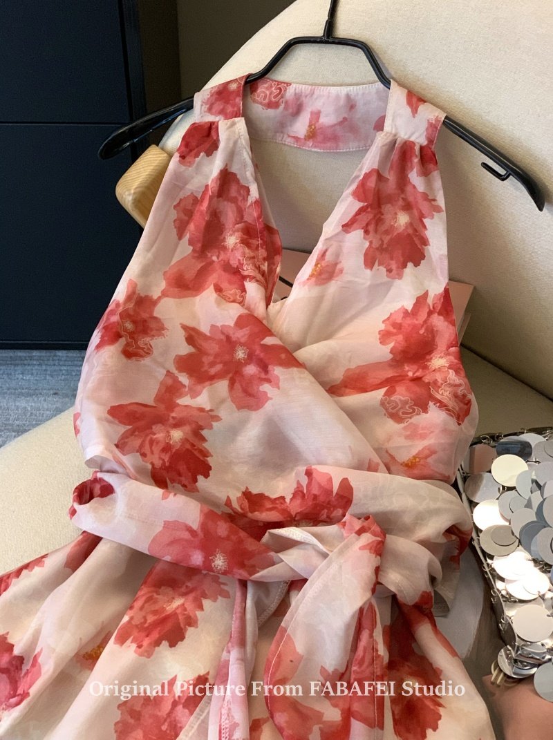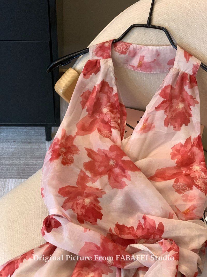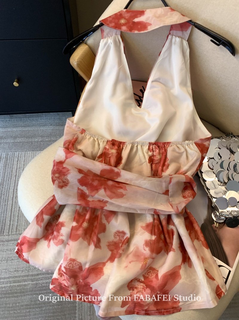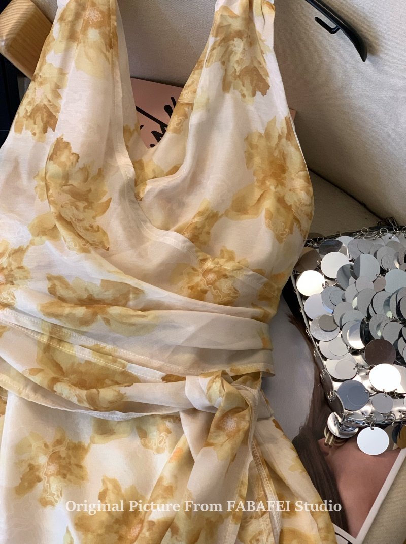 自畱爆款推薦~海邊度假碎花v領掛脖背心女夏季辣妹露背雪紡小上衣