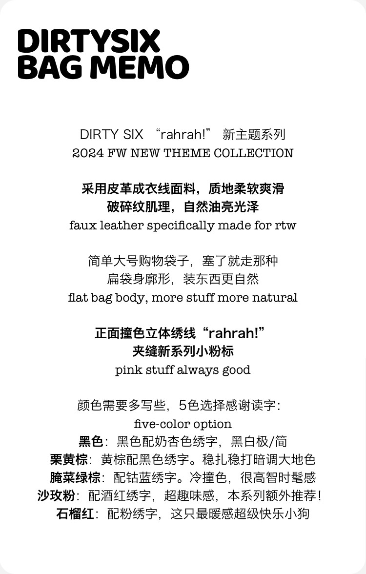 DirtySix “rahrah!”袋袋 5色 撞色綉線 原創大容量軟皮托特包