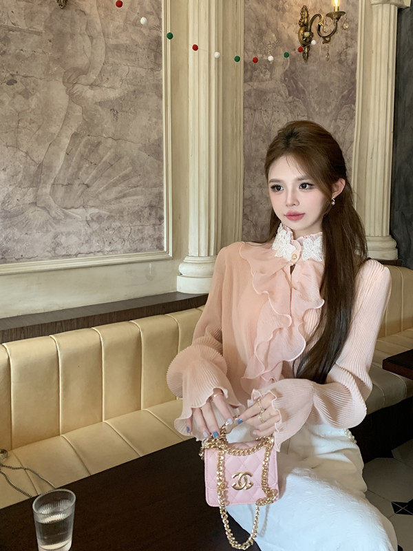 實拍實價~設計感荷葉邊拼接襯衫法式輕奢喇叭袖珠子立領雪紡上衣