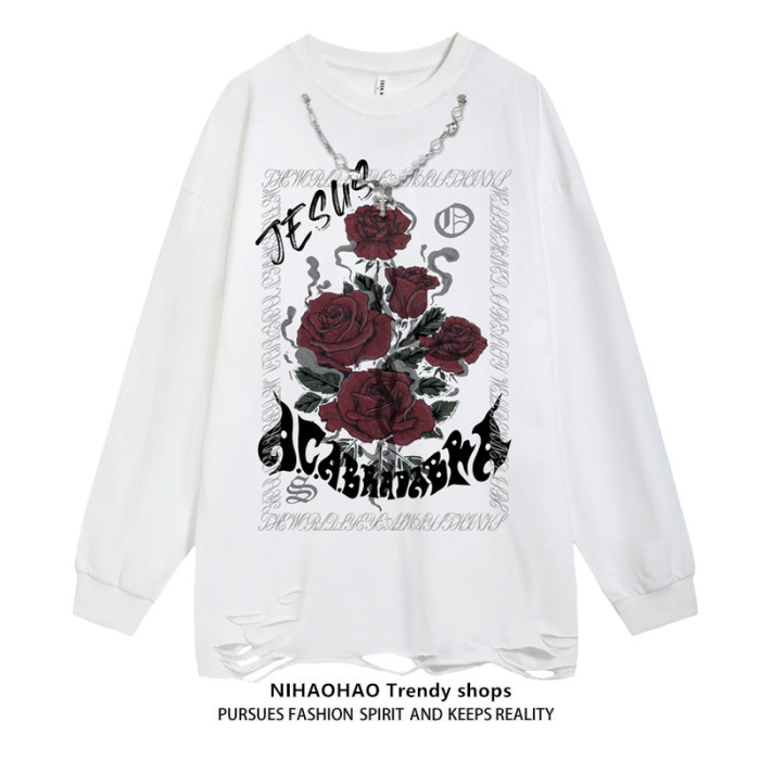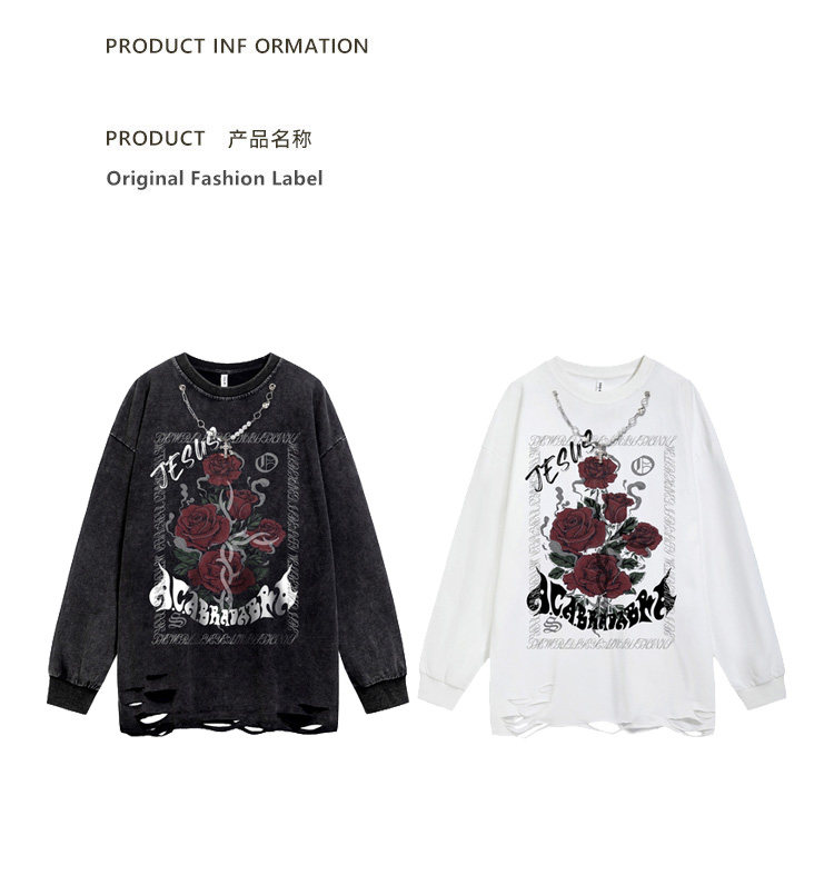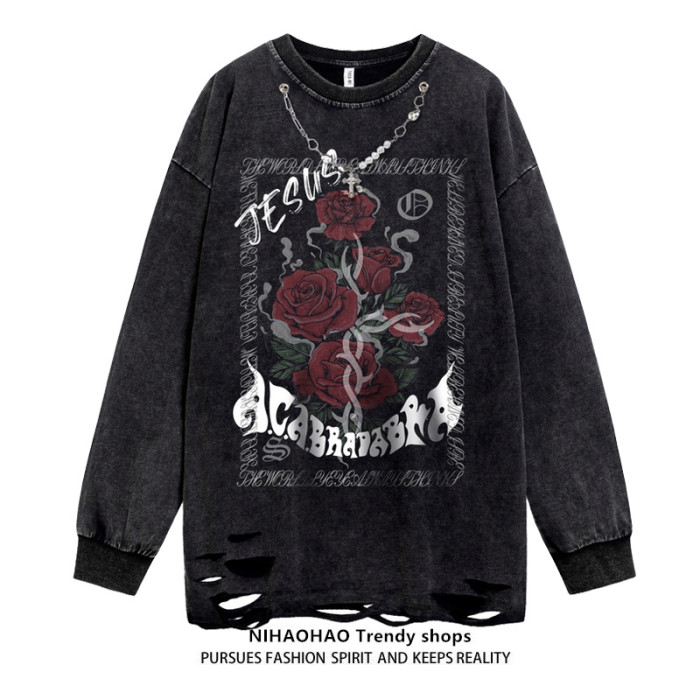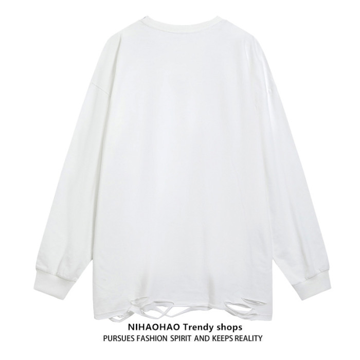 NIHAOHAO原創潮牌美式復古水洗做舊長袖T恤破洞小衆男女BF風衛衣