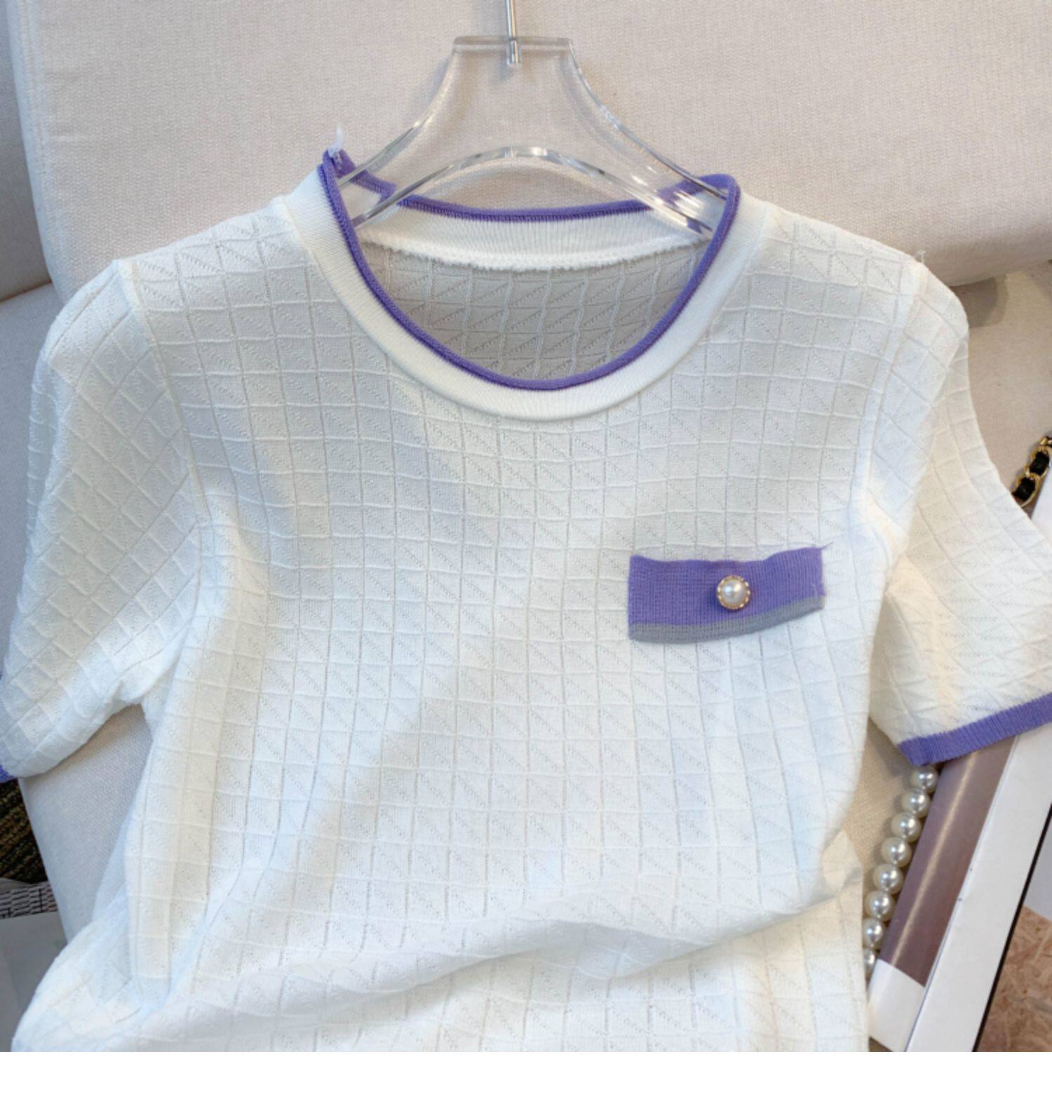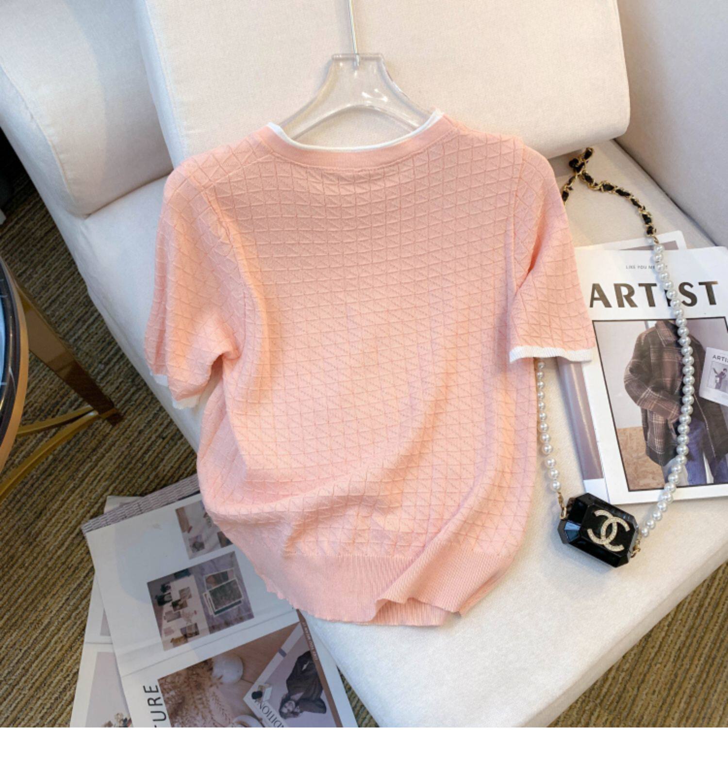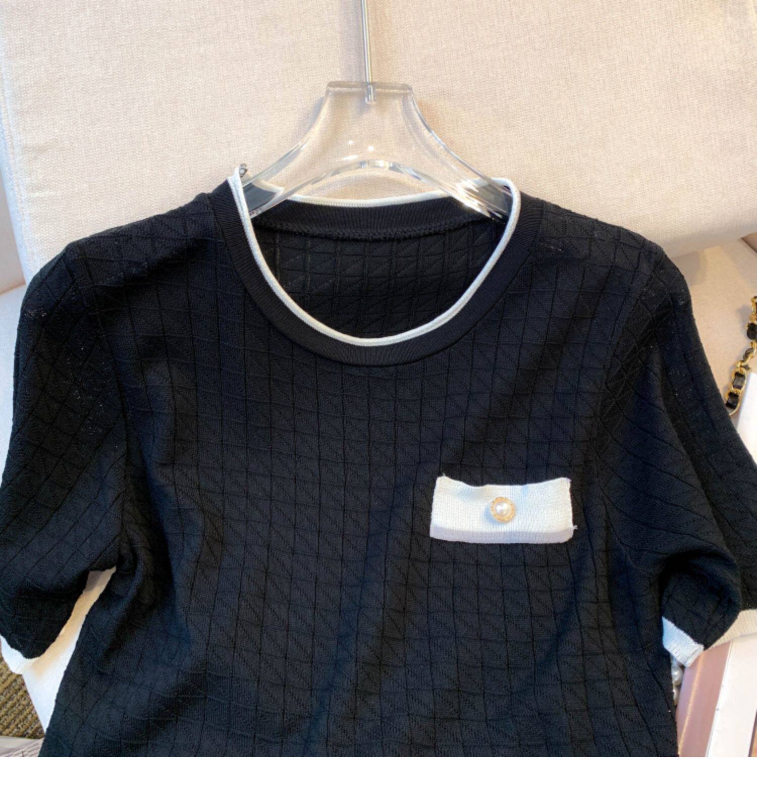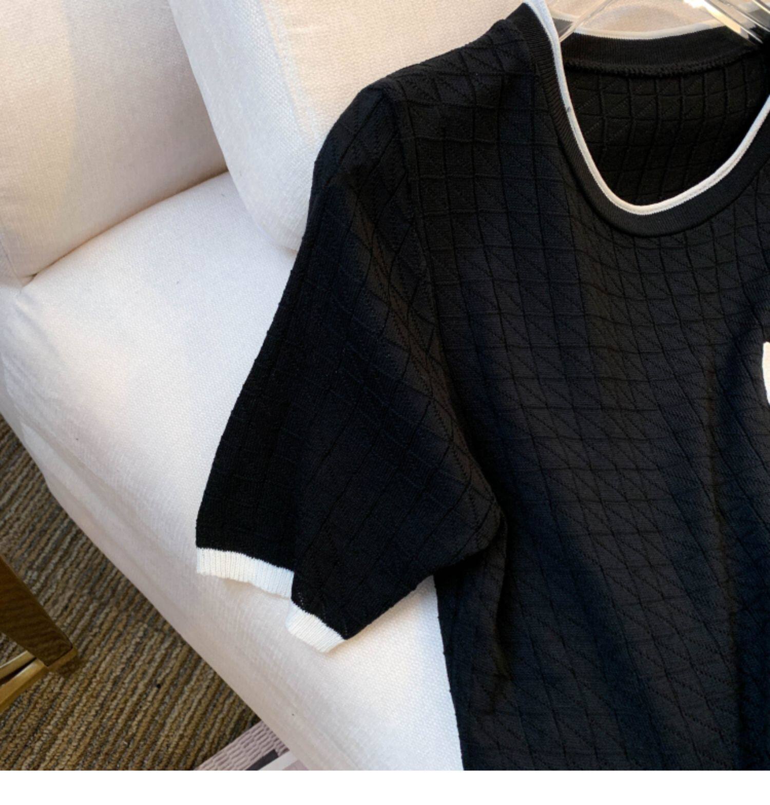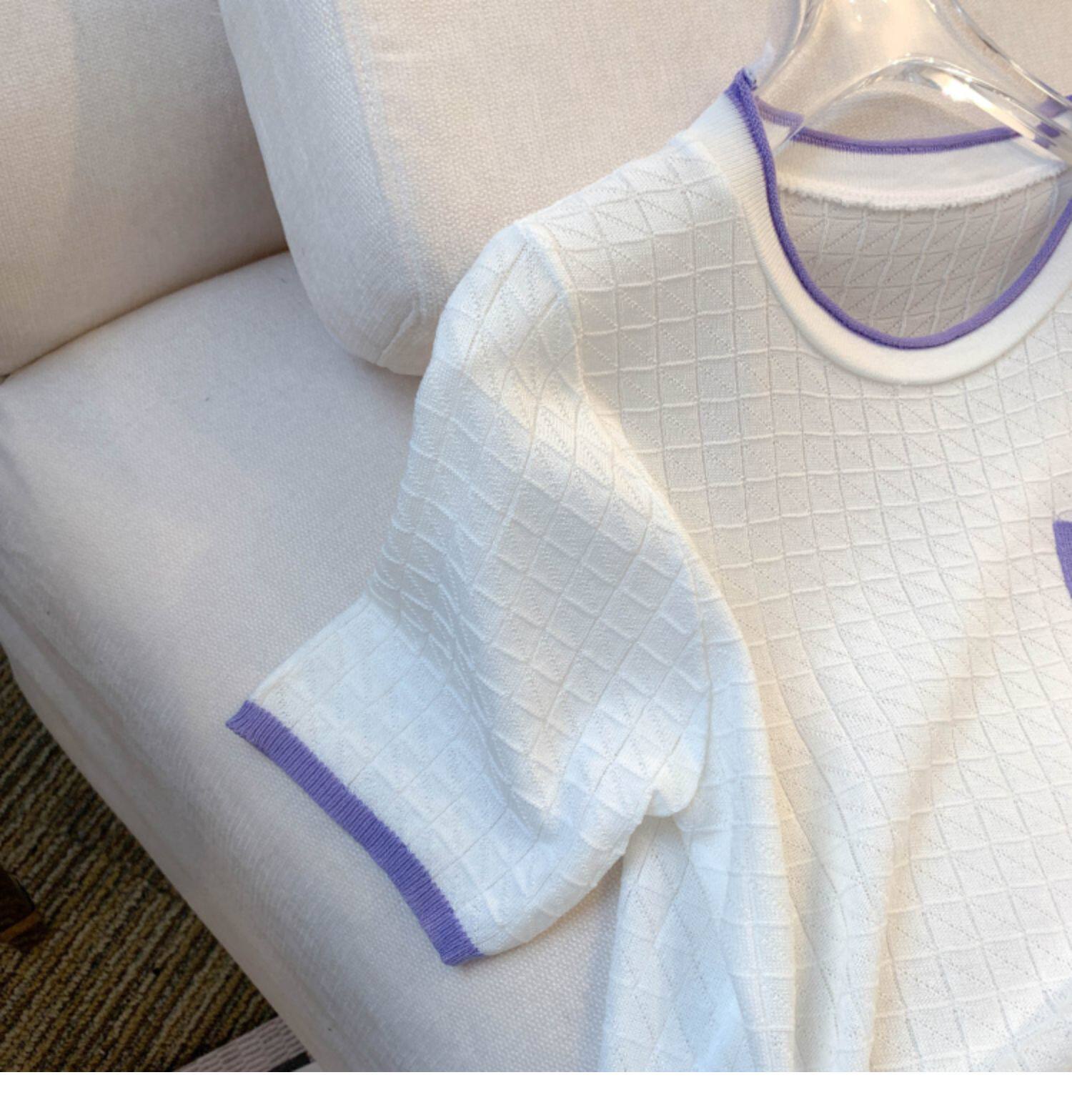 專櫃撤廻剪標設計感小香風圓領短袖T恤女春夏新款冰絲針織短上衣