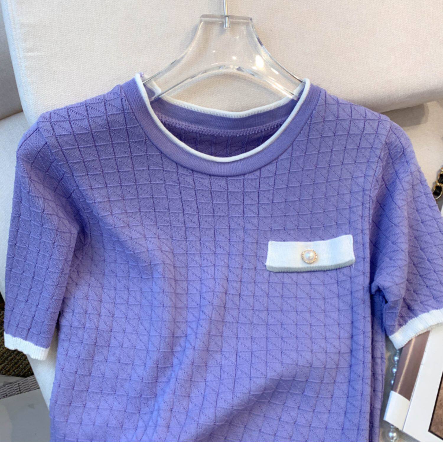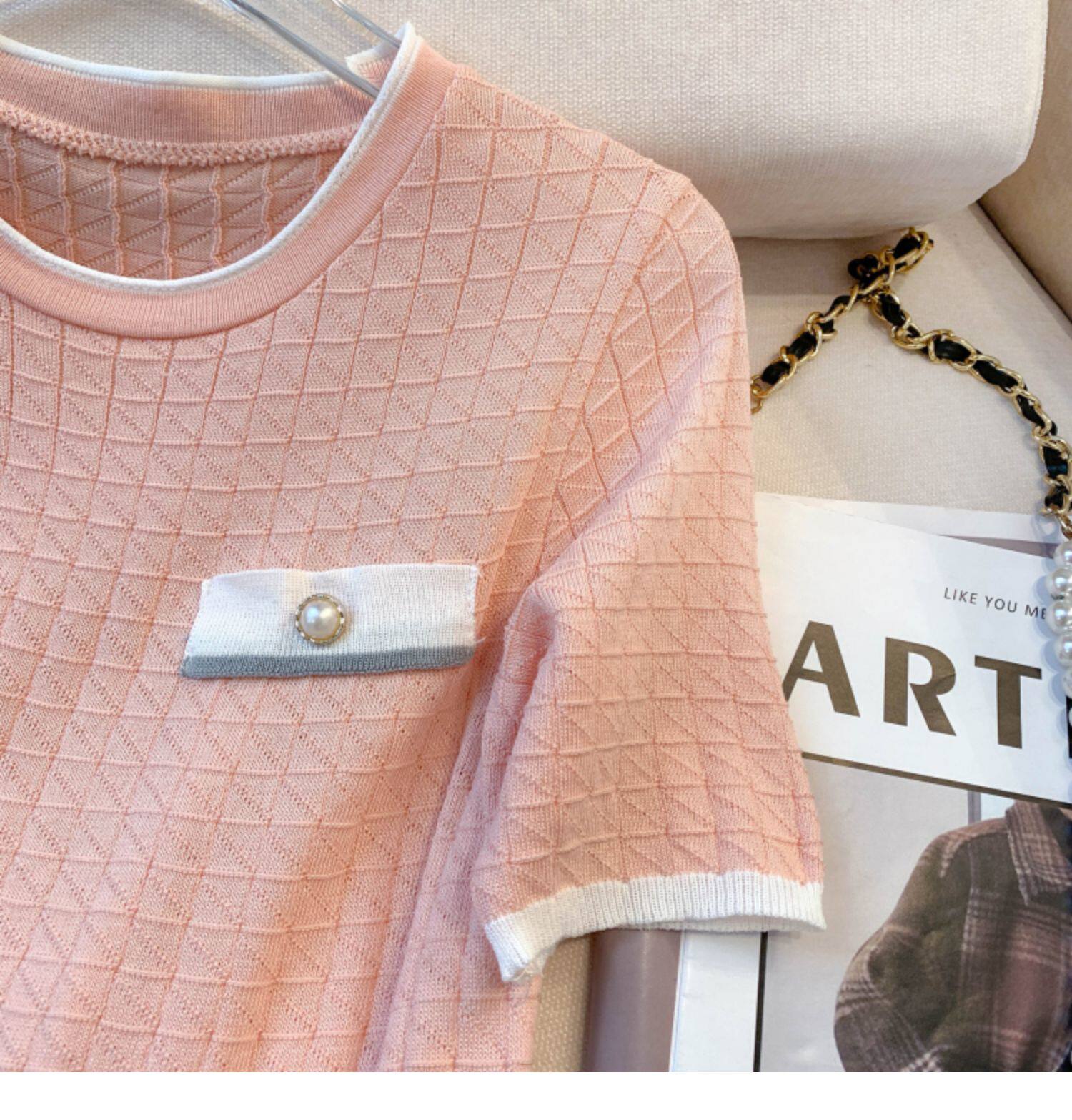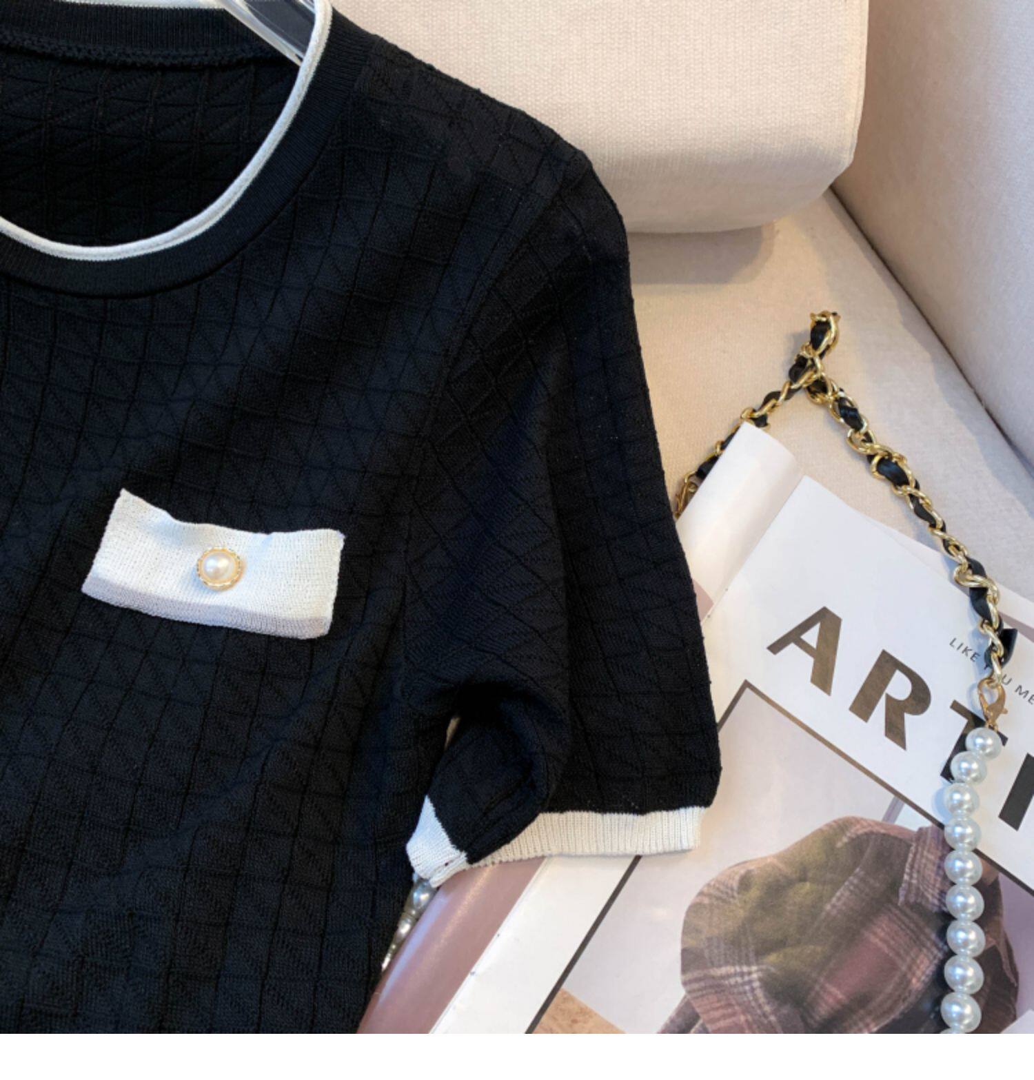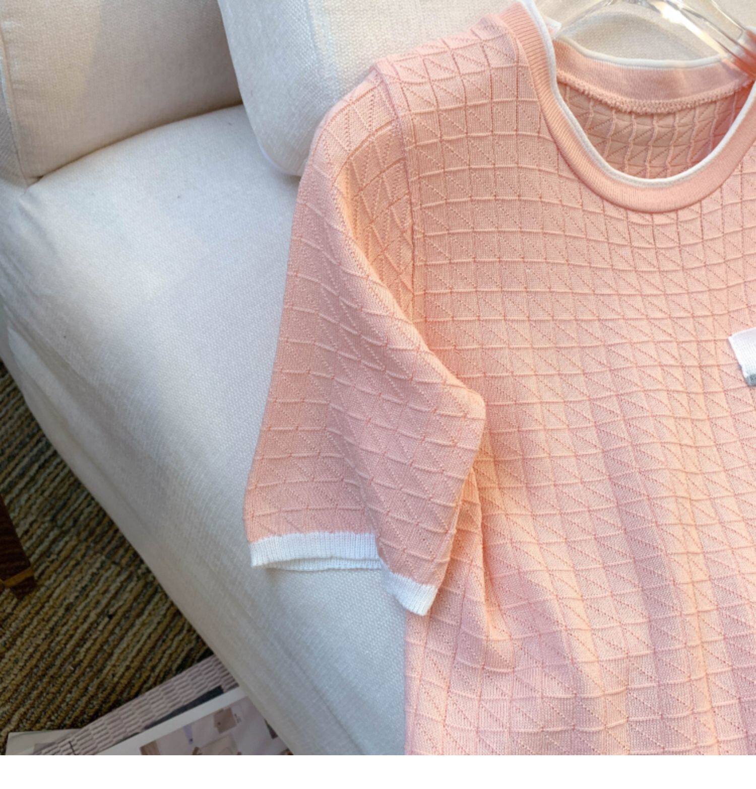 專櫃撤廻剪標設計感小香風圓領短袖T恤女春夏新款冰絲針織短上衣
