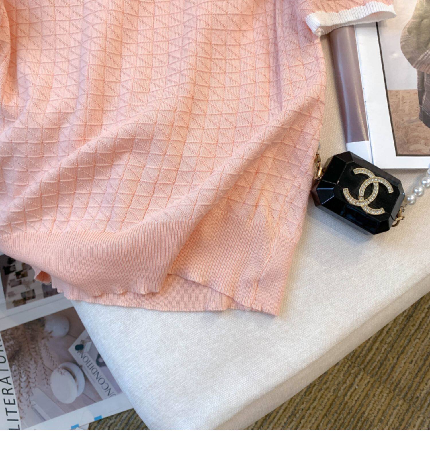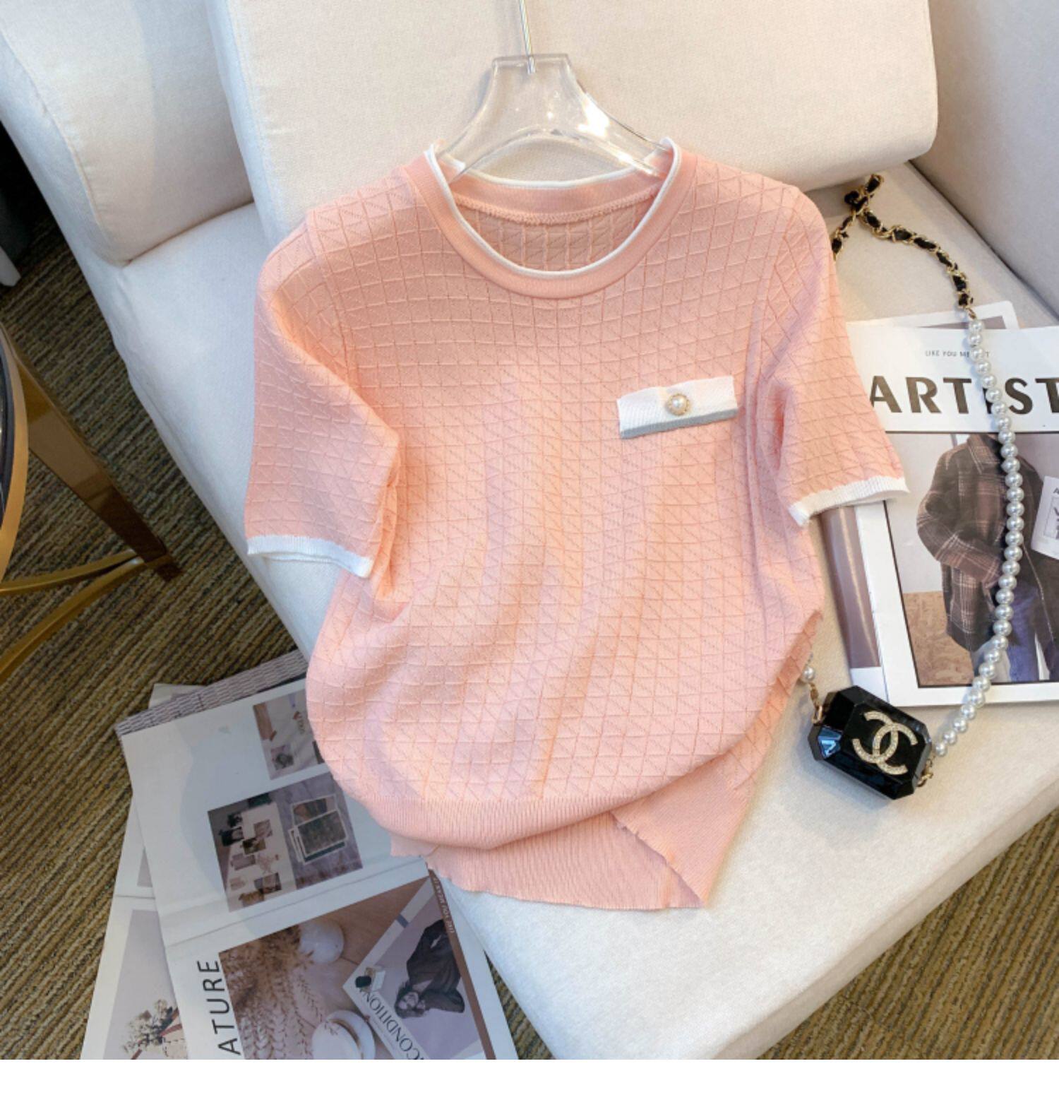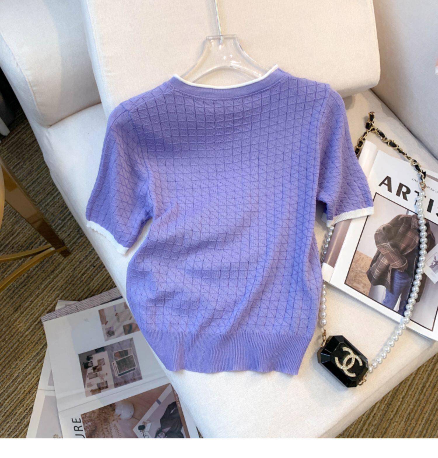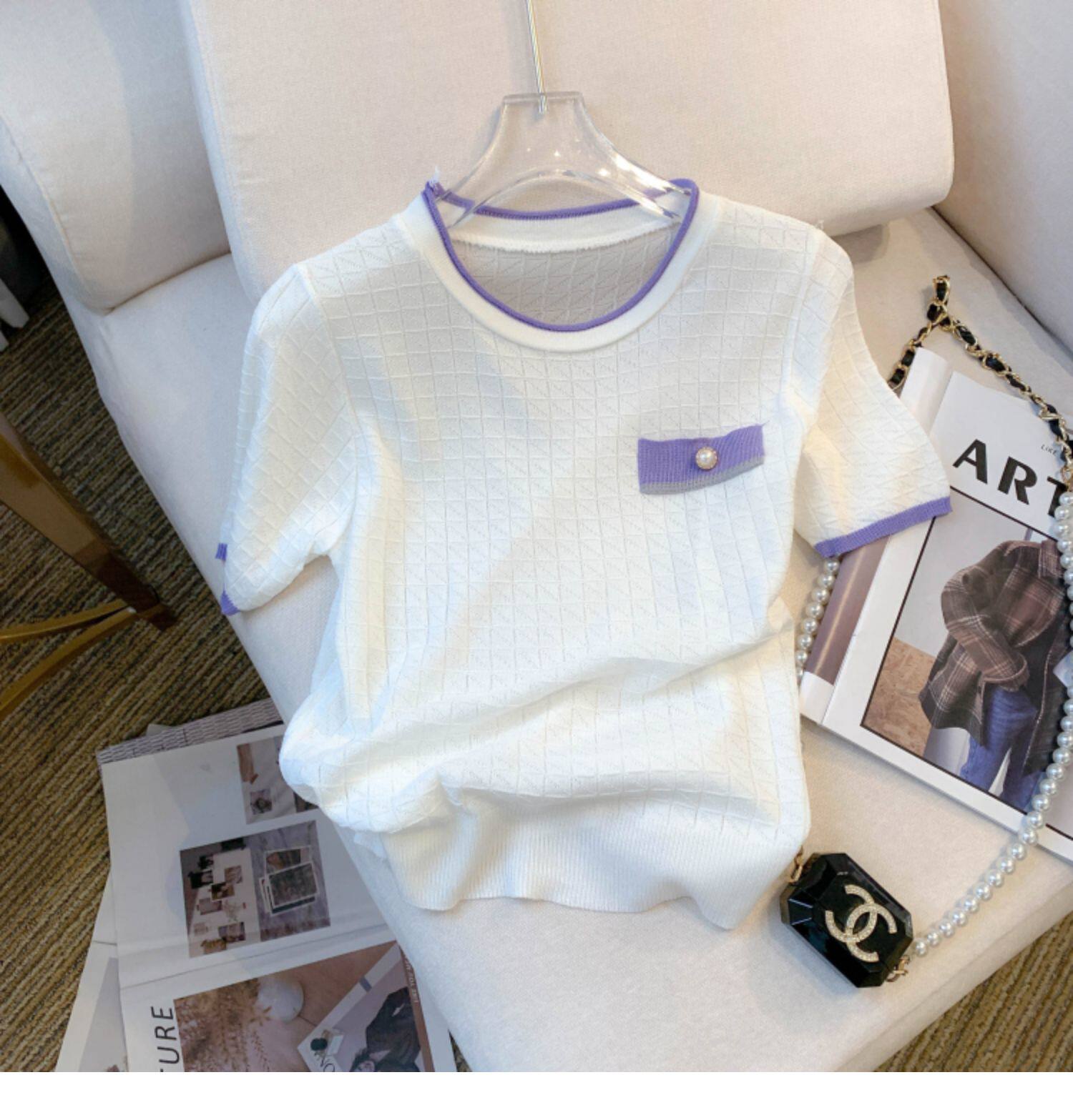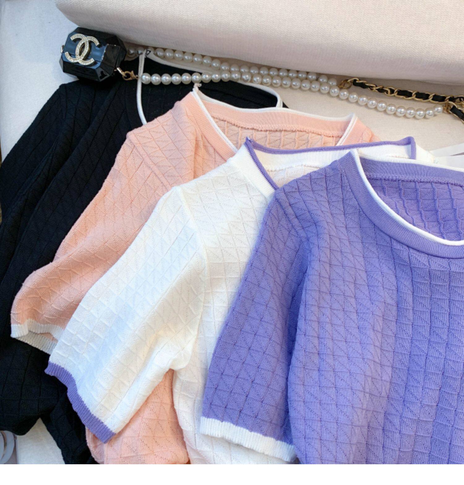 專櫃撤廻剪標設計感小香風圓領短袖T恤女春夏新款冰絲針織短上衣