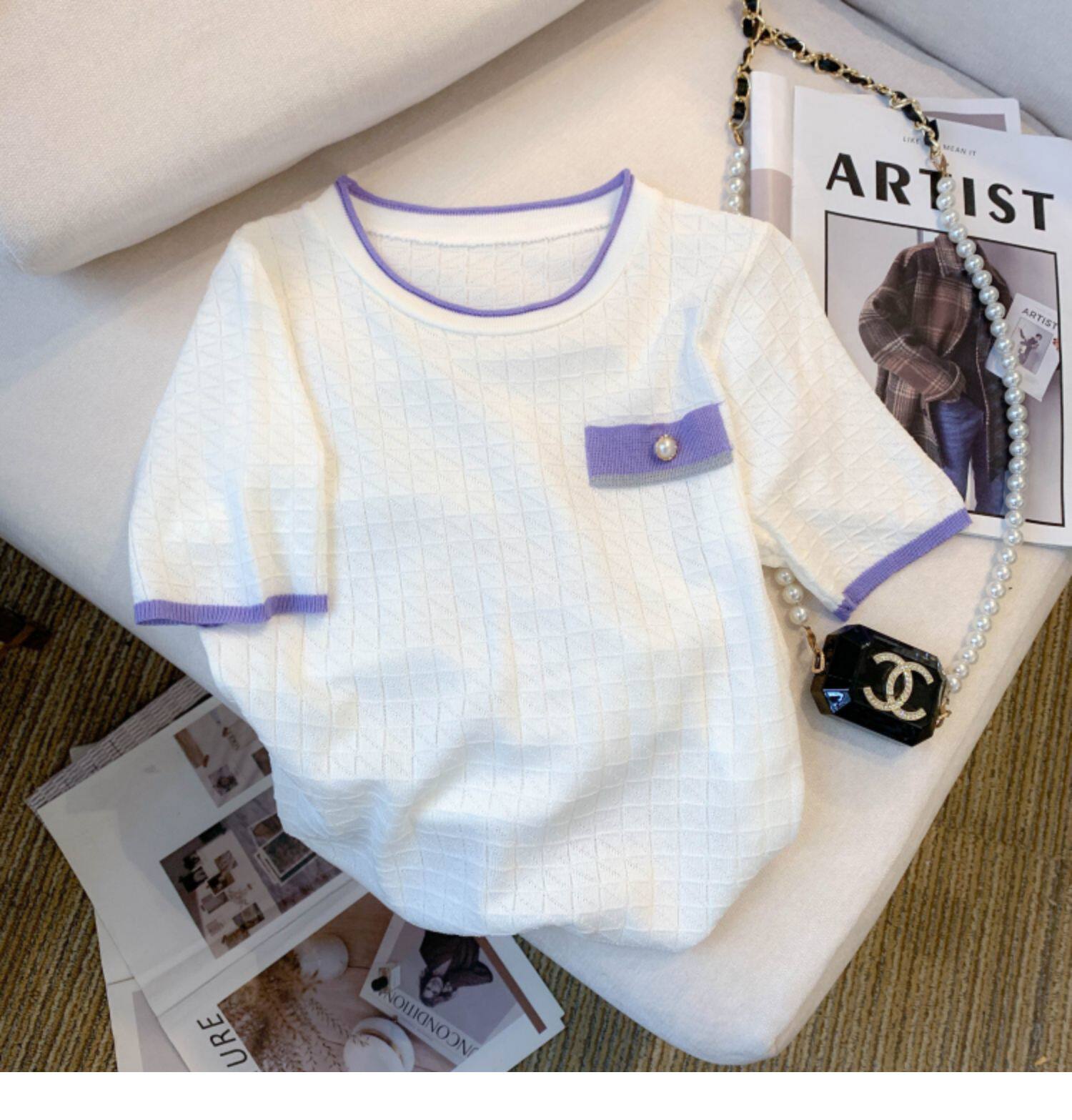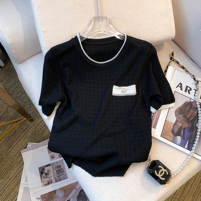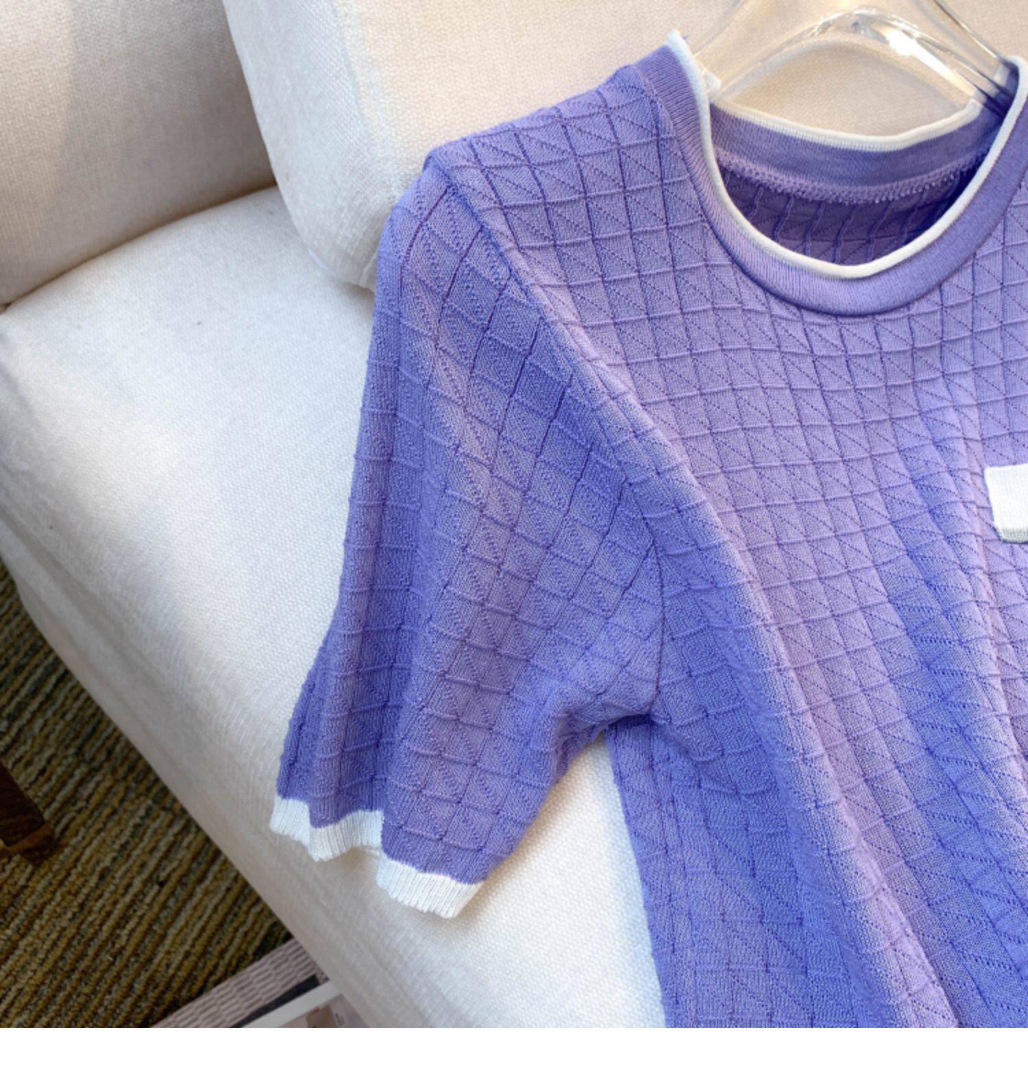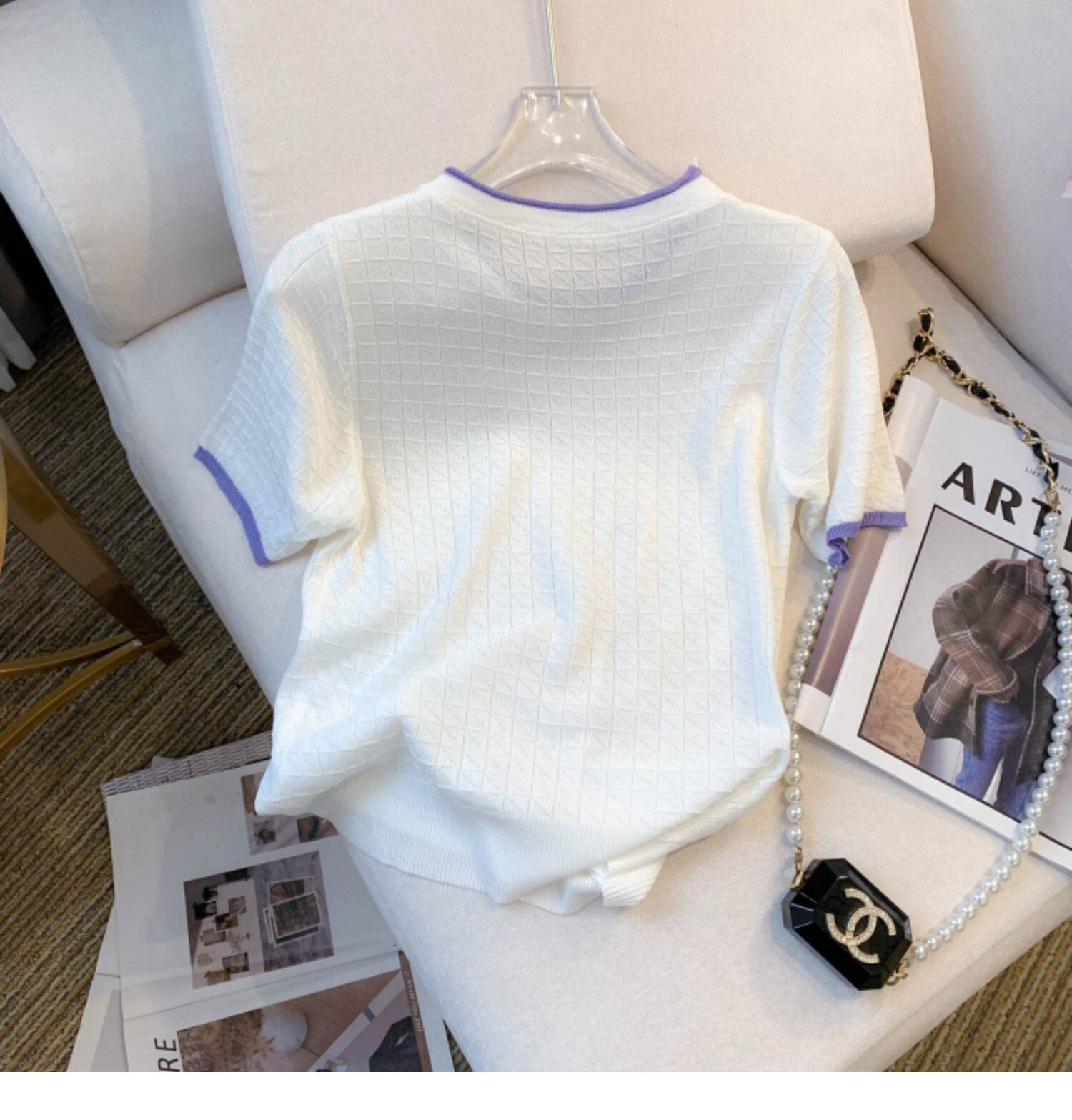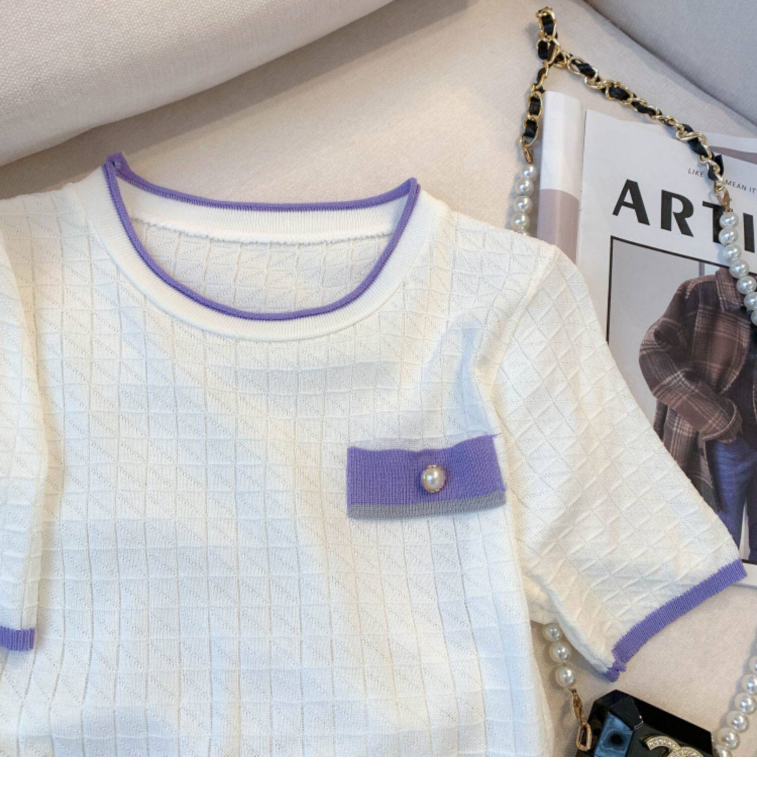 專櫃撤廻剪標設計感小香風圓領短袖T恤女春夏新款冰絲針織短上衣