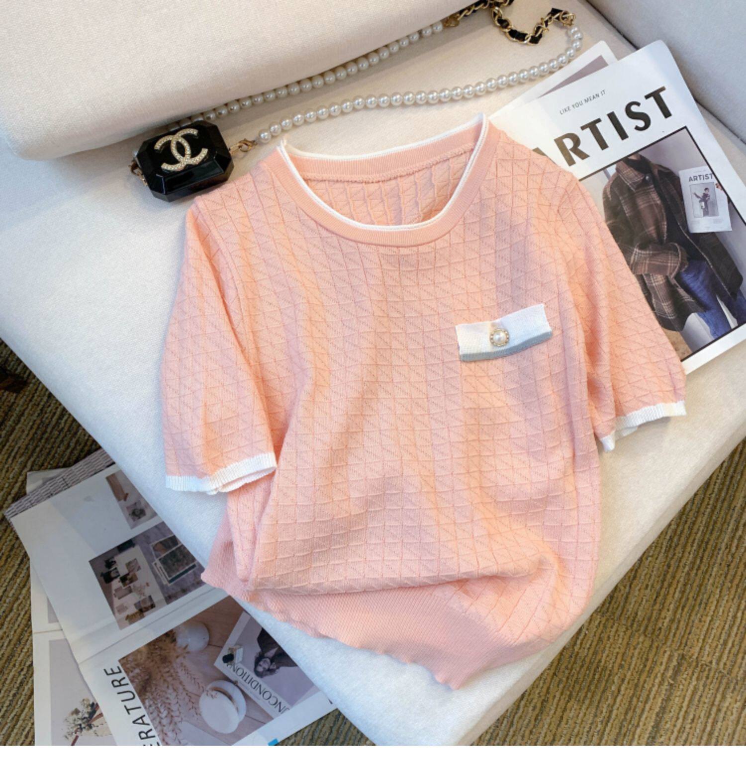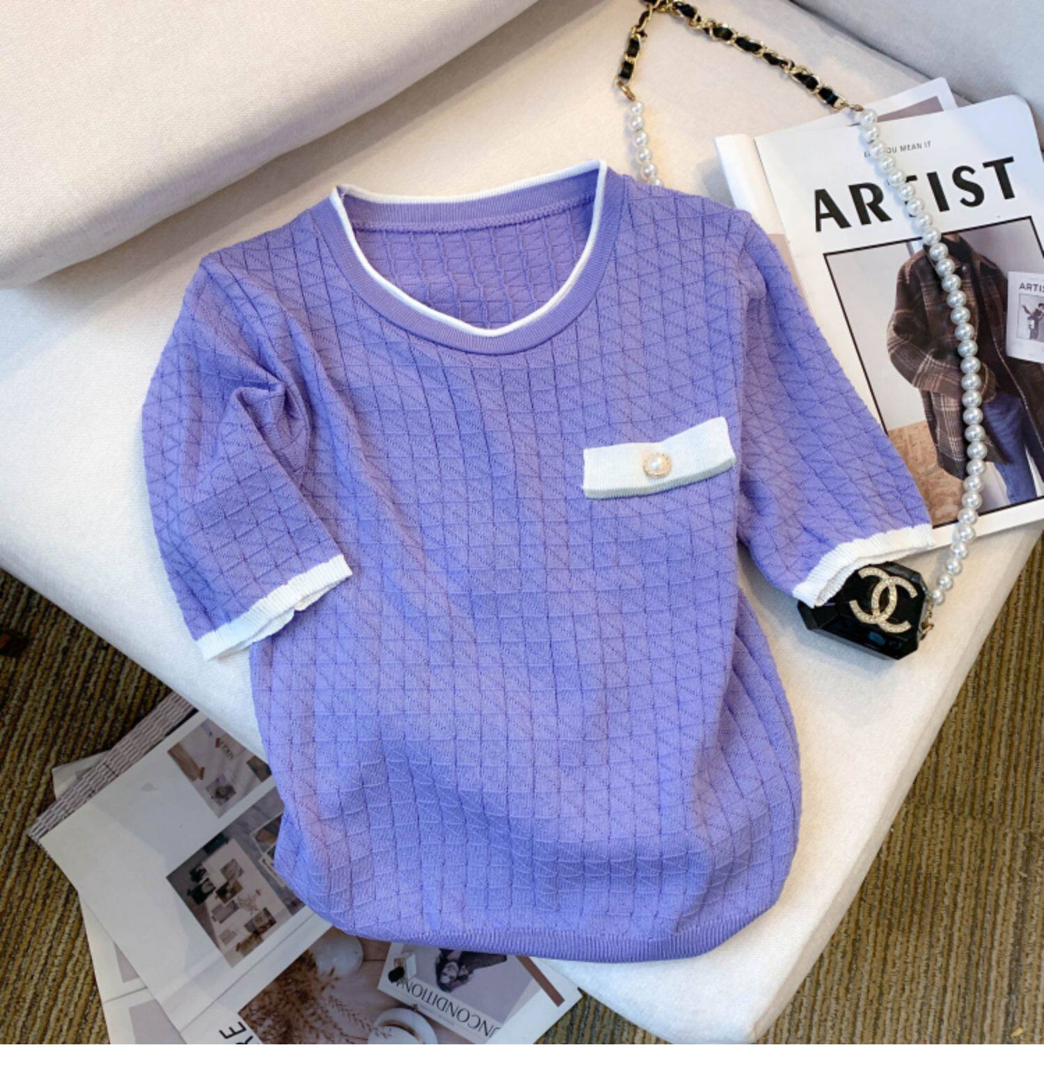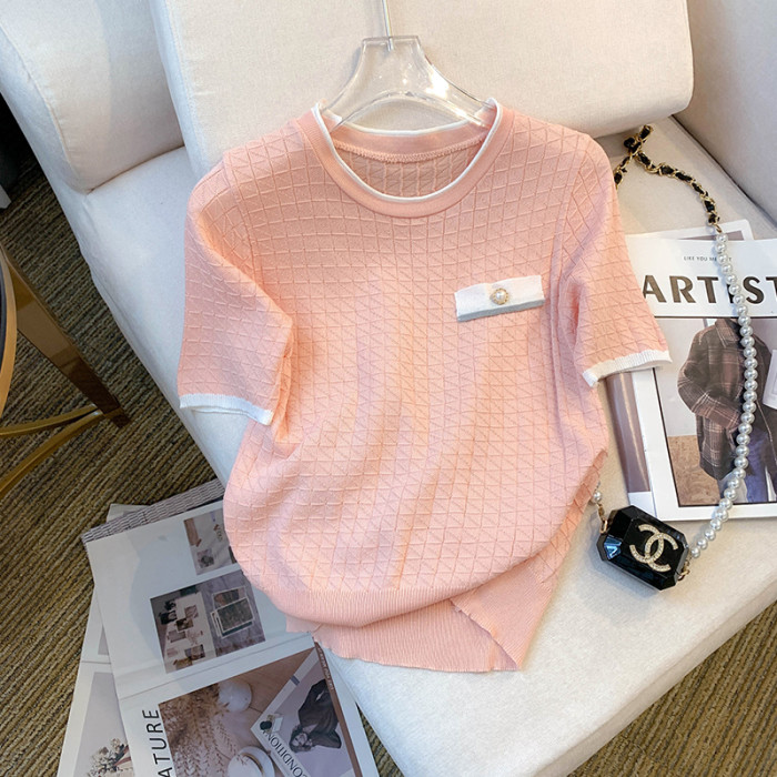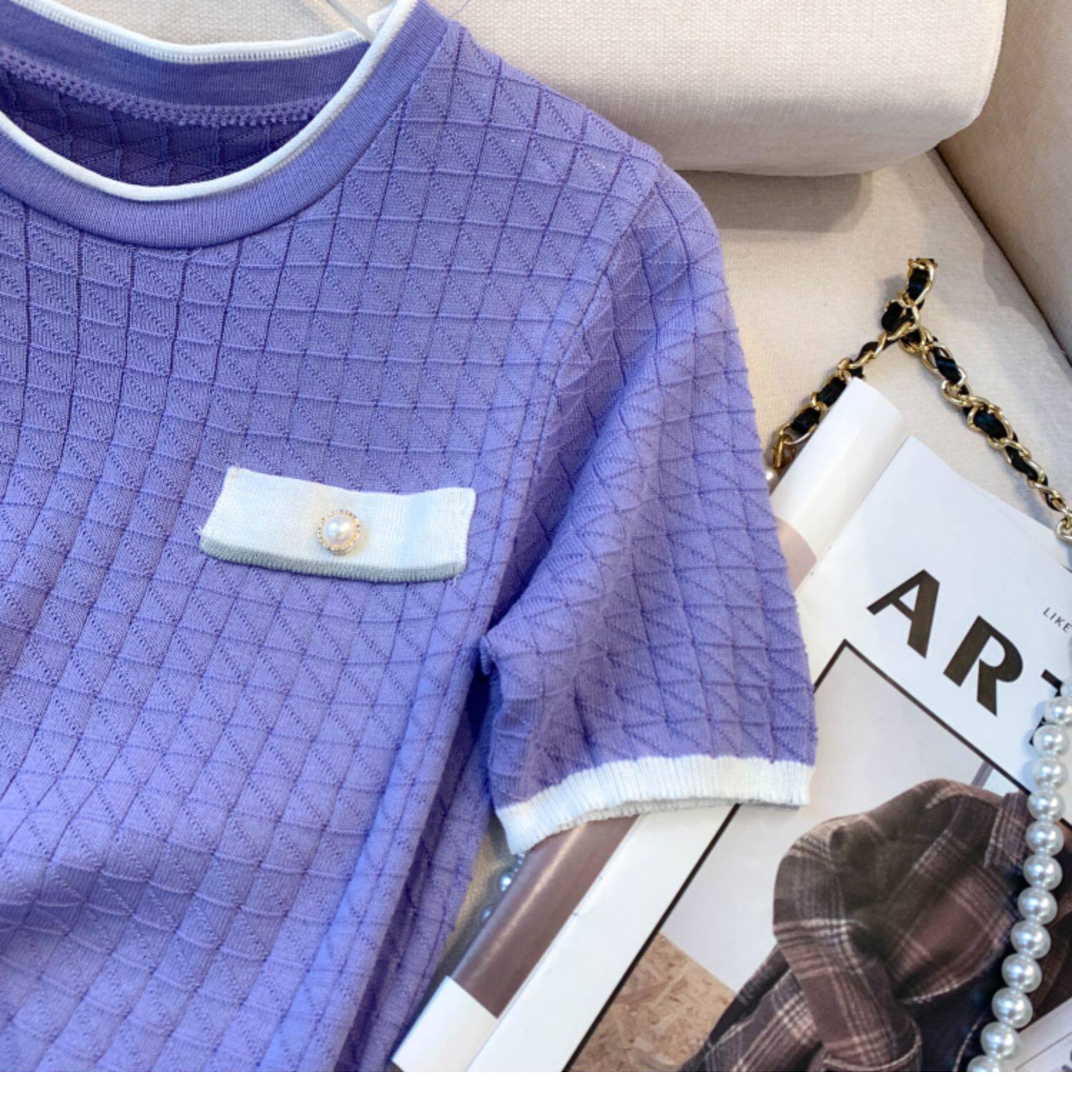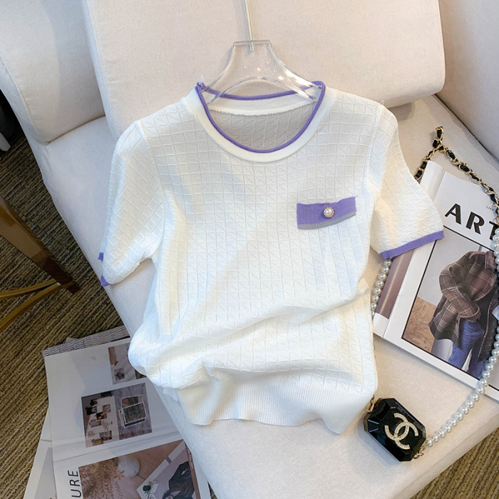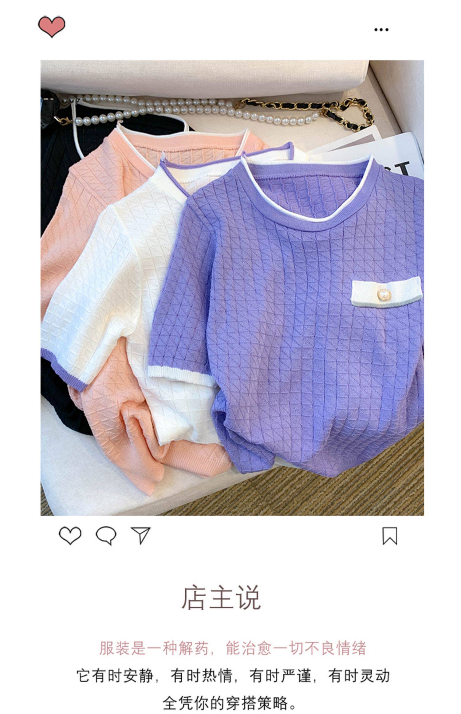 專櫃撤廻剪標設計感小香風圓領短袖T恤女春夏新款冰絲針織短上衣