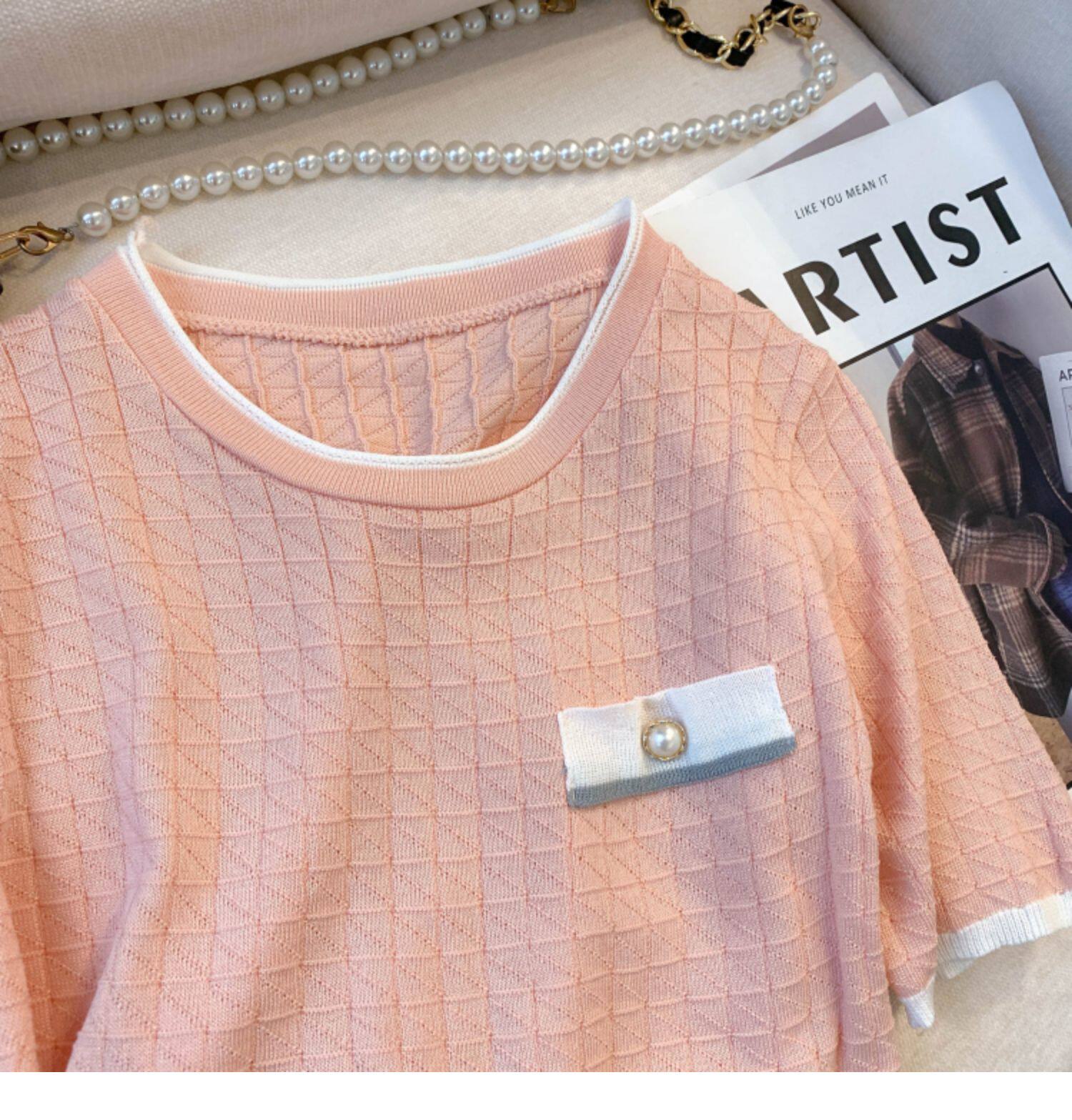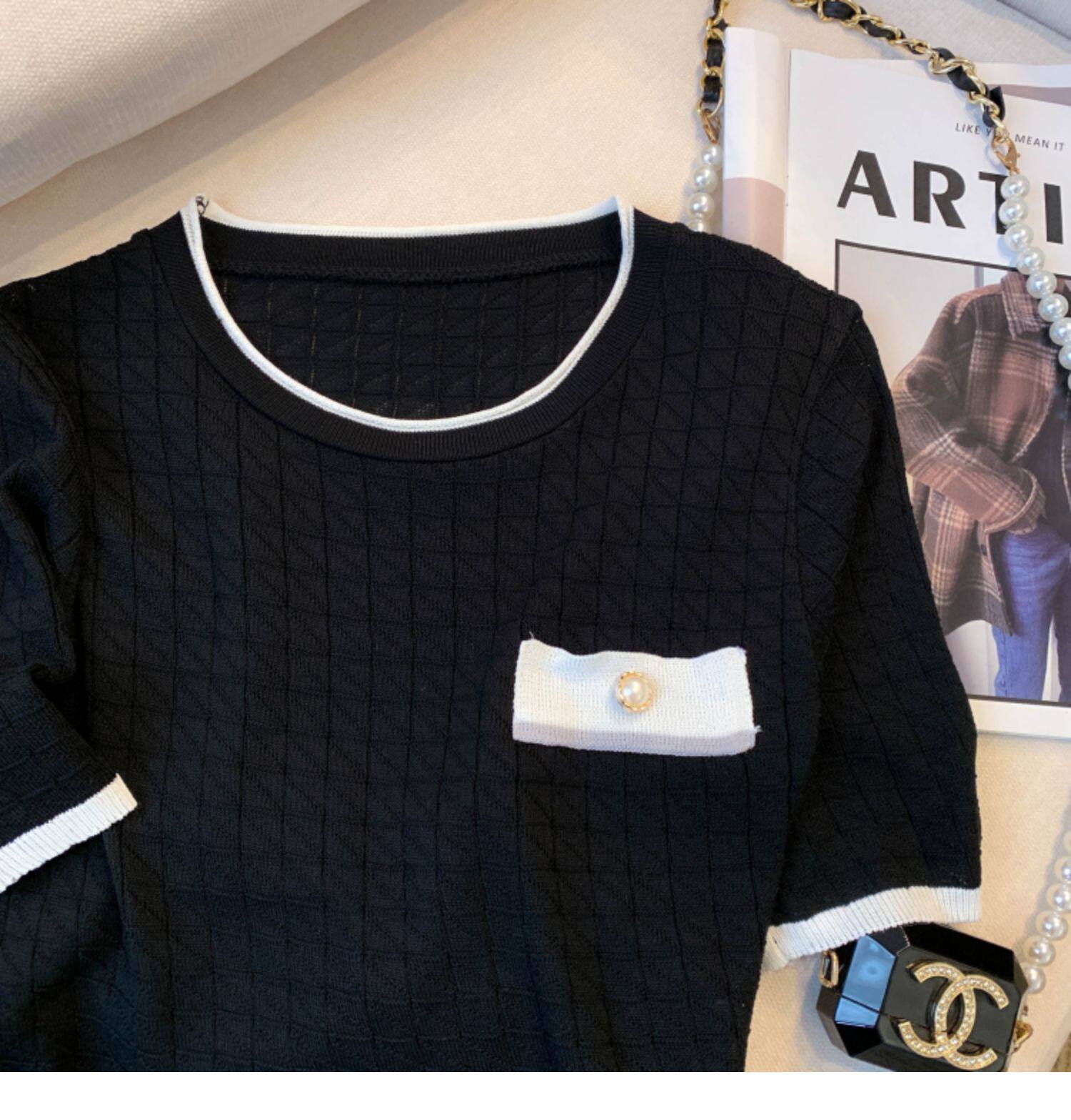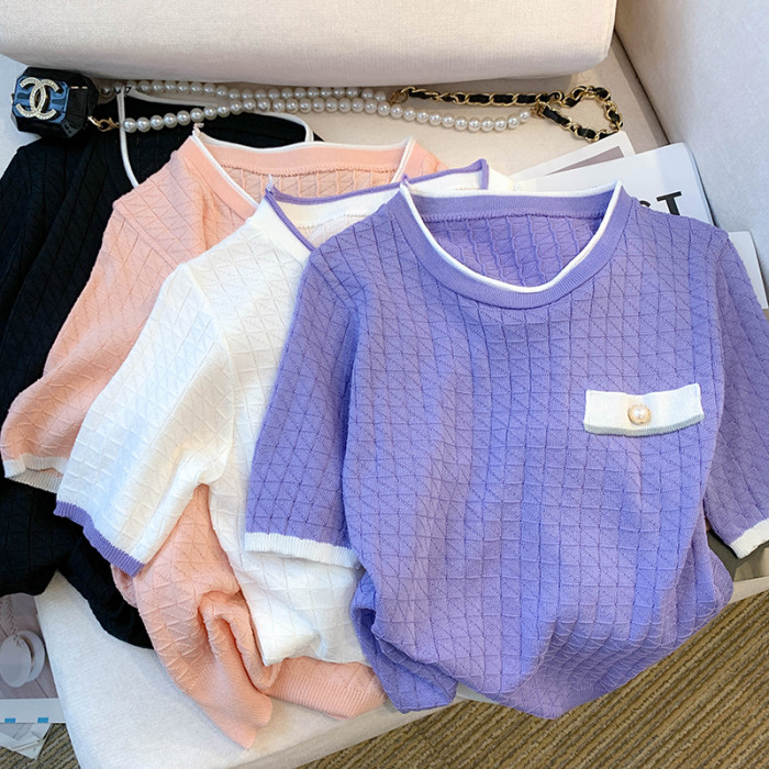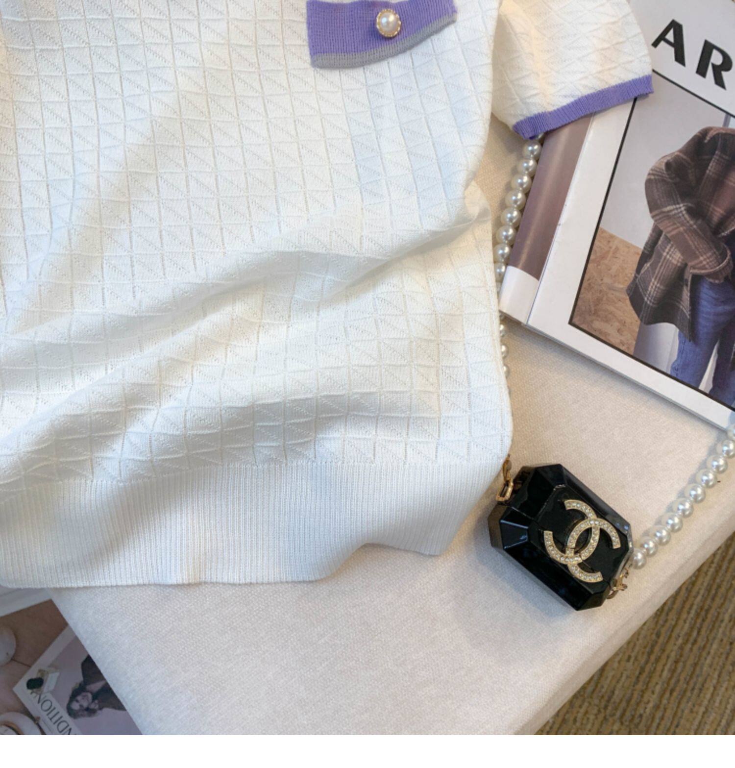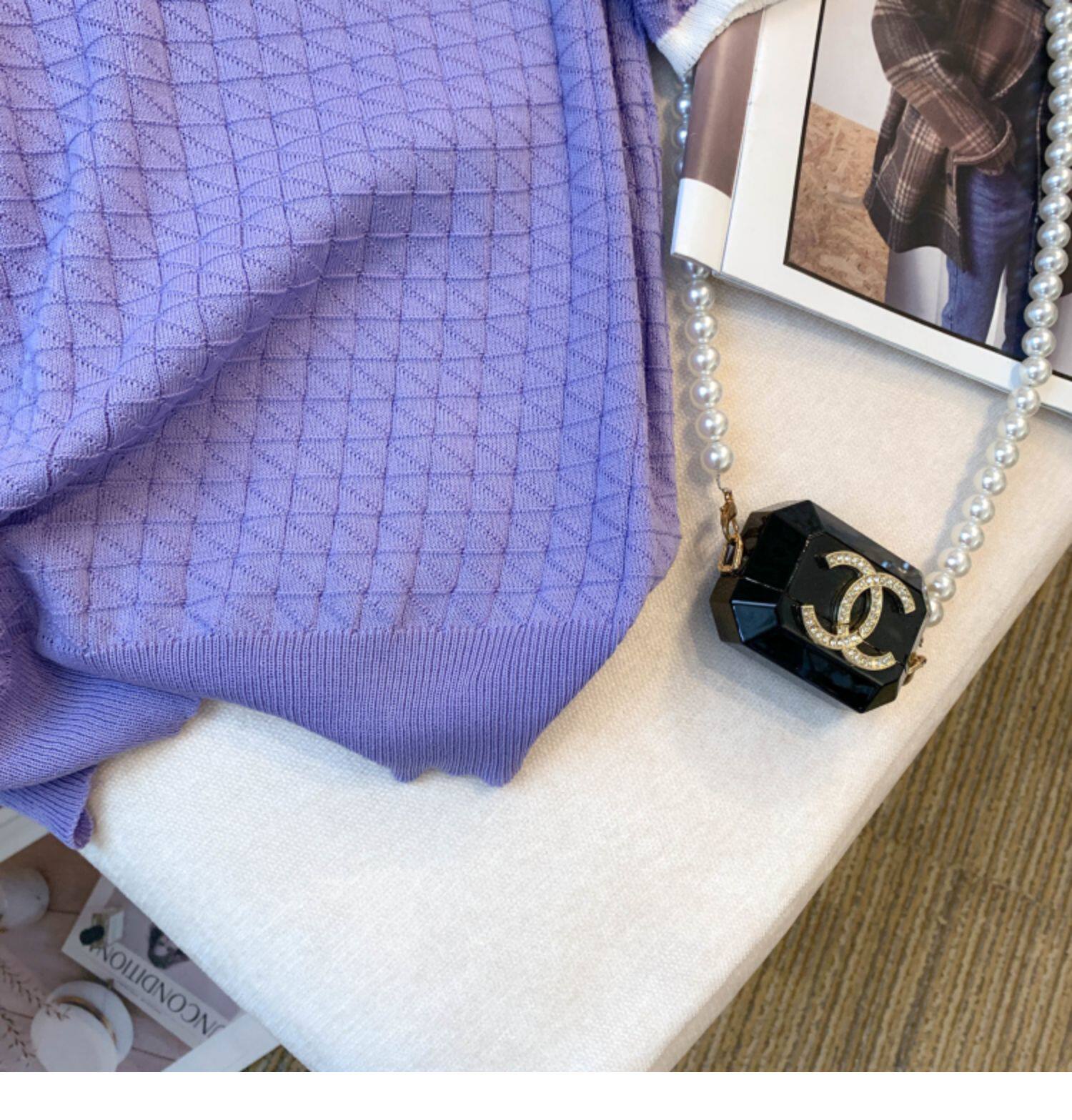 專櫃撤廻剪標設計感小香風圓領短袖T恤女春夏新款冰絲針織短上衣
