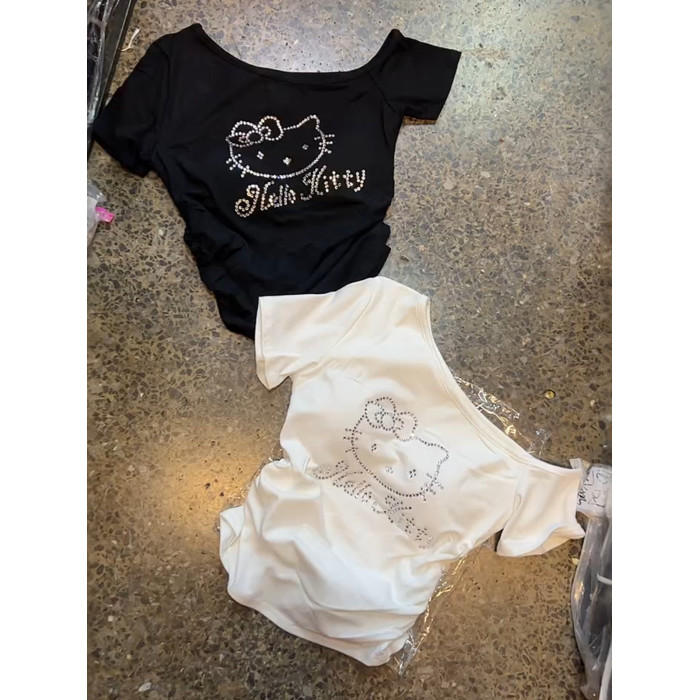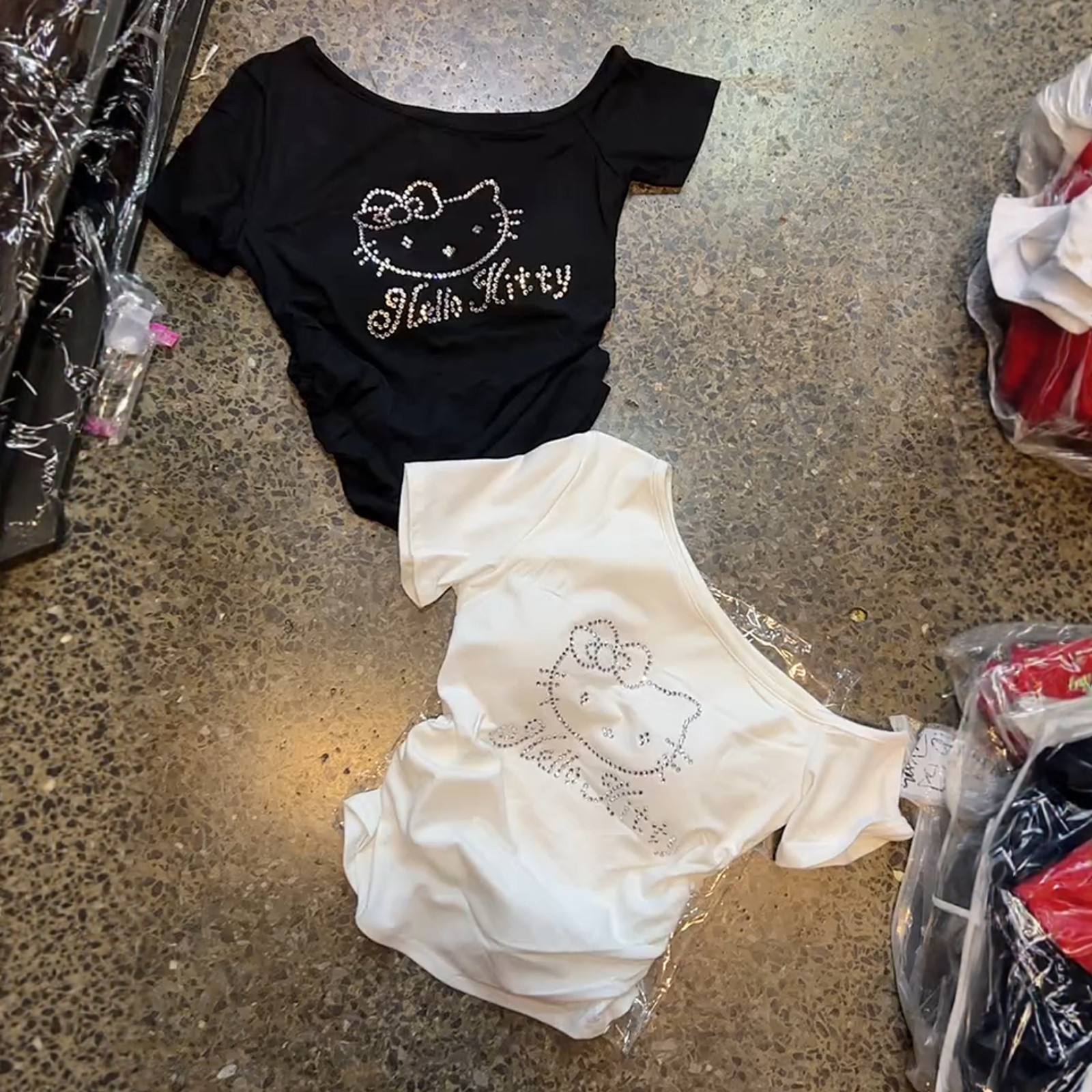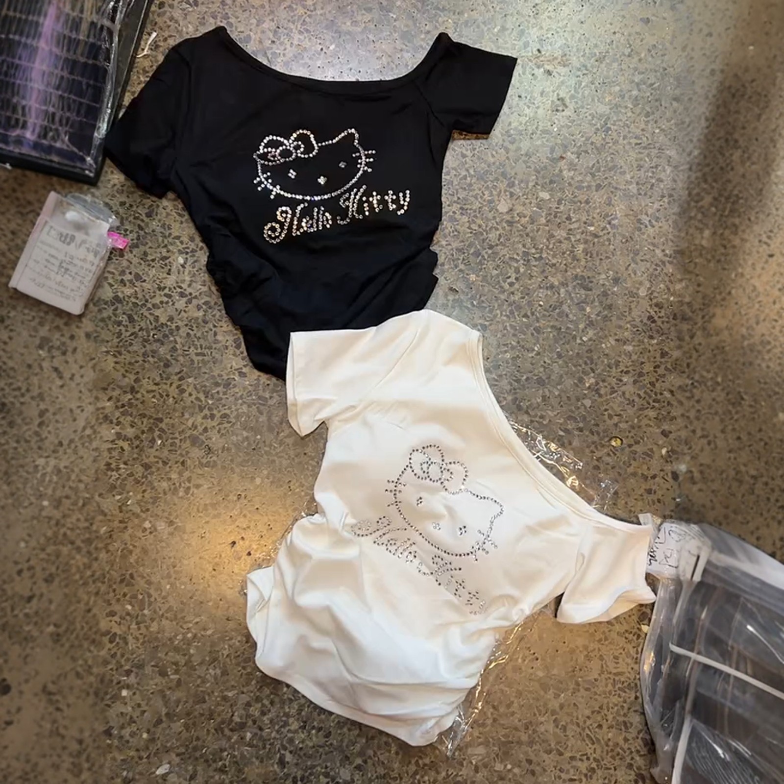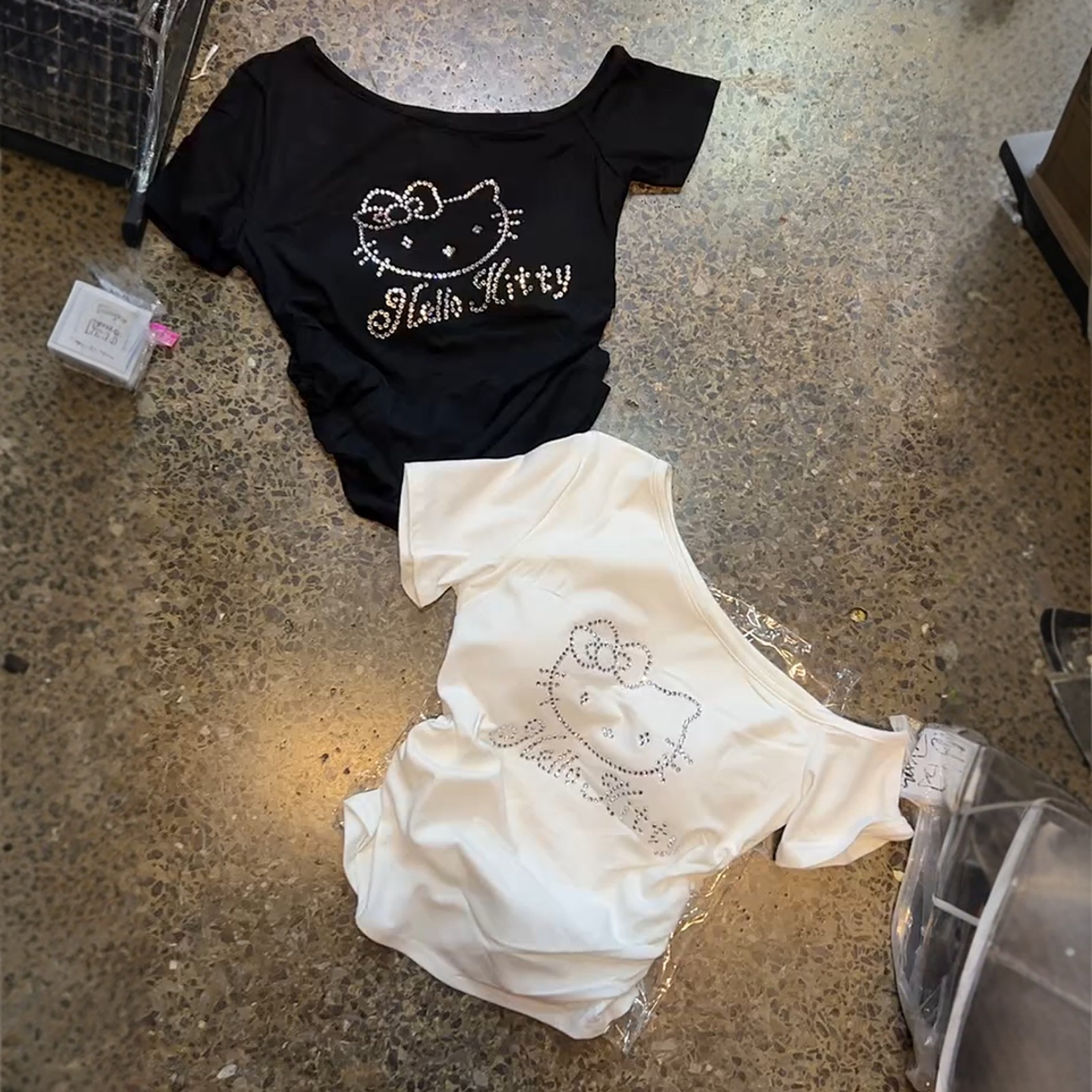 十三行美式復古kitty貓燙鑽短袖T恤女夏季甜辣妹收腰修身短款上衣