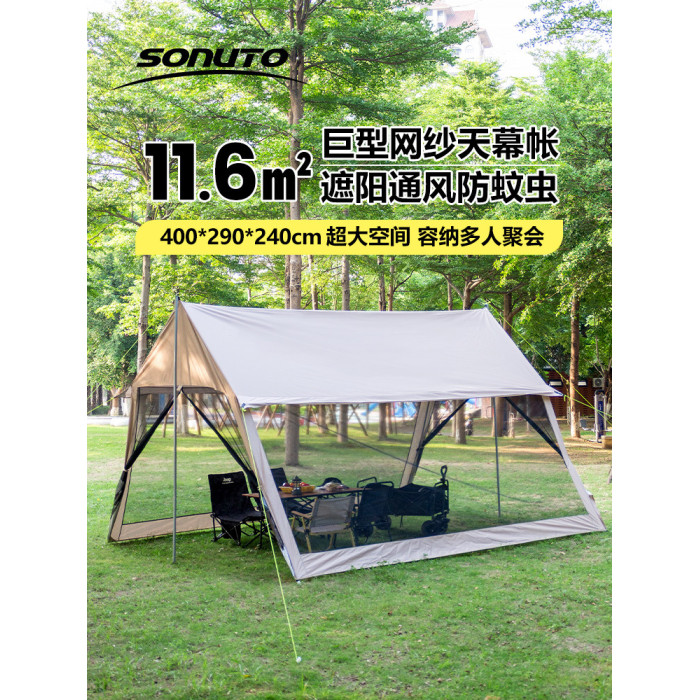 戶外網紗防蚊天幕帳篷露營帶擋布黑膠遮陽防曬防風雨野營野餐可攜式