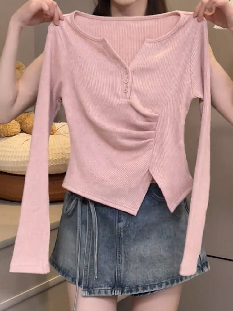 2026秋季新品粉色褶皺長袖T恤女純色甜美洋氣街頭不規則顯瘦上衣
