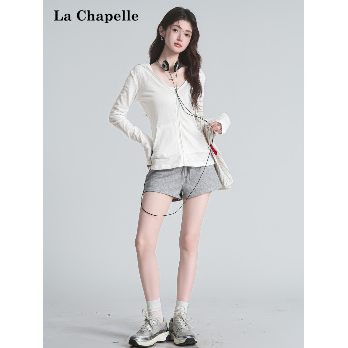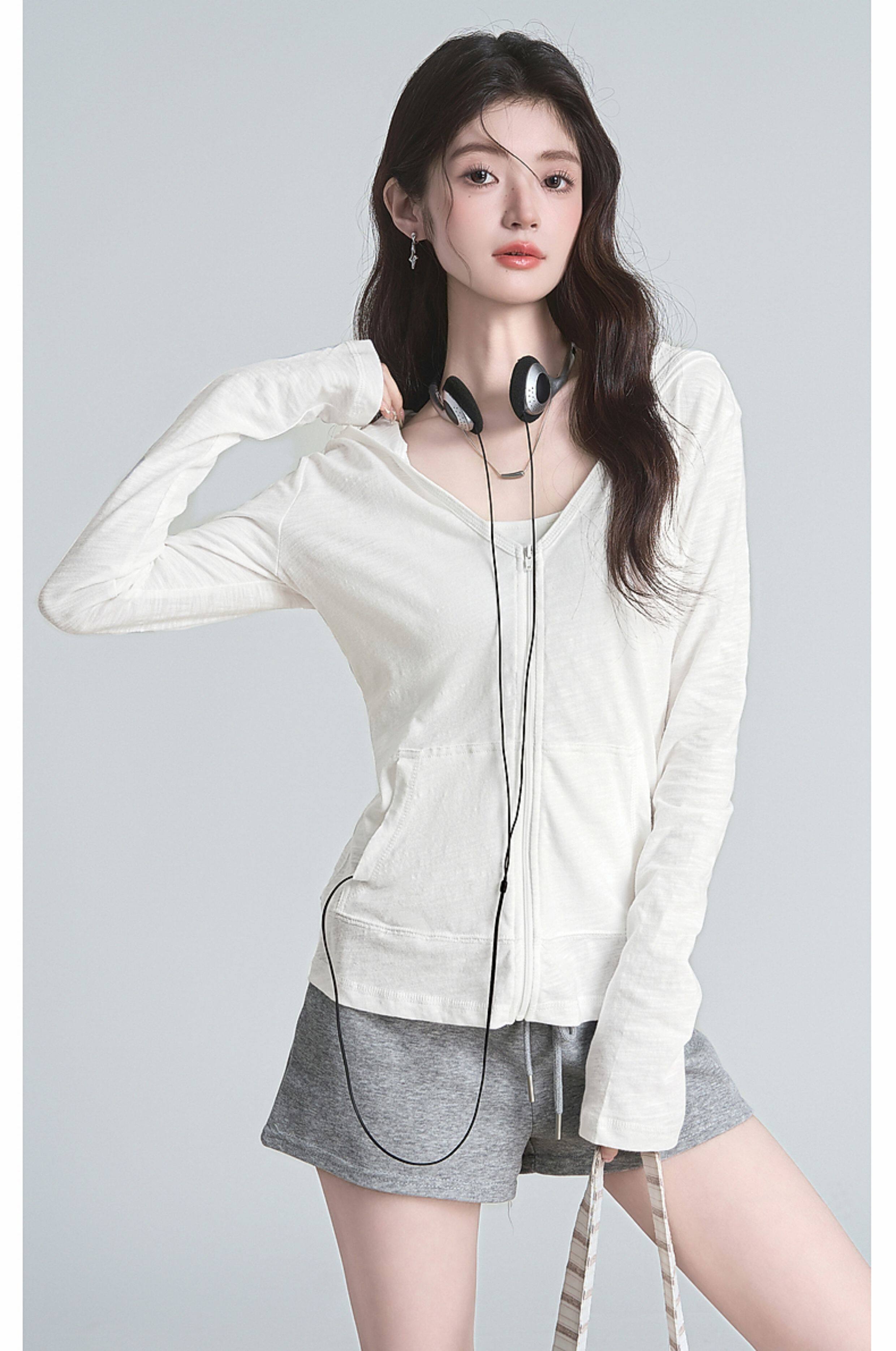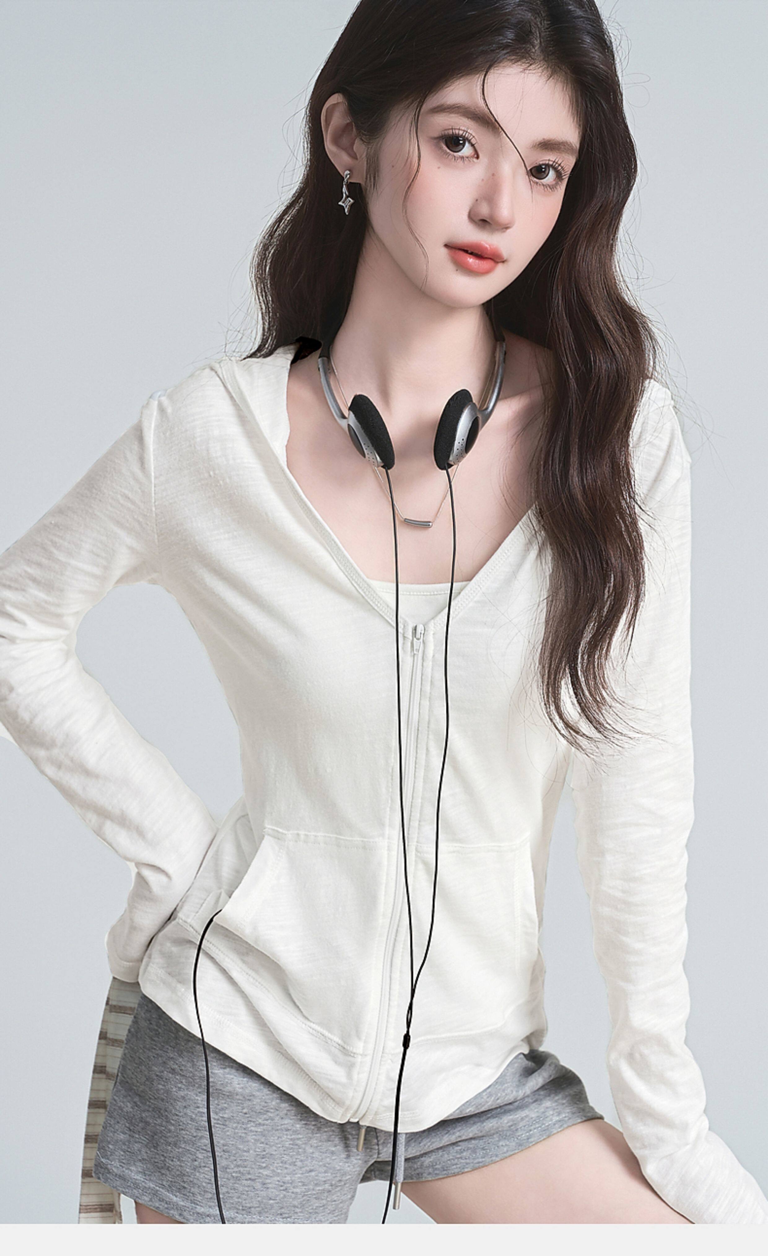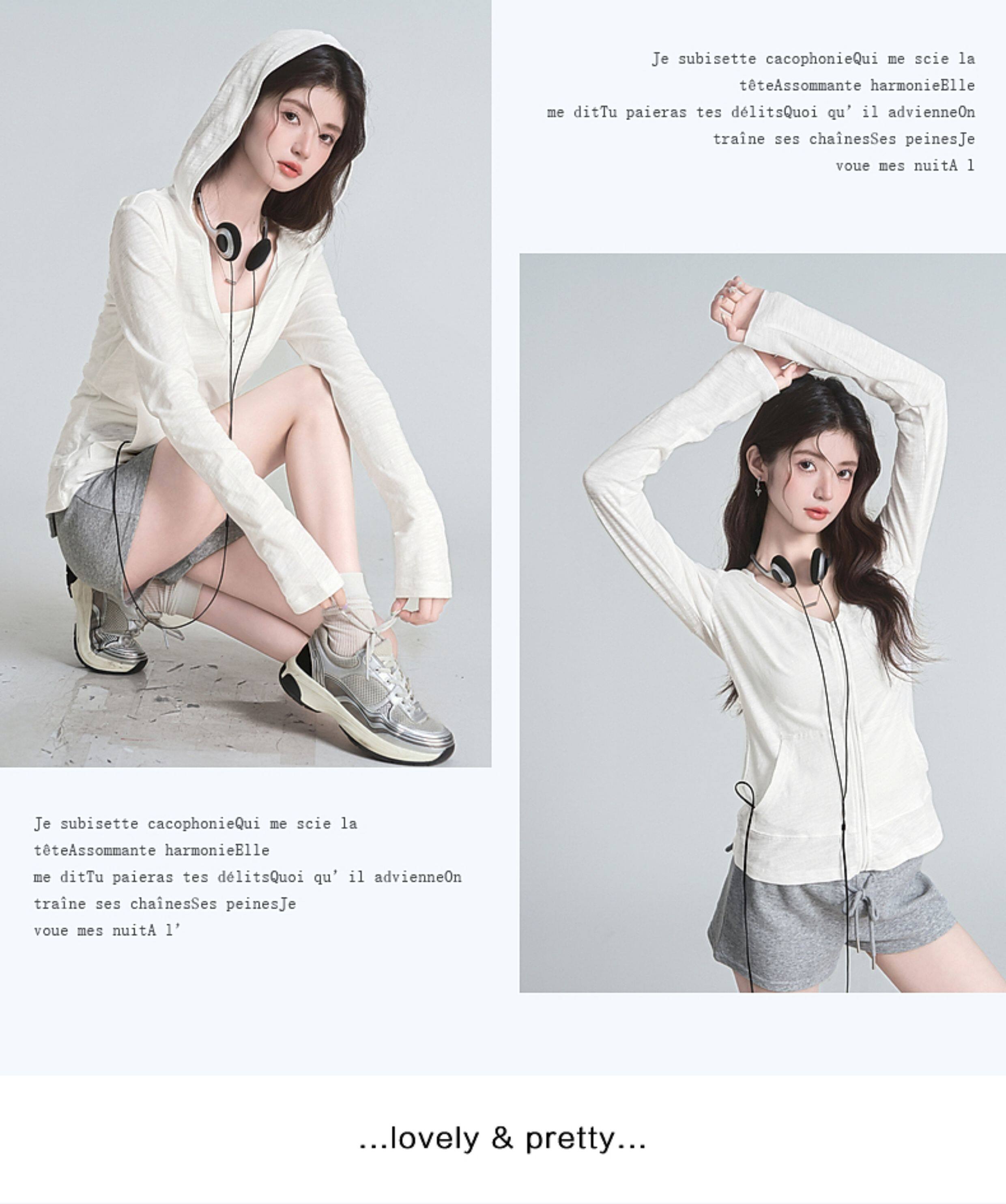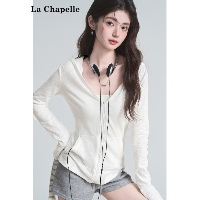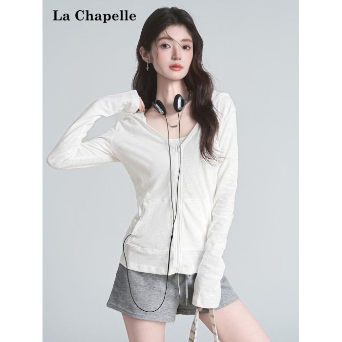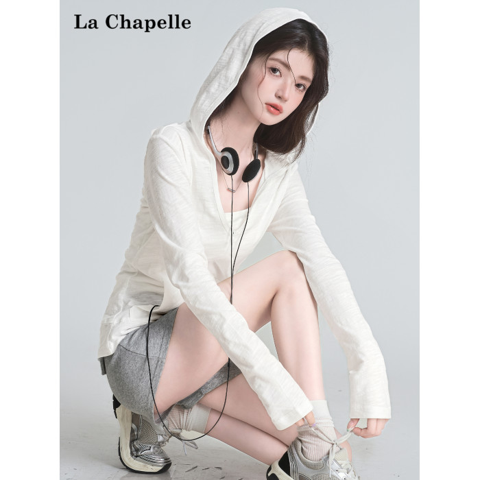 拉夏貝爾甜酷風v領白色連帽長袖t恤女辣妹開衫上衣設計感防曬罩衫