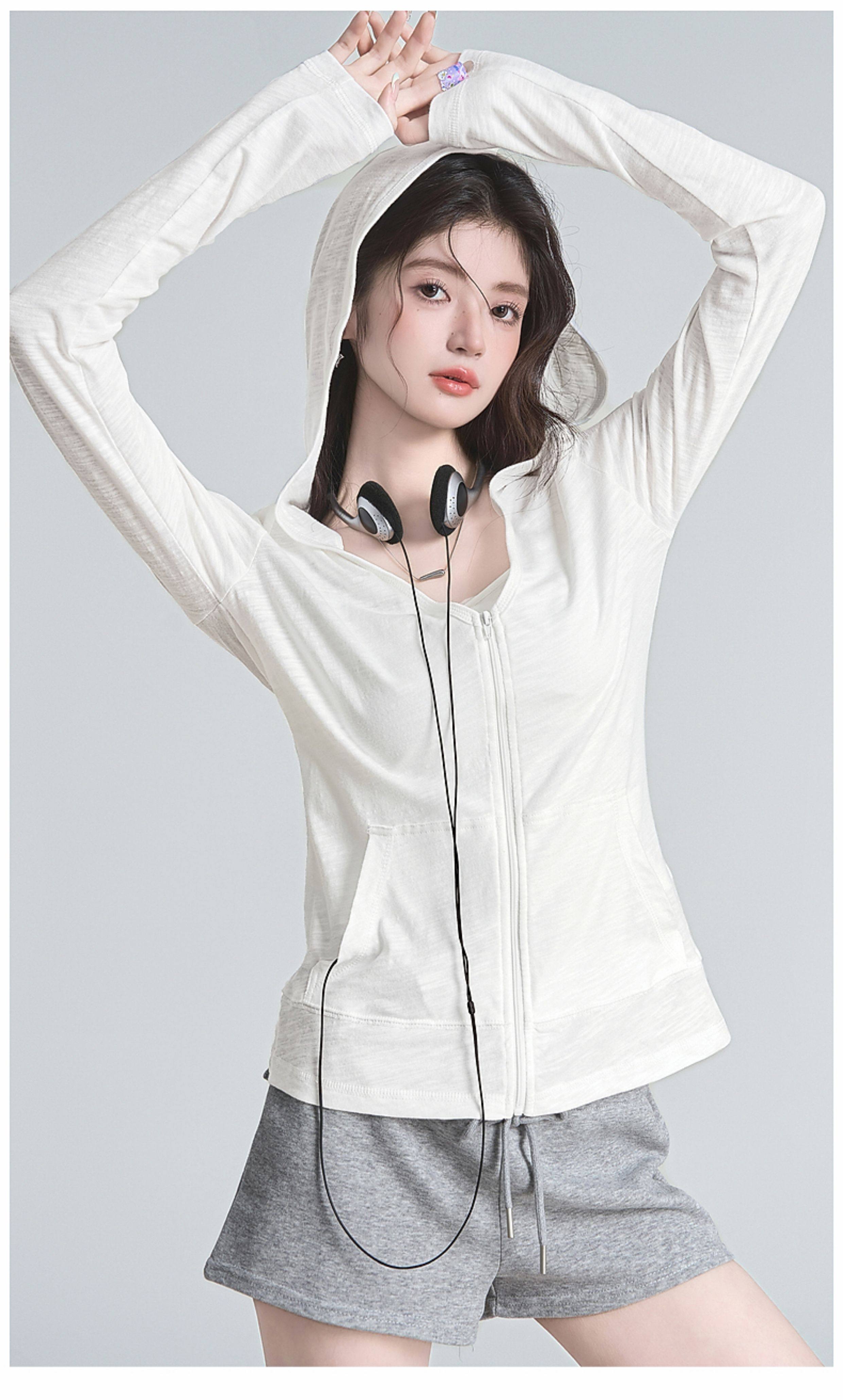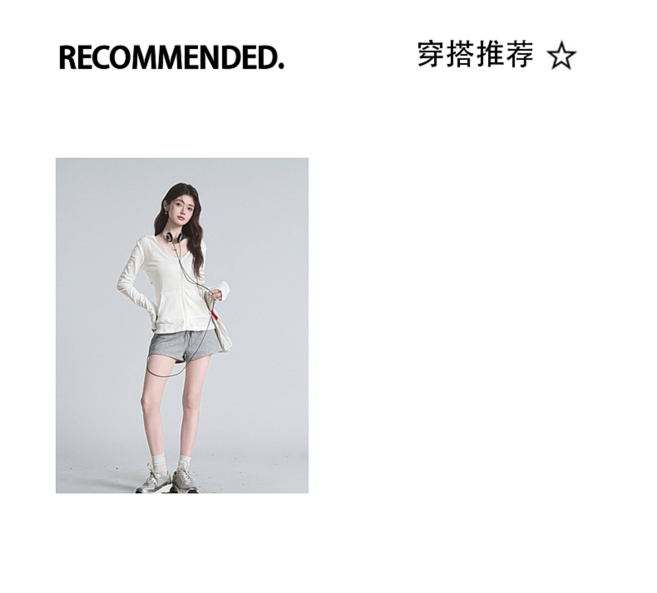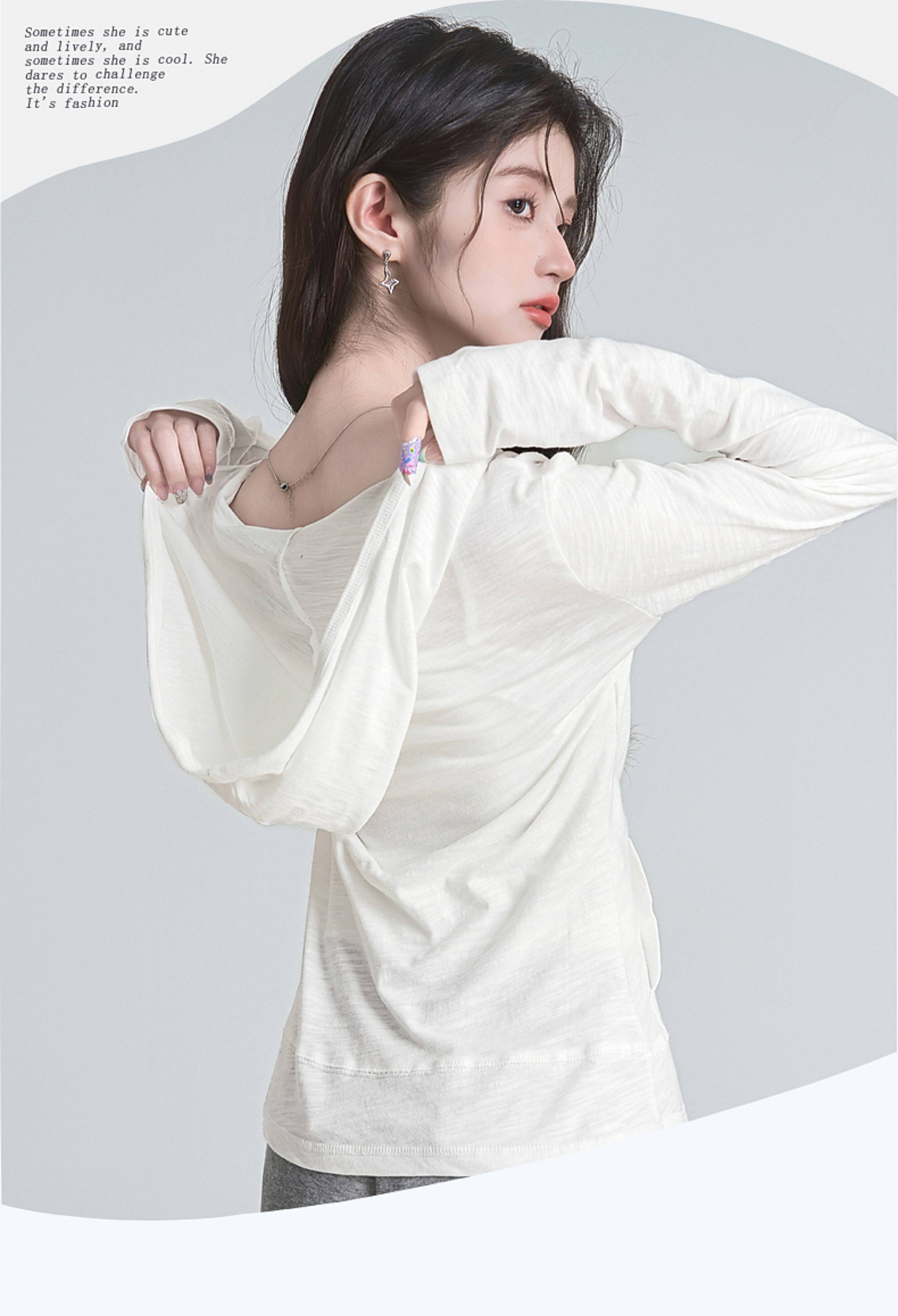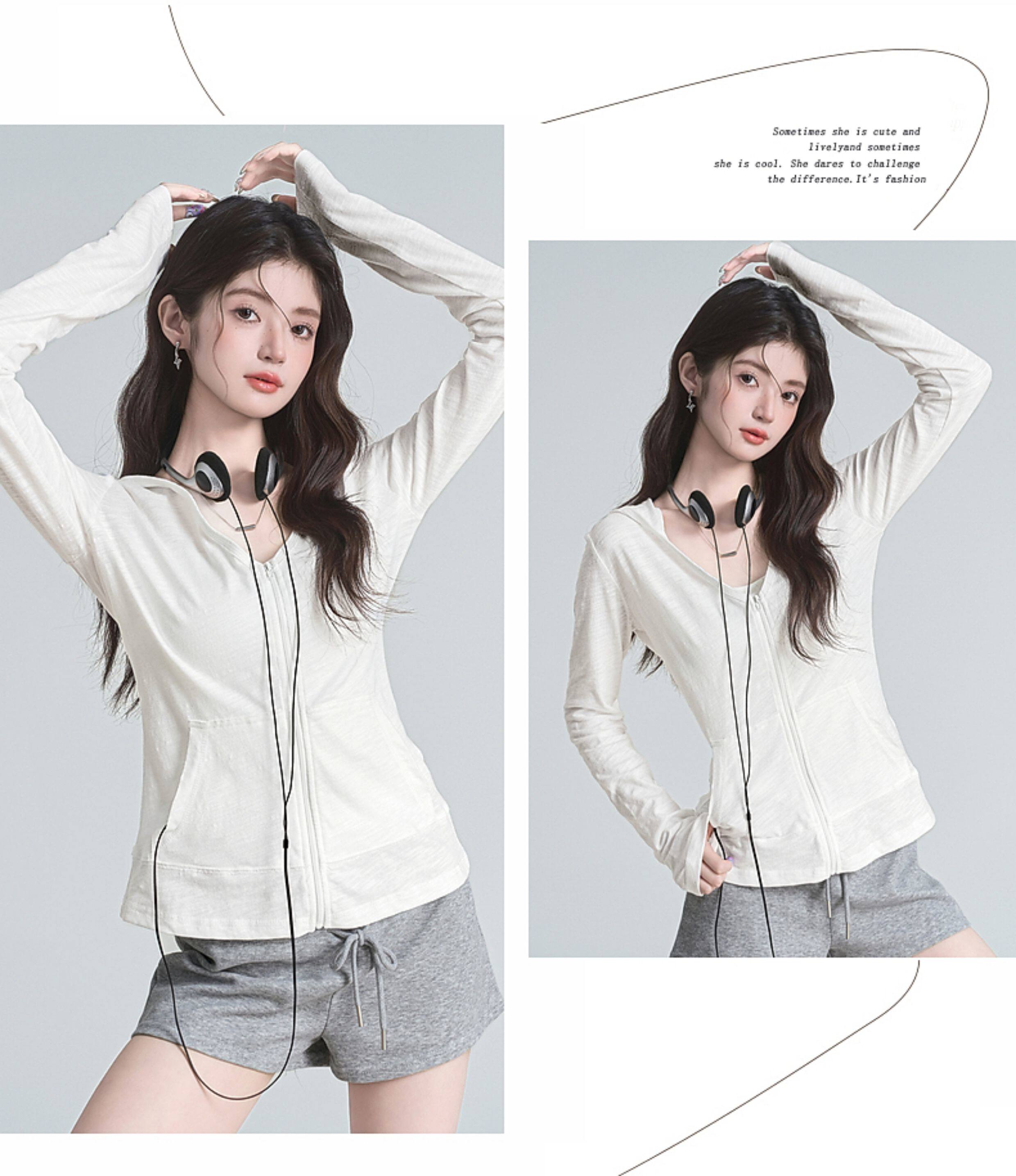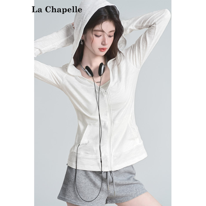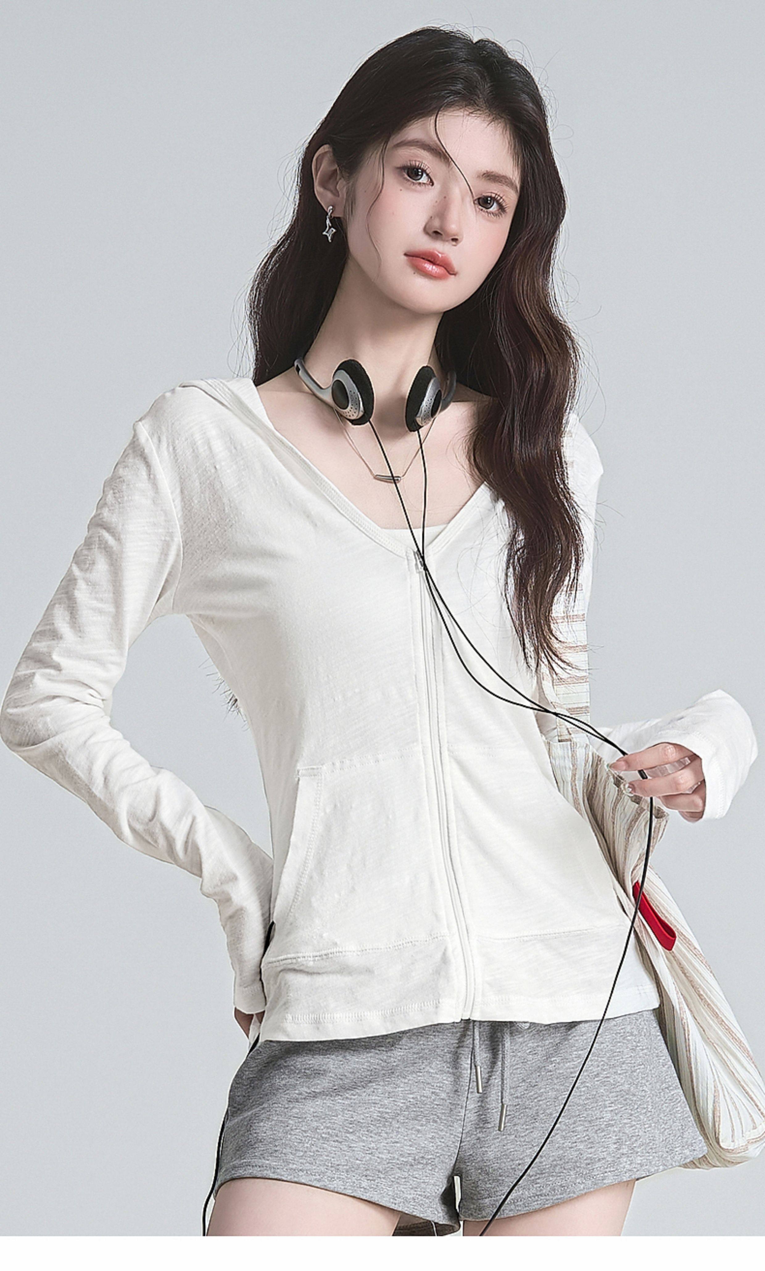 拉夏貝爾甜酷風v領白色連帽長袖t恤女辣妹開衫上衣設計感防曬罩衫