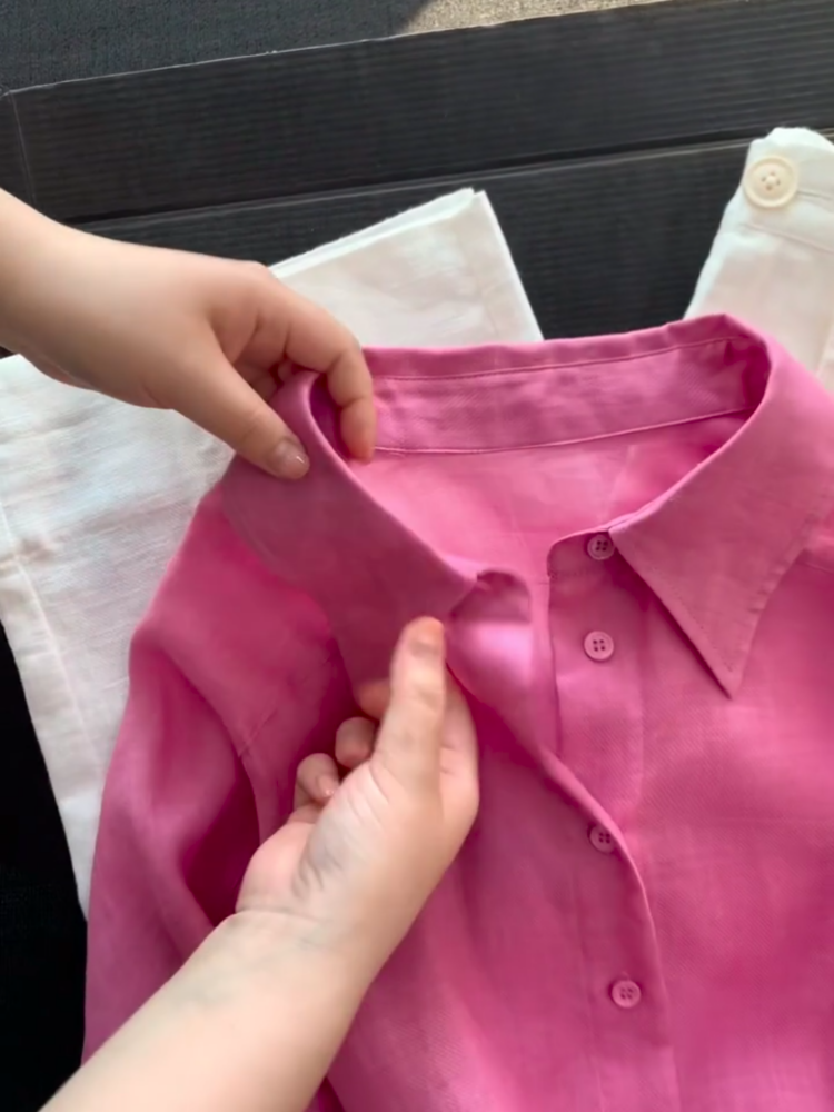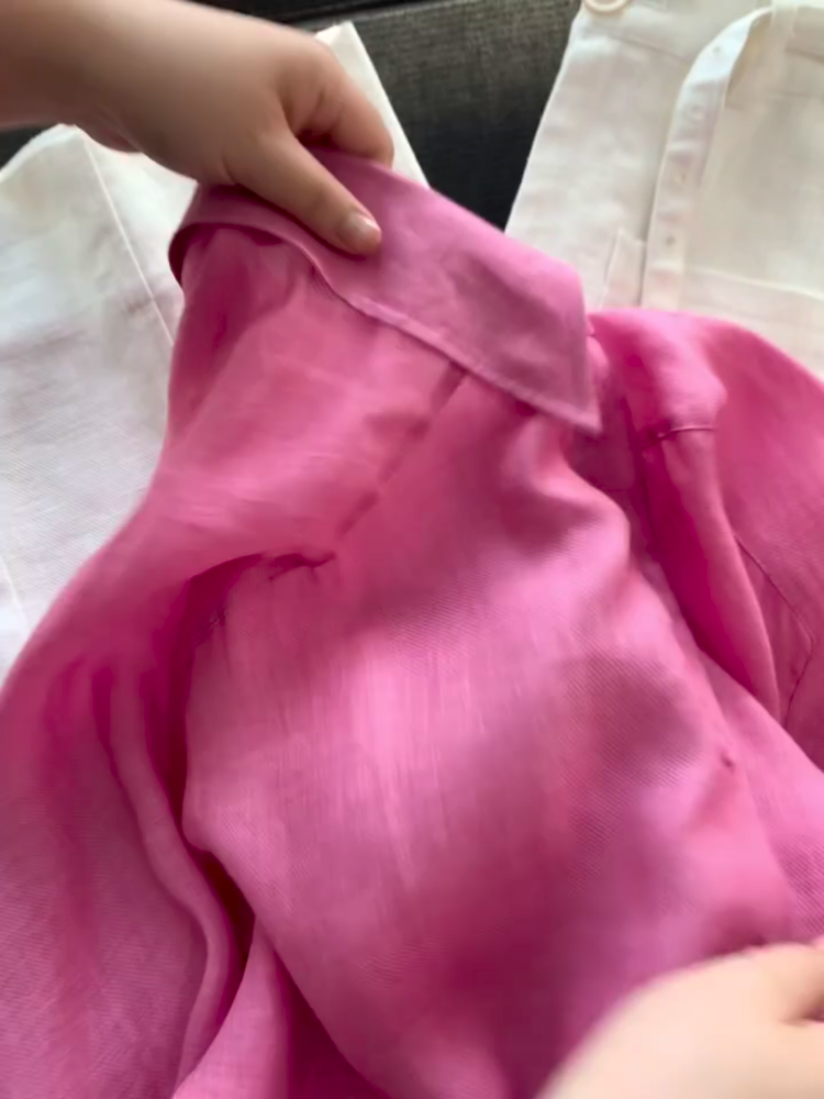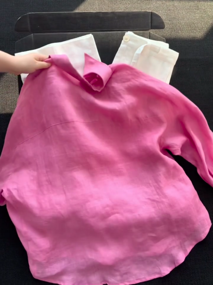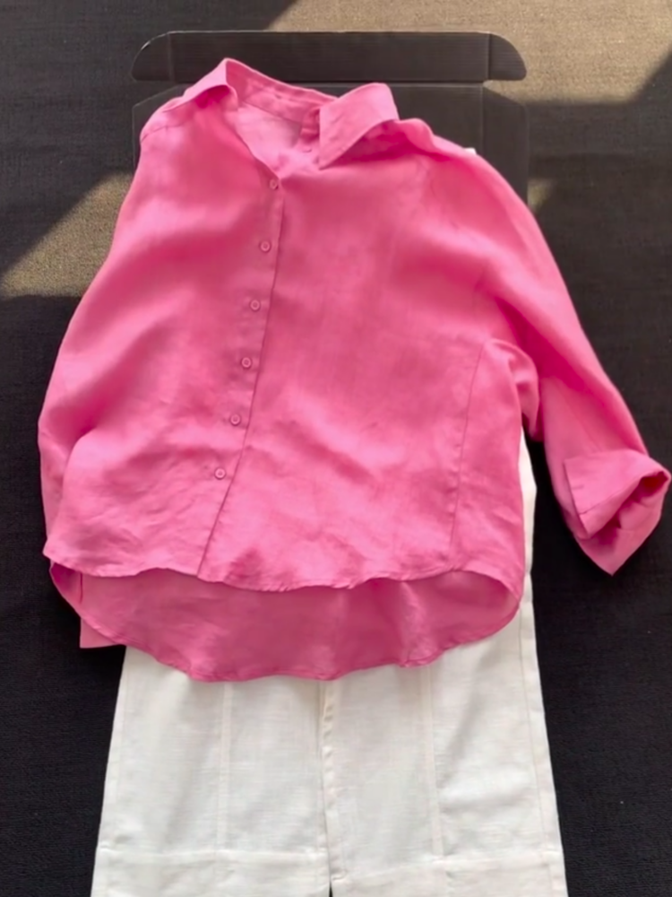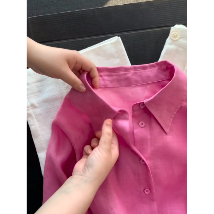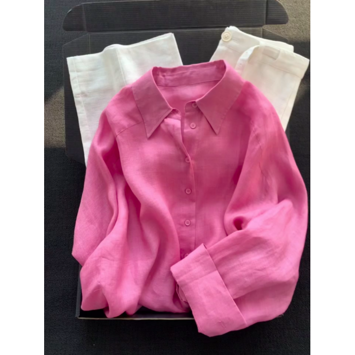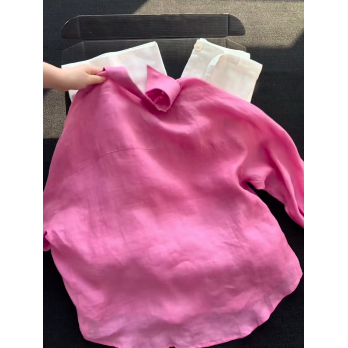 高級感樹莓粉亞麻長袖襯衫女2025夏季男友風輕薄松弛感慵懶風上衣