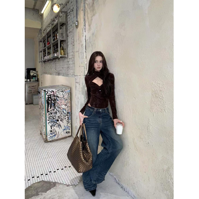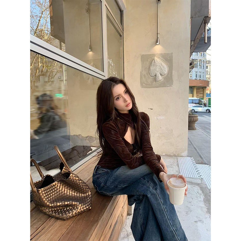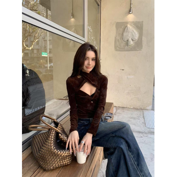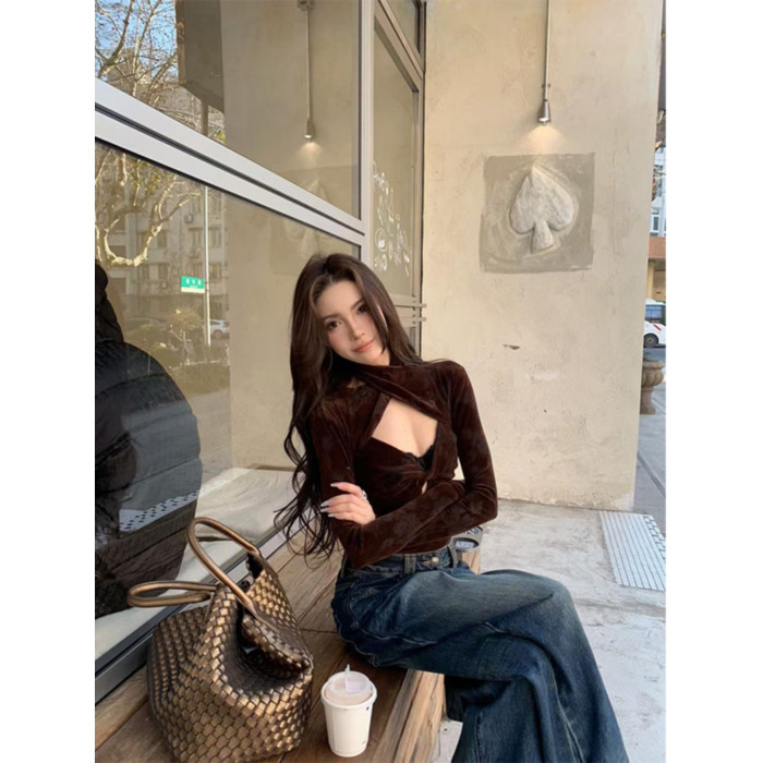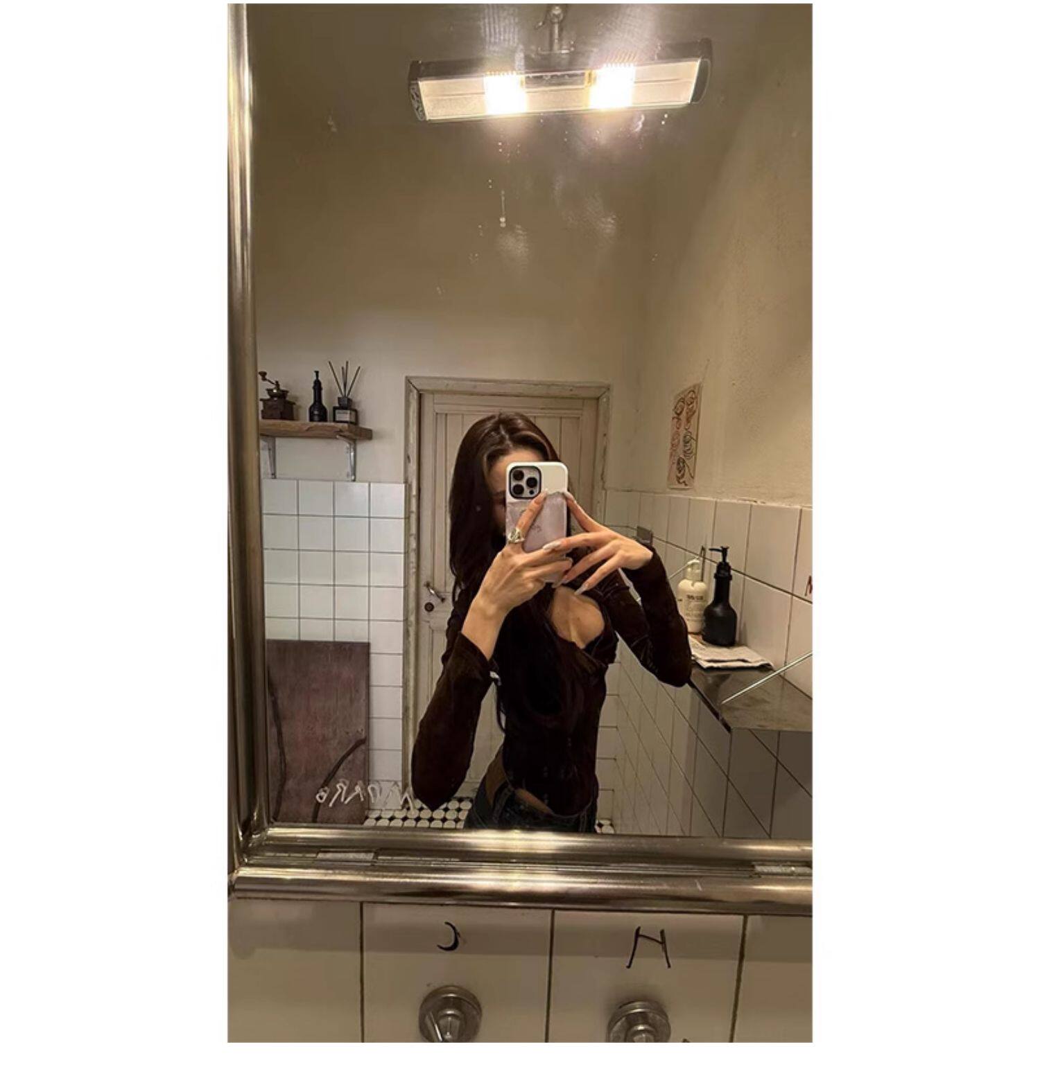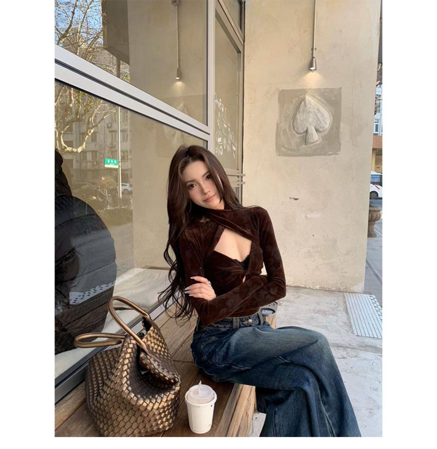 Turn up/陳腿兒 高級感網紗高彈長袖打底衫女春復古鏤空連體衣潮