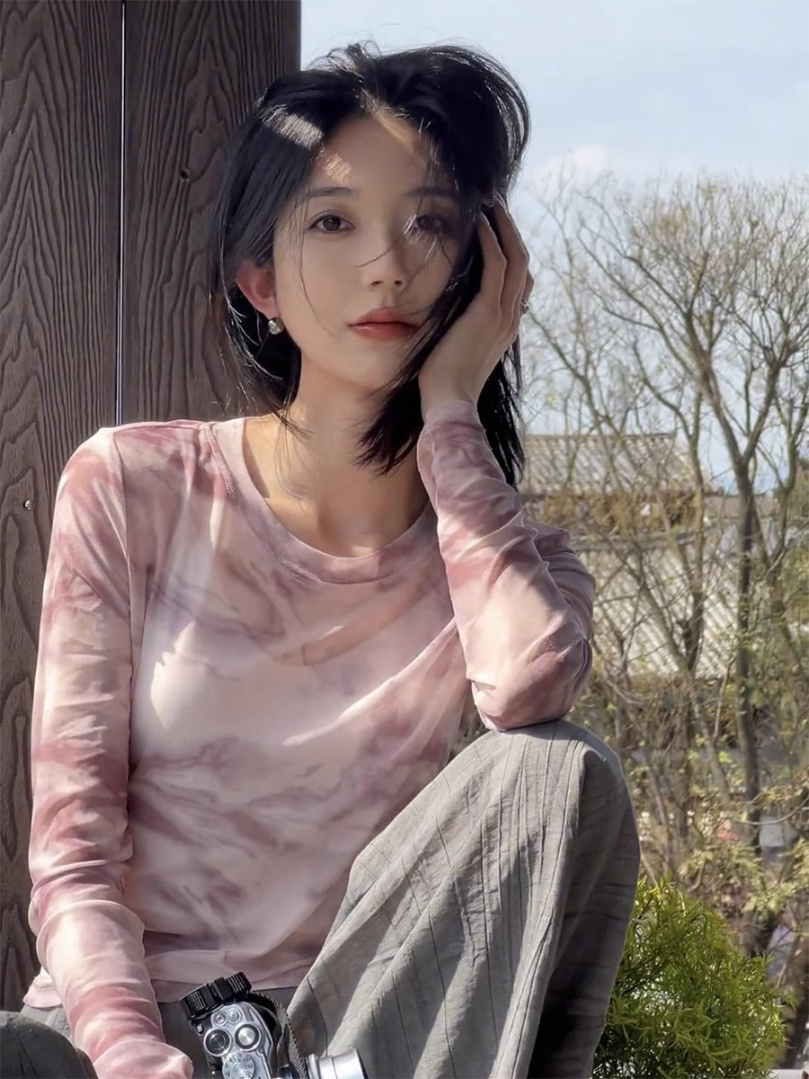 時尚設計感水墨暈染紗網長袖t恤時髦顯瘦百搭防曬上衣女輕薄舒適