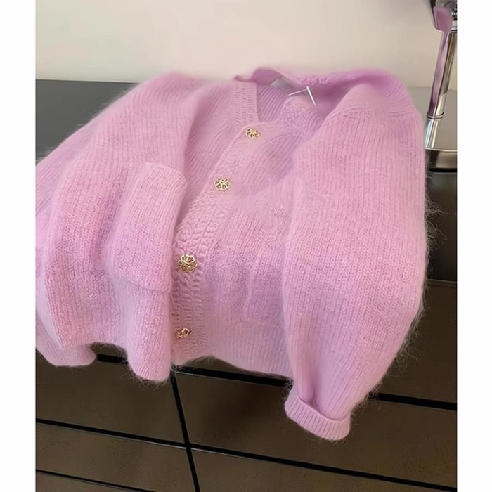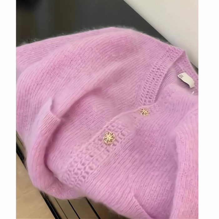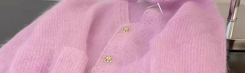 巨推薦~上身絕美!粉色V領針織開衫女2024新款寬鬆顯瘦毛衣外套