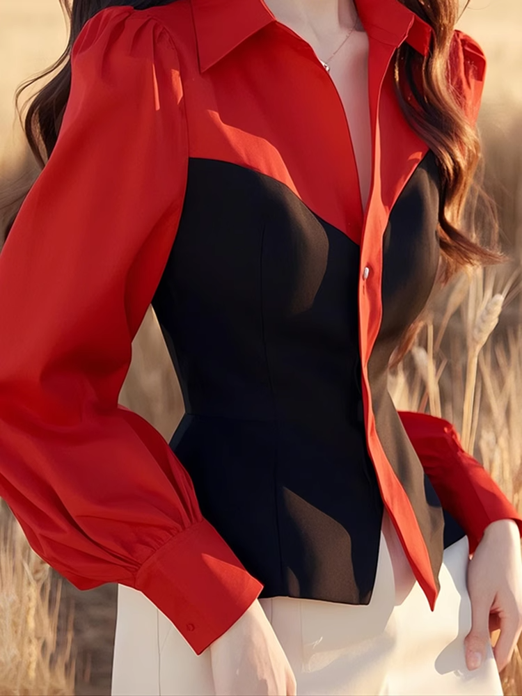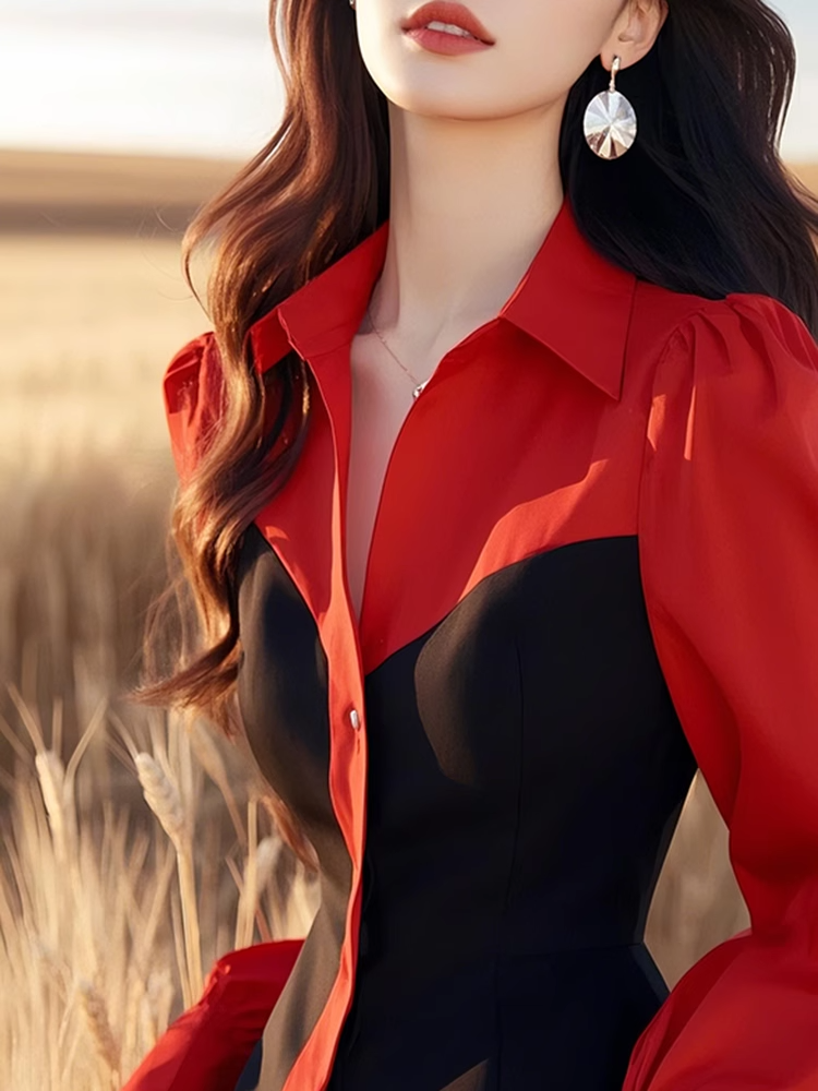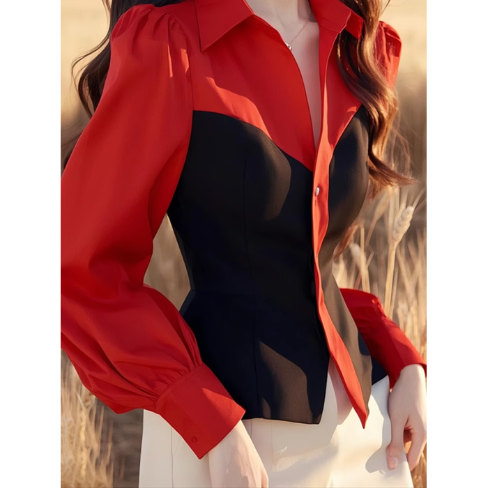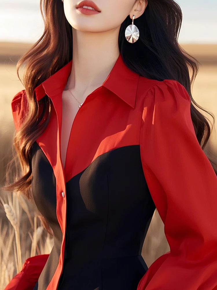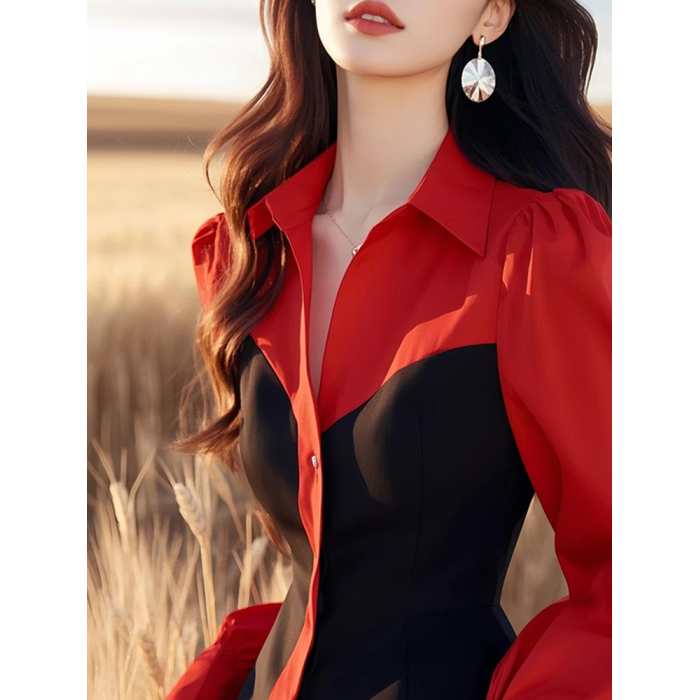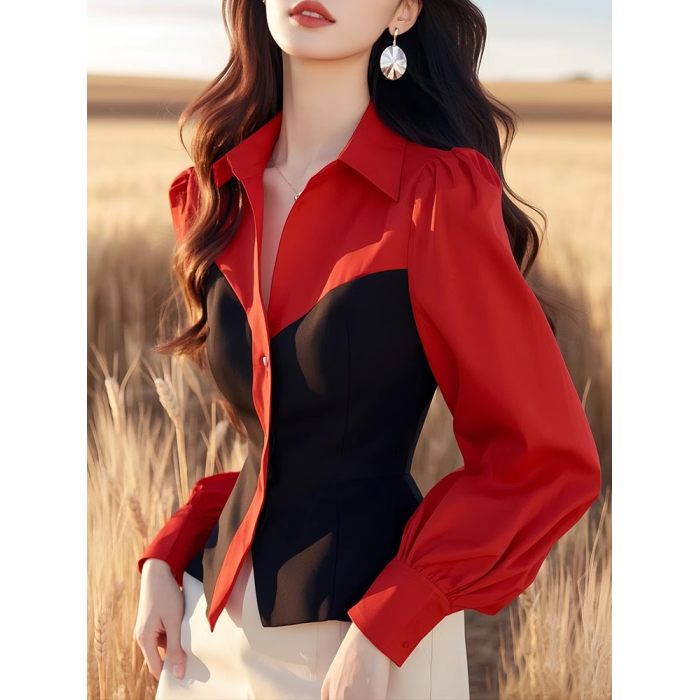 法式黑紅撞色拼接襯衫女長袖秋季新款外穿遮肉收腰上衣別致打底衫