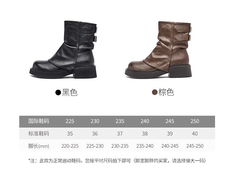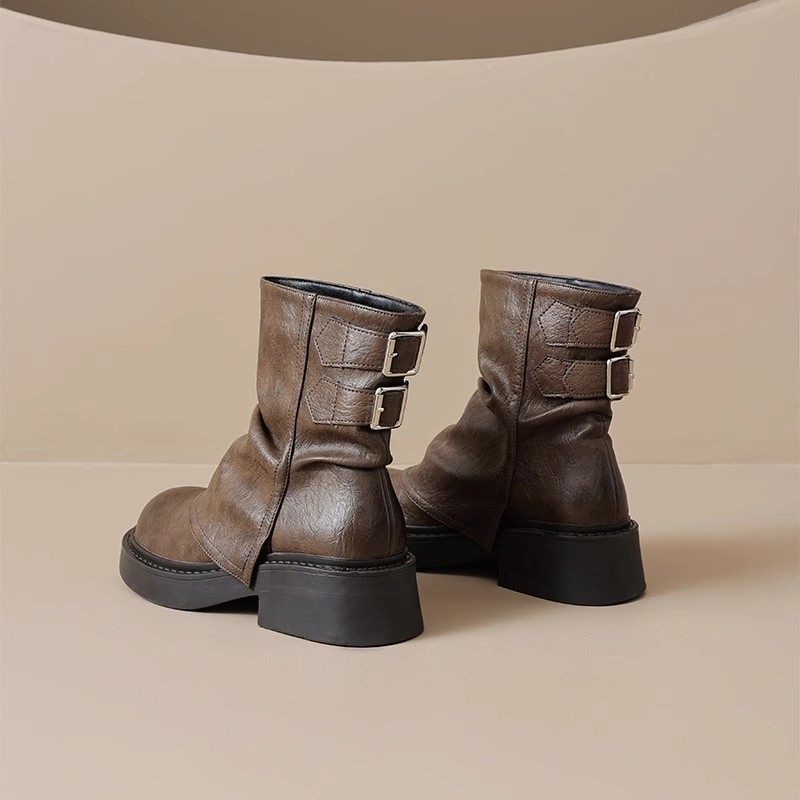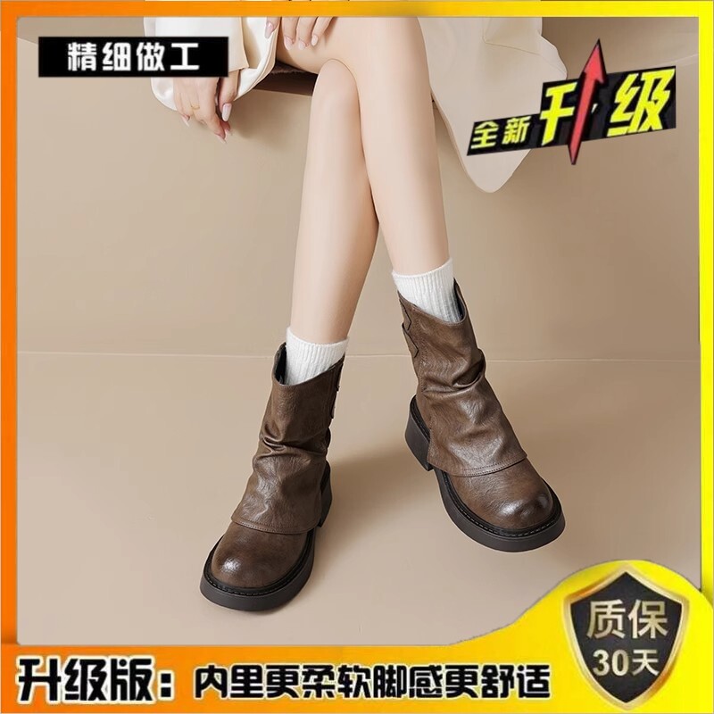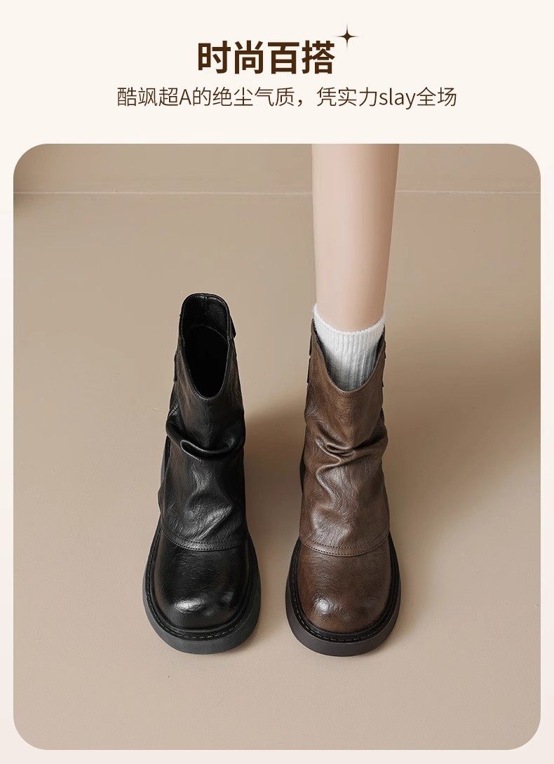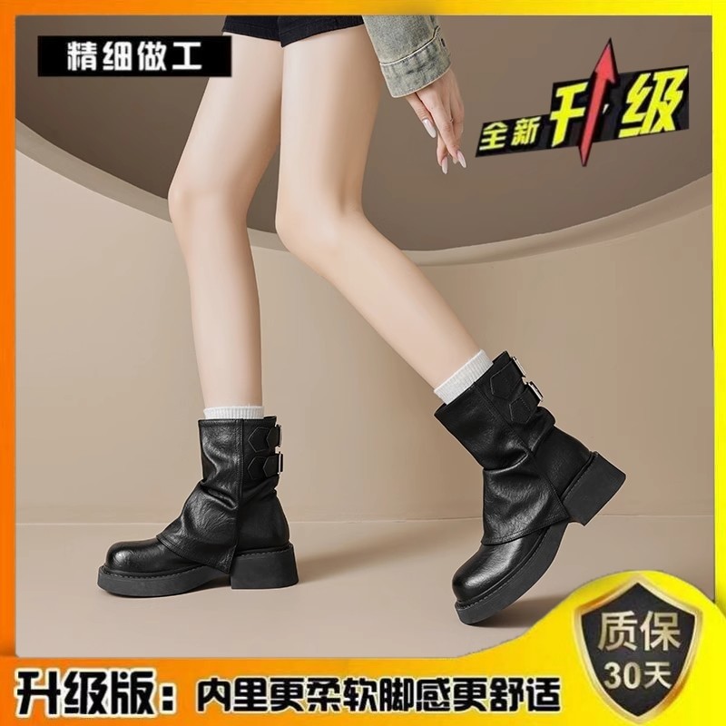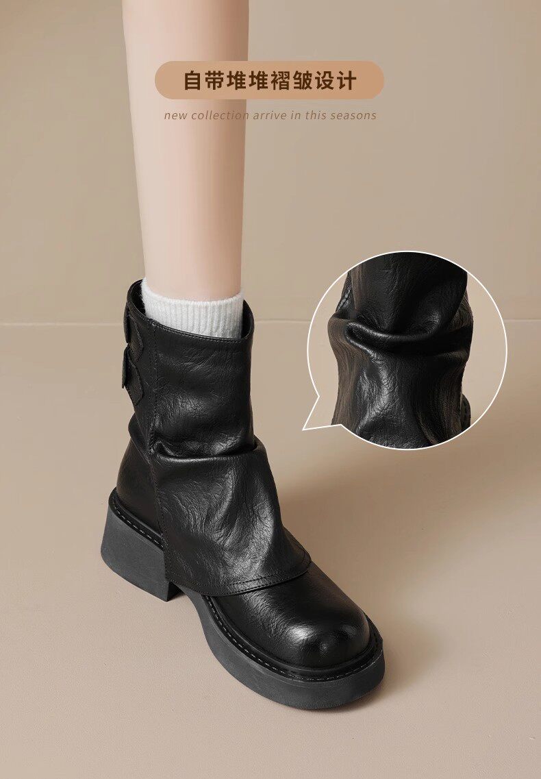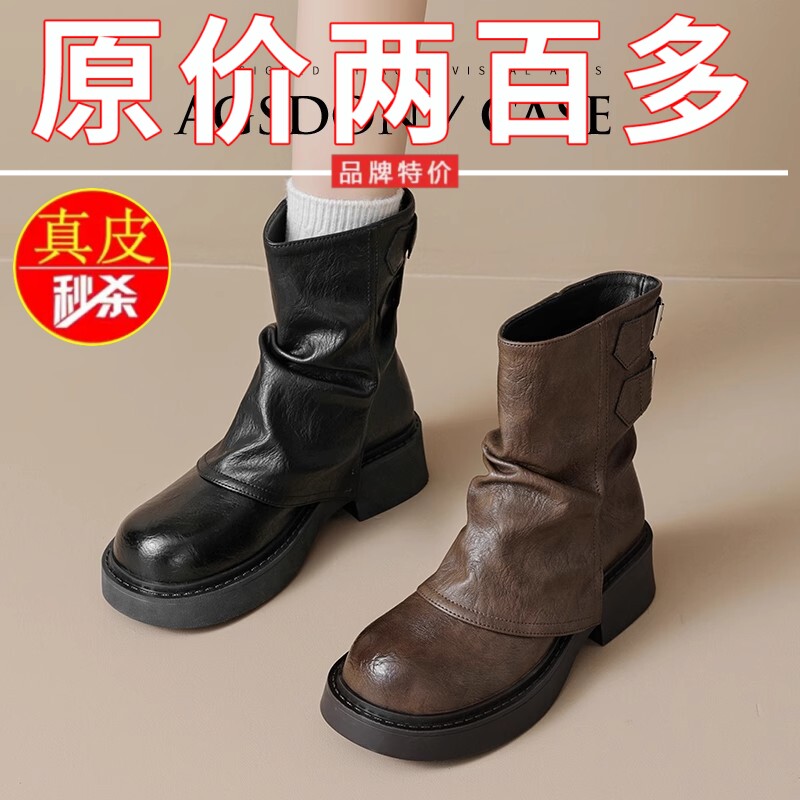 品牌特價真皮堆堆靴女2025秋冬新款小衆美拉德時尚短靴女粗跟厚底