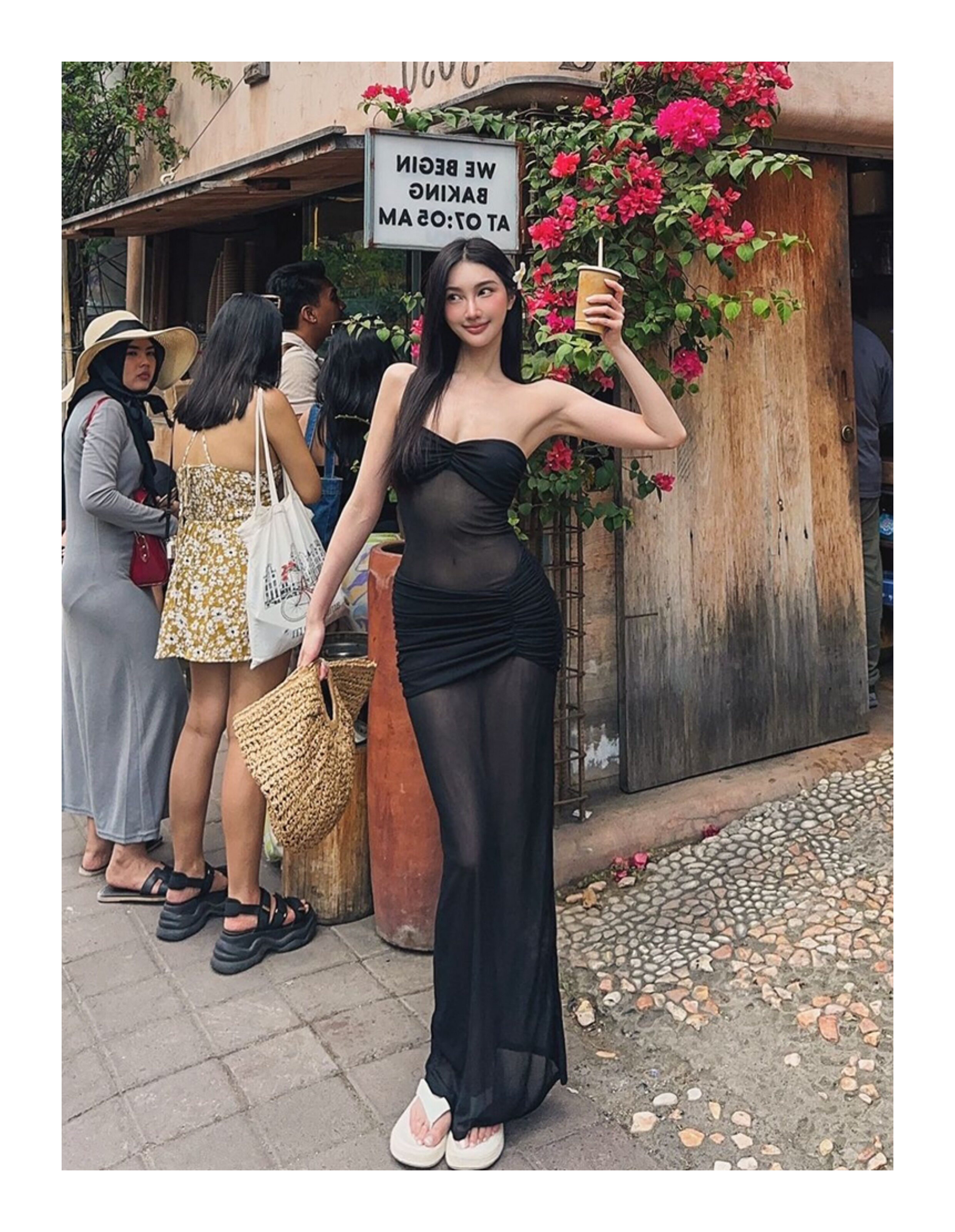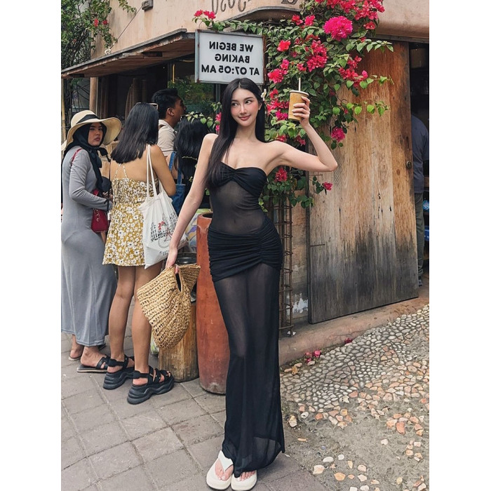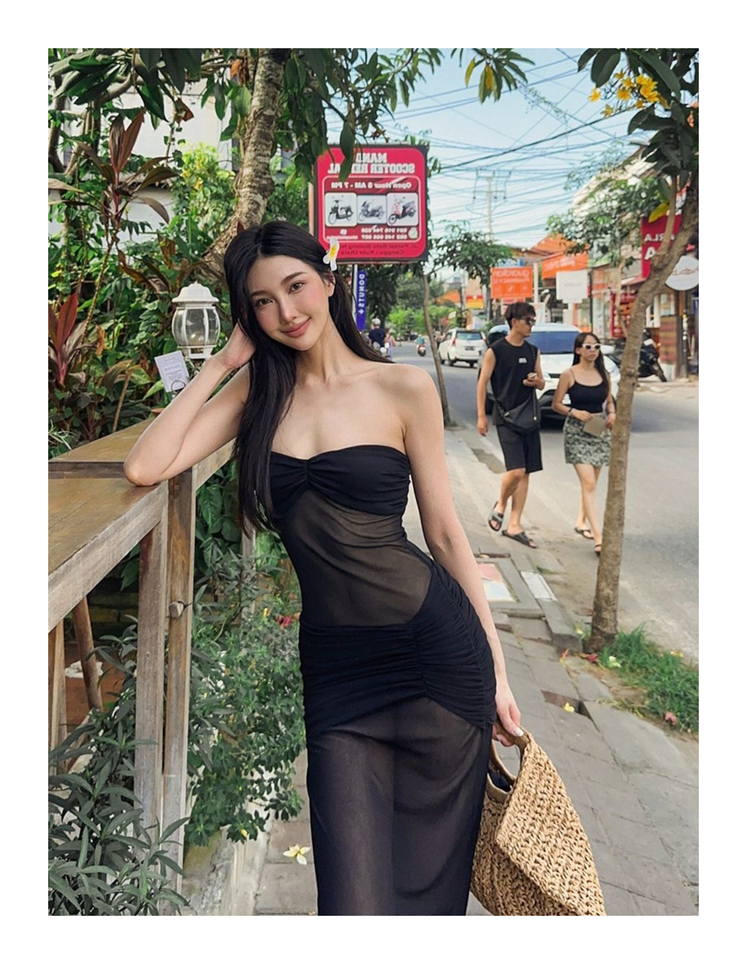 法式拼接網紗透視黑色裹胸連衣裙女性感褶皺氣質長裙夏季新款