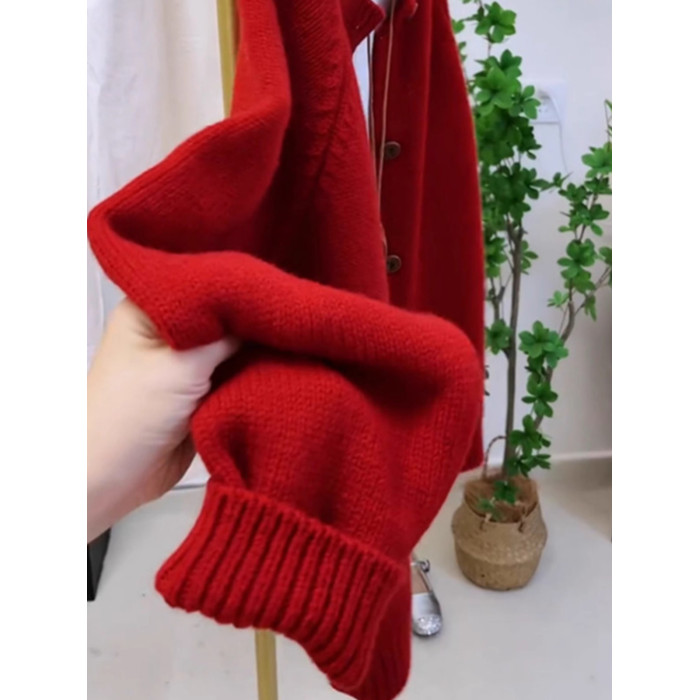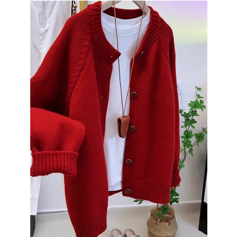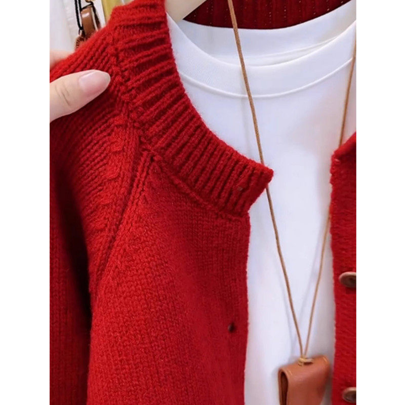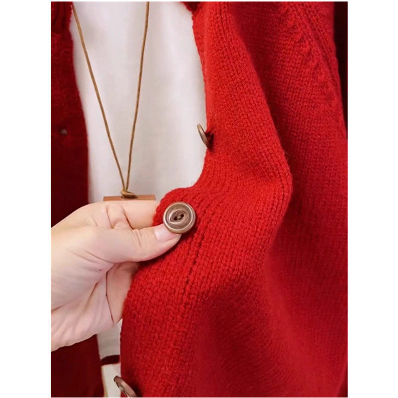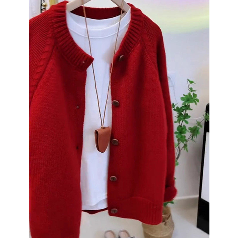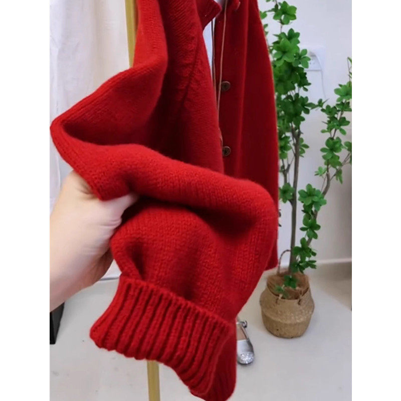 韓系慵懶風復古高級感紅色針織毛衣開衫女秋冬季洋氣減齡外套上衣
