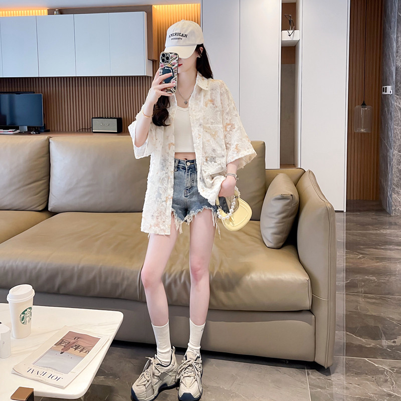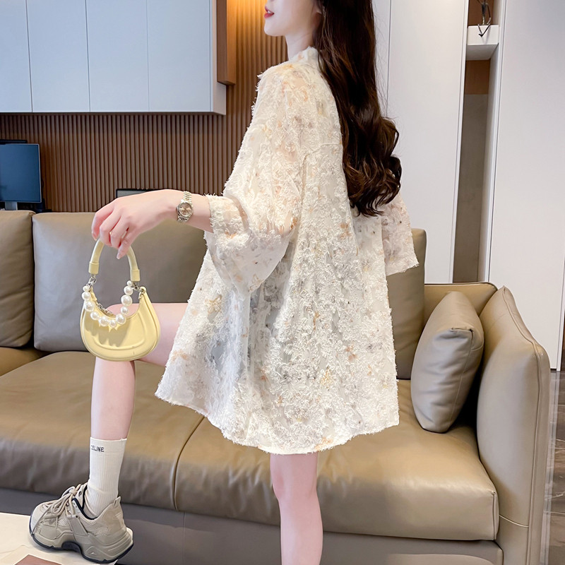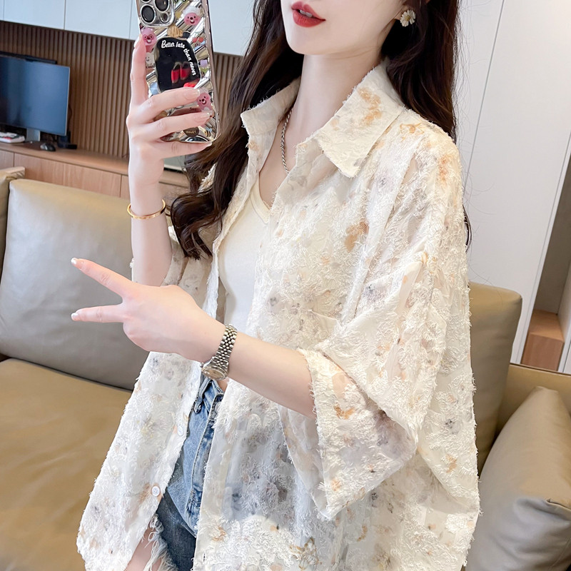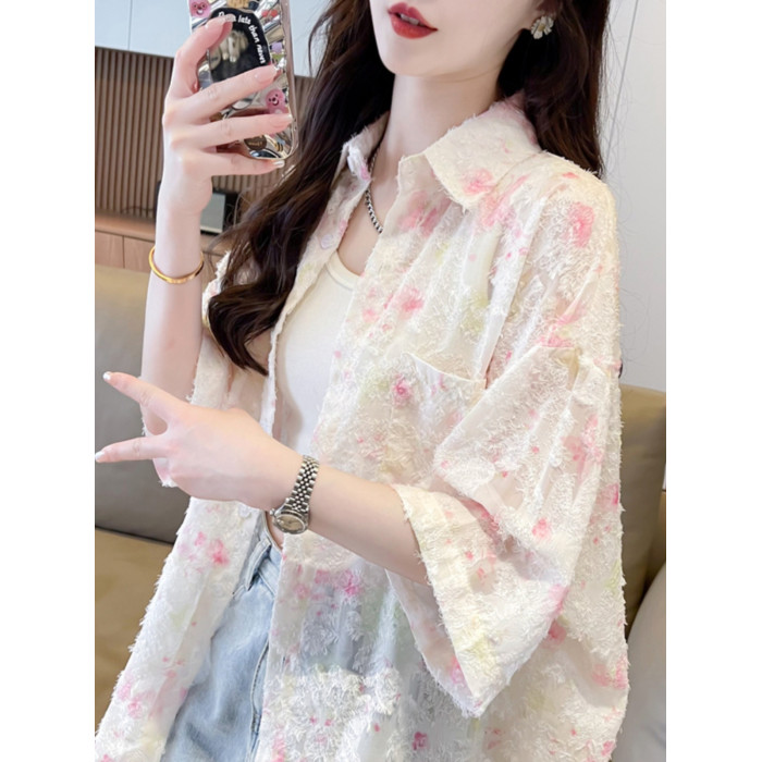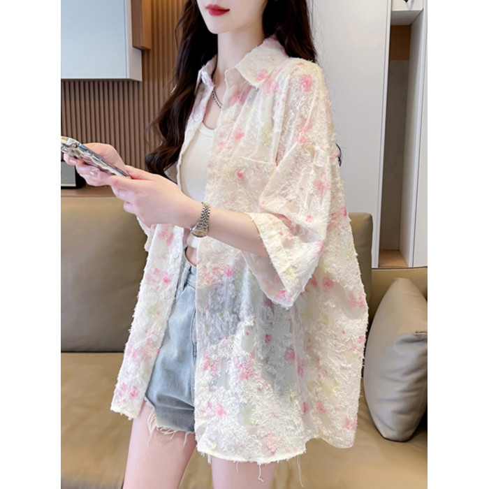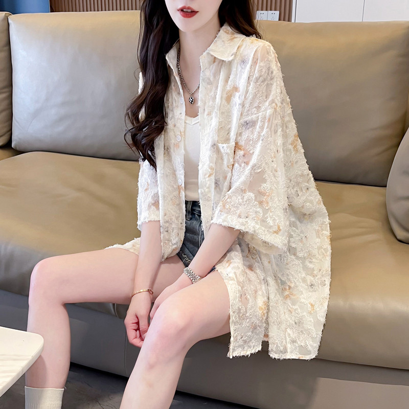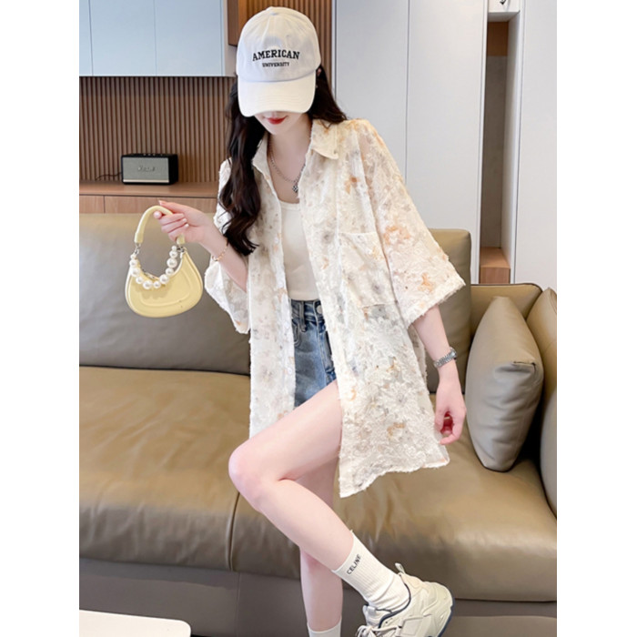 提花短袖襯衫防曬服女夏季時尚半透明繙領中長款口袋設計外套上衣