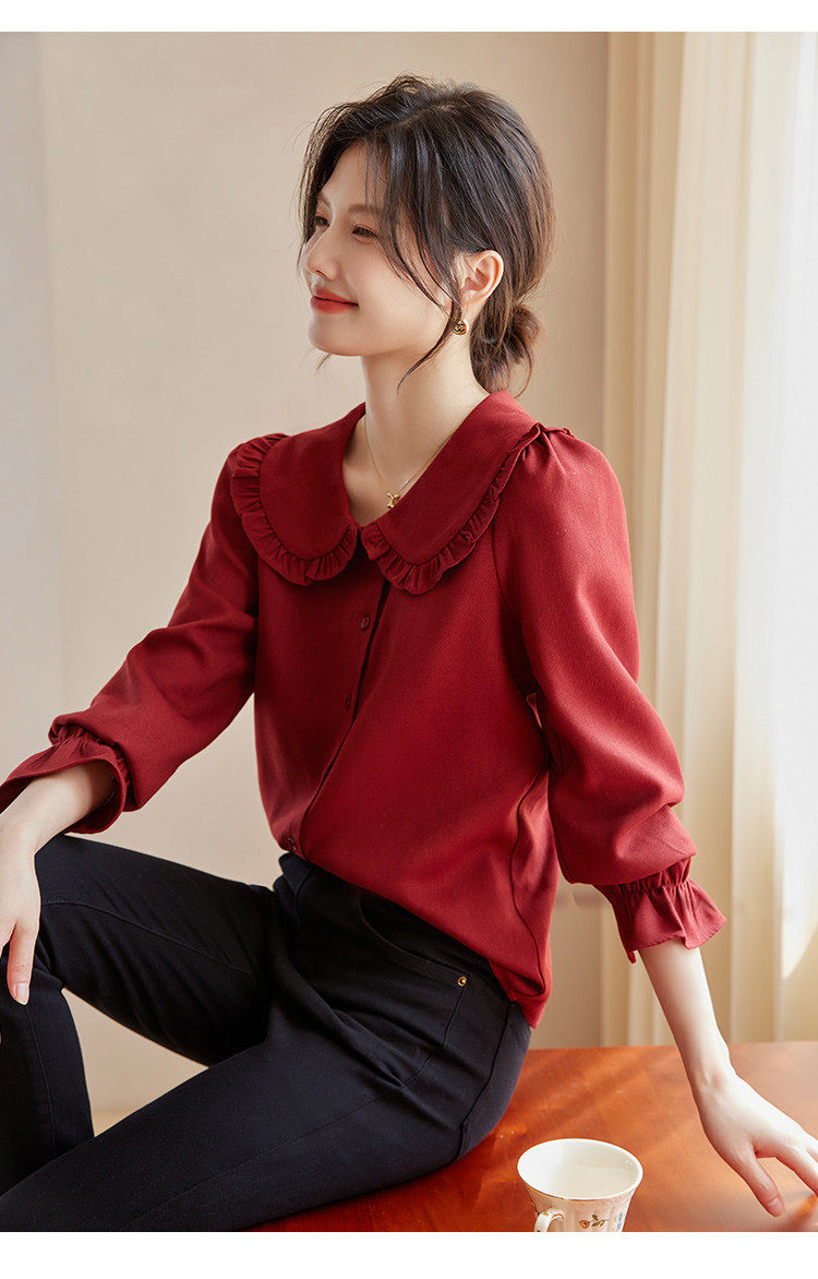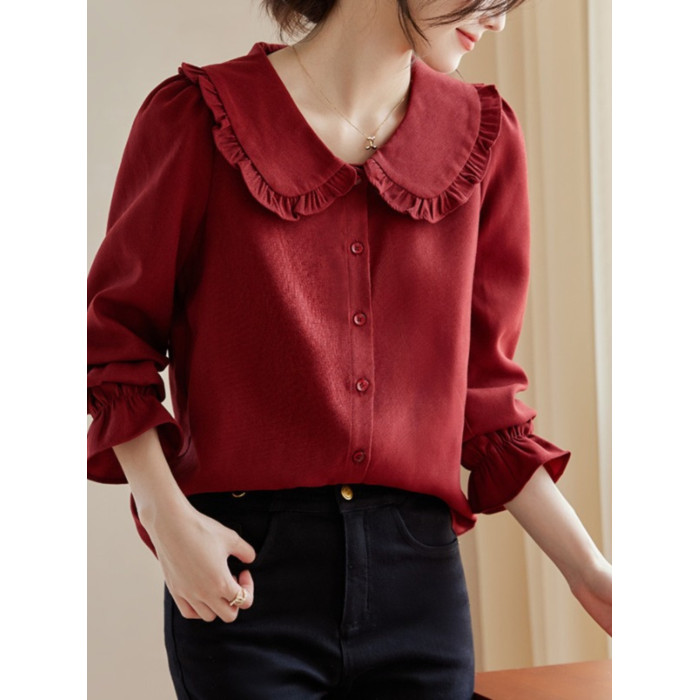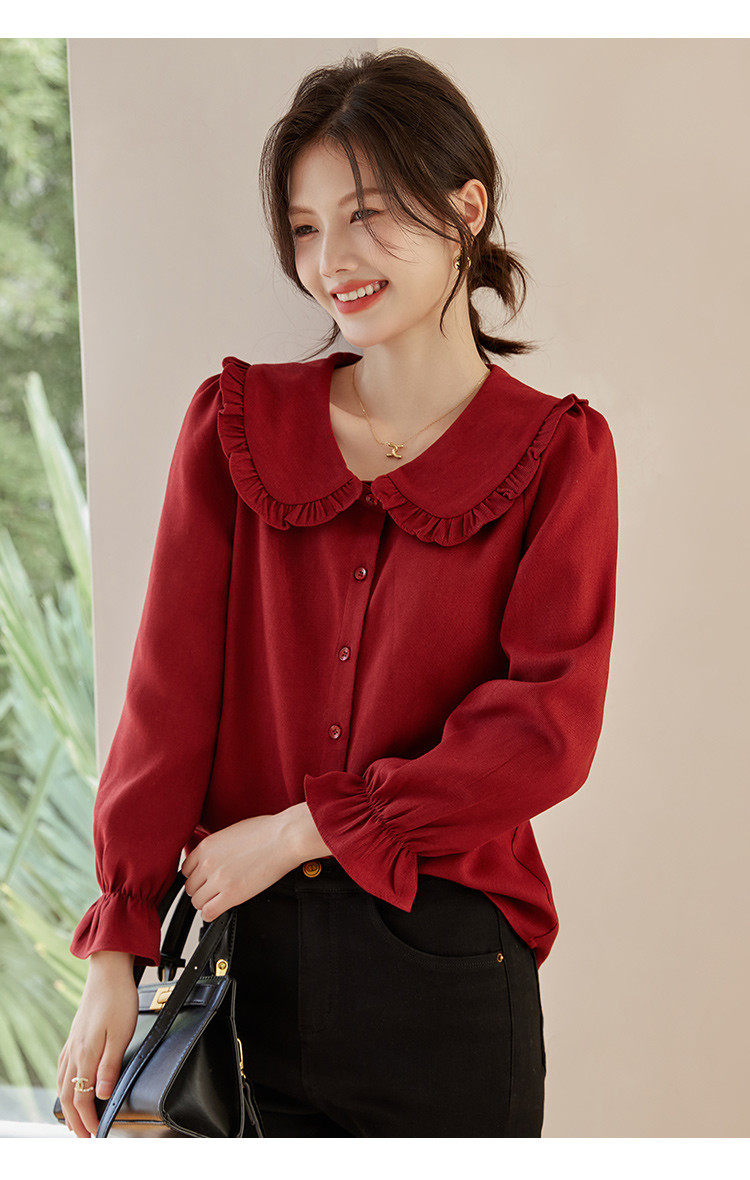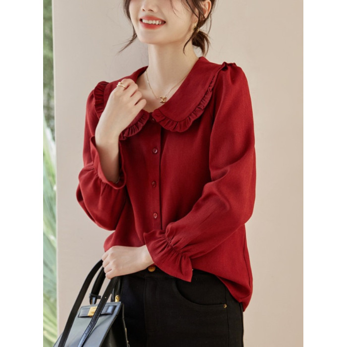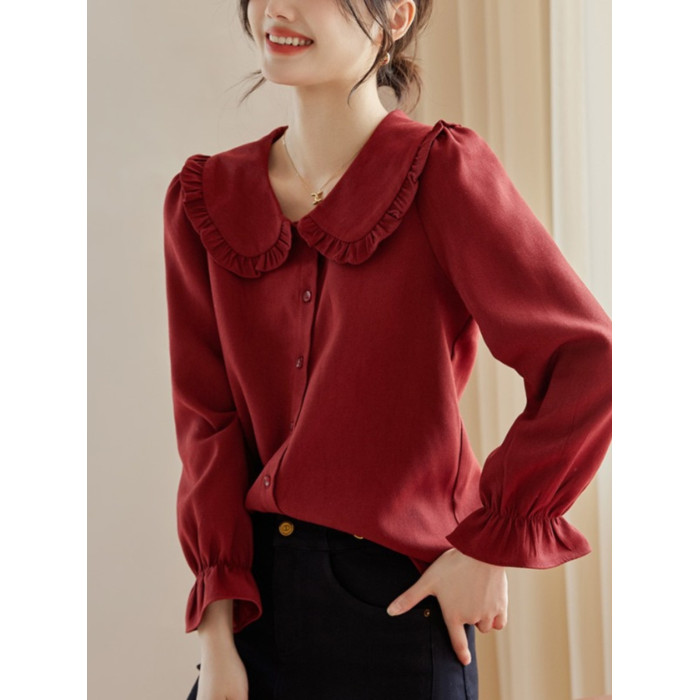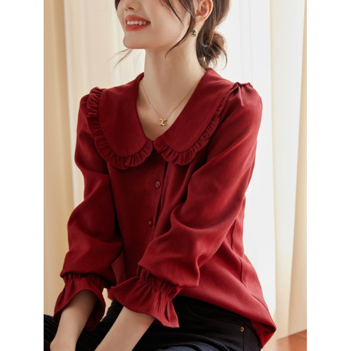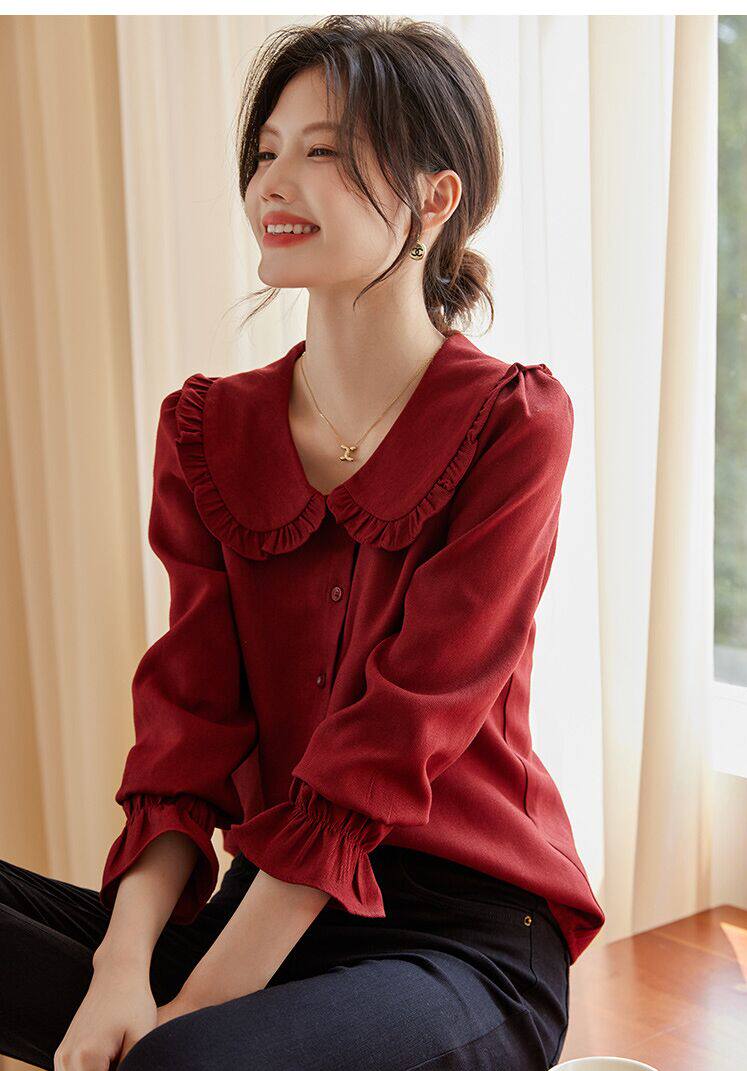 娃娃領復古風襯衫2025秋冬季新款時尚喇叭袖休閒百搭新年紅襯衣女