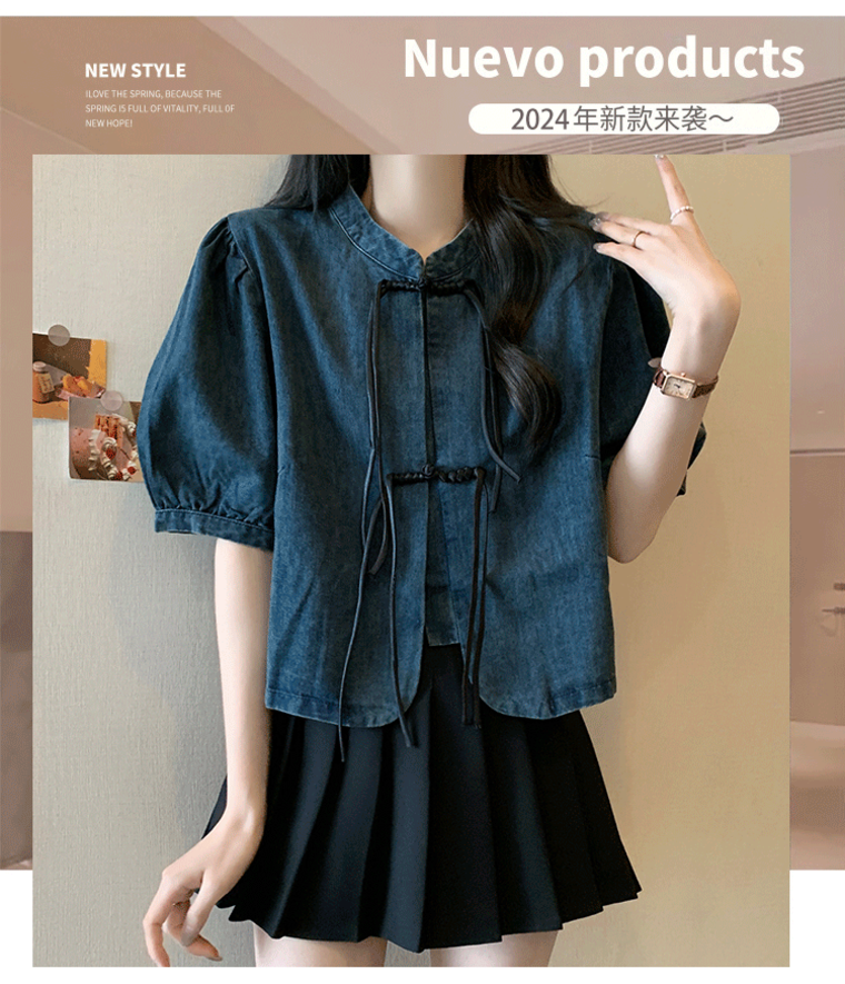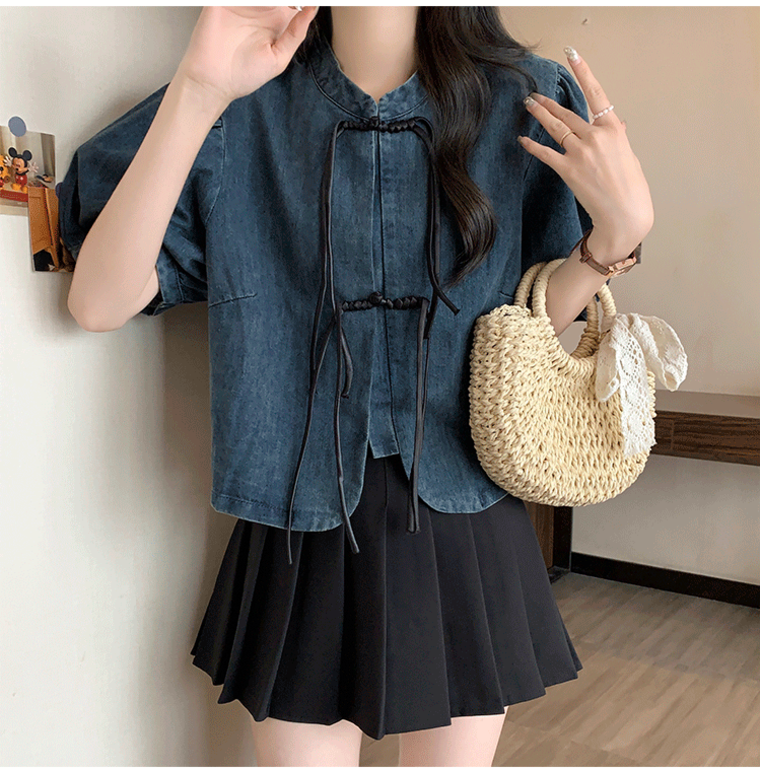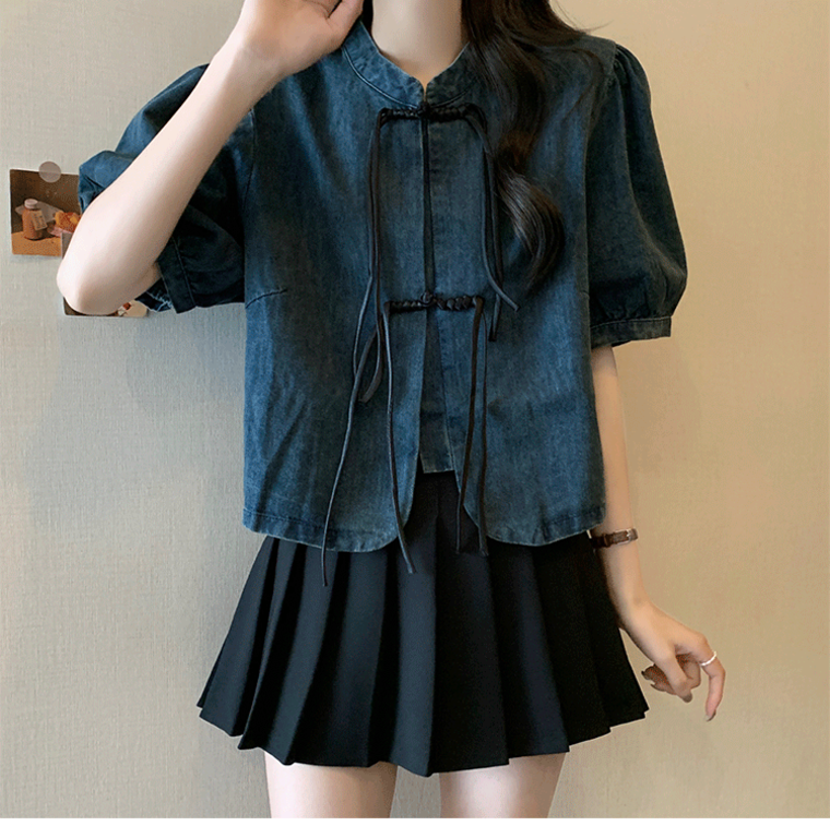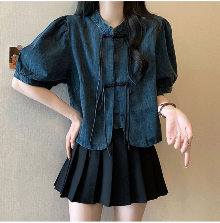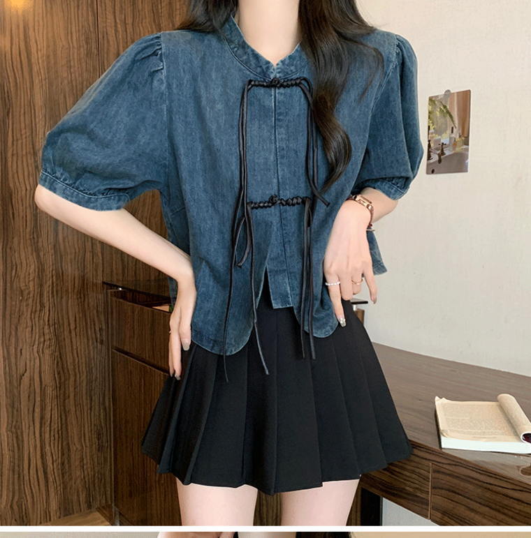新中式復古短袖牛仔襯衫女夏裝大碼微胖mm顯瘦設計感國風盤釦上衣