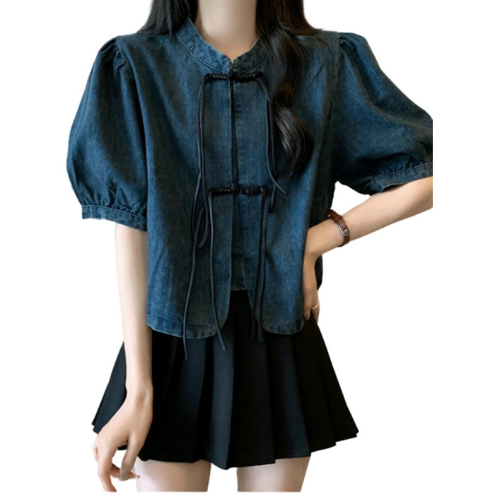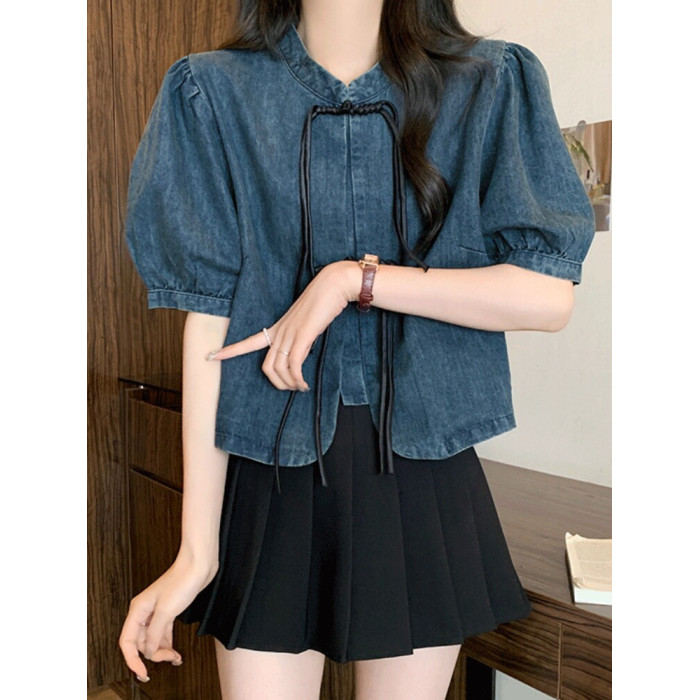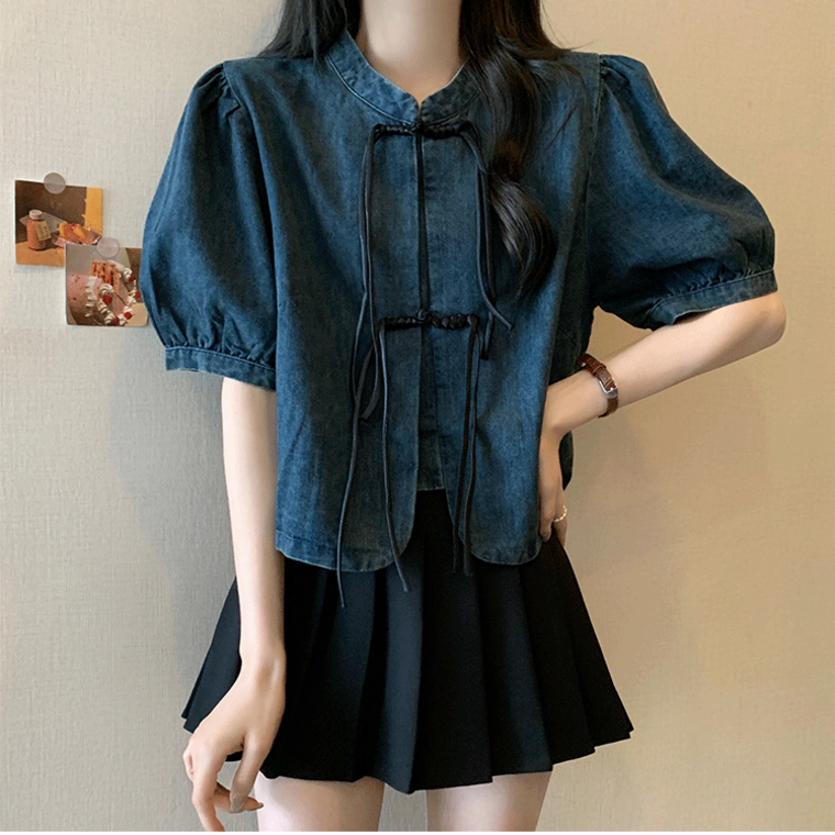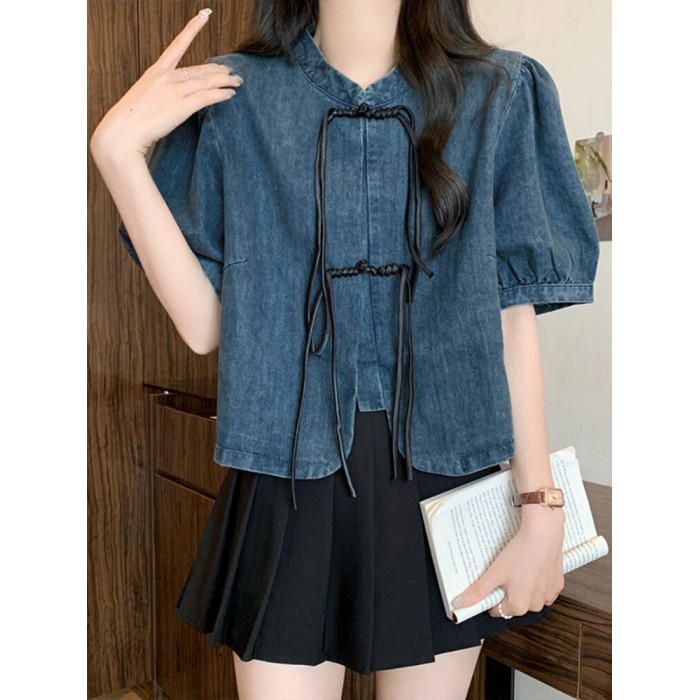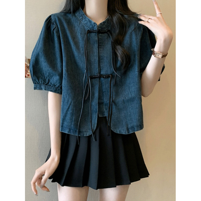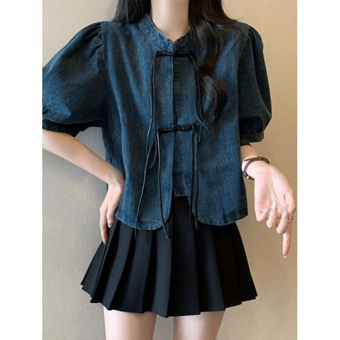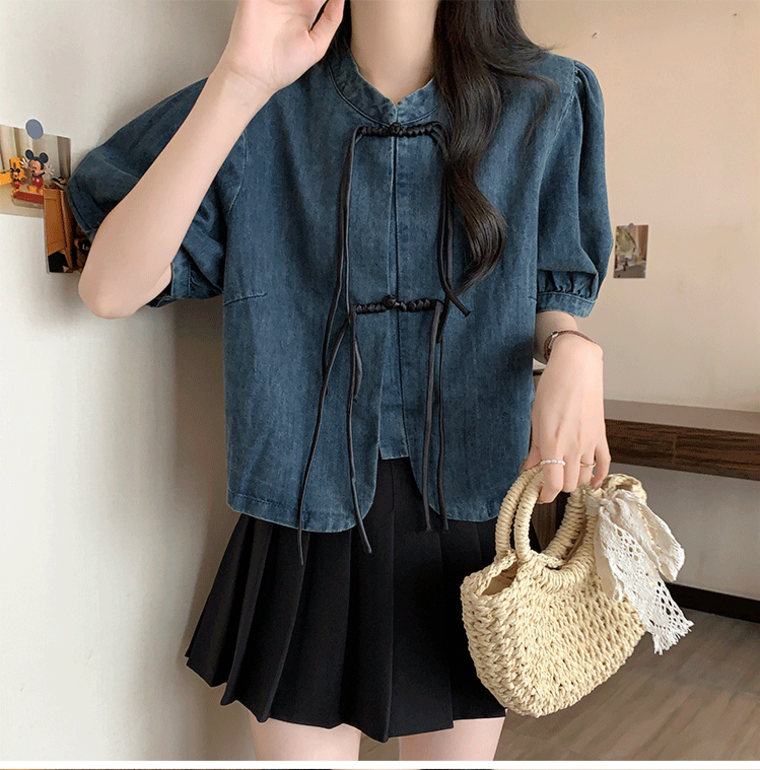 新中式復古短袖牛仔襯衫女夏裝大碼微胖mm顯瘦設計感國風盤釦上衣