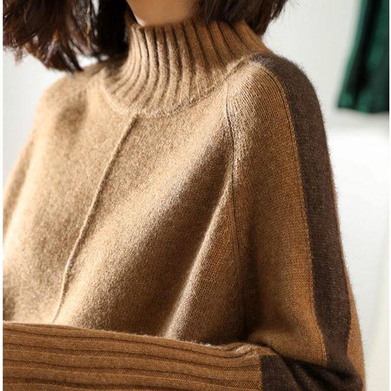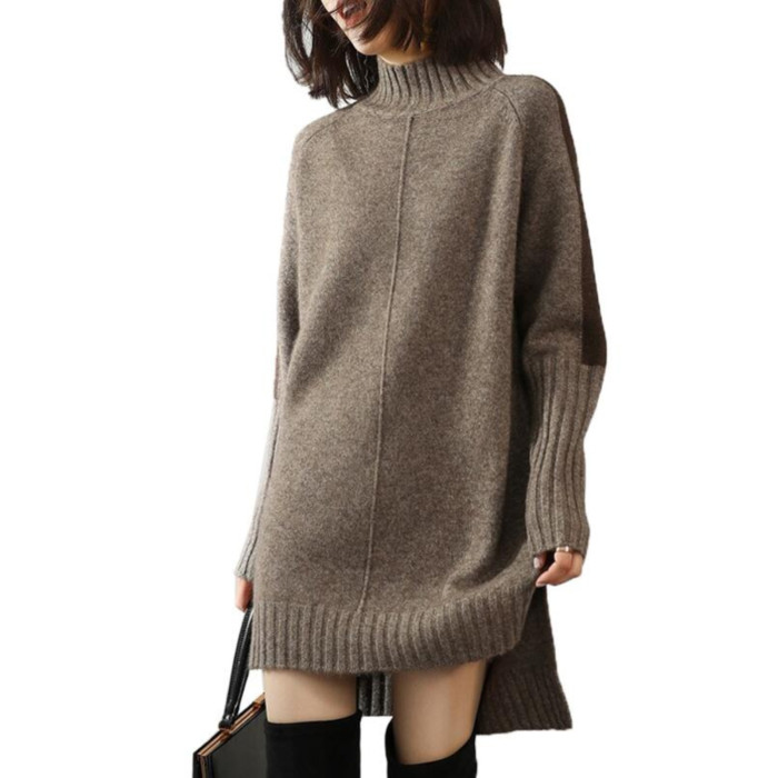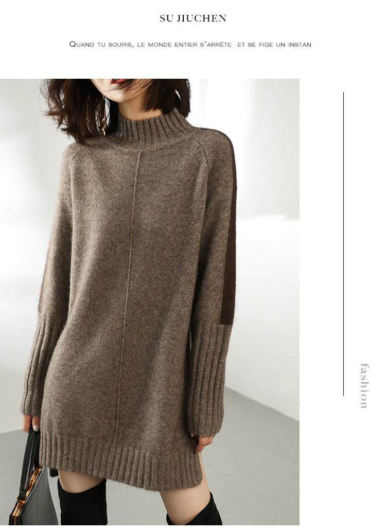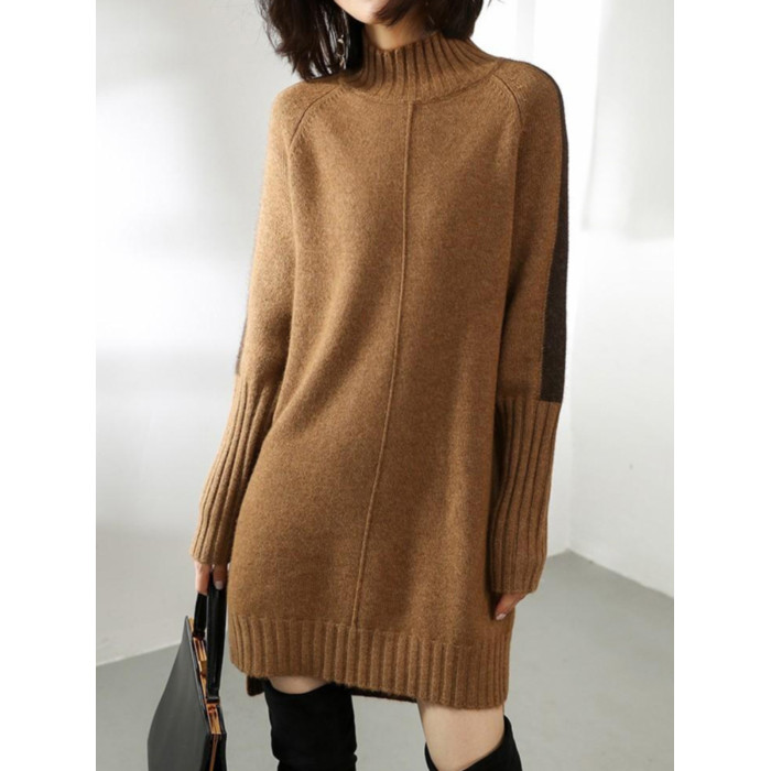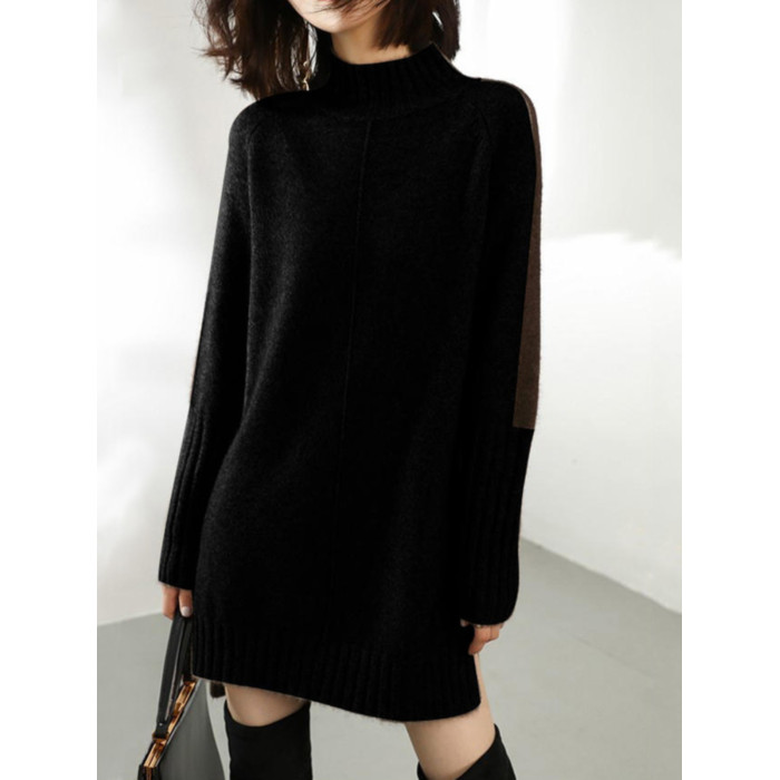 歐貨半高領毛衣連衣裙女25秋冬加厚寬鬆拼色針織打底衫外穿上衣