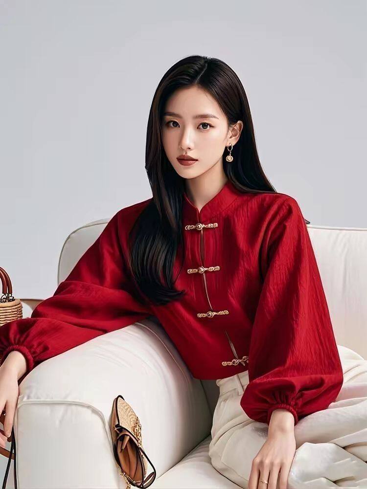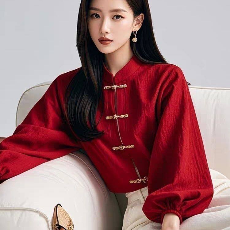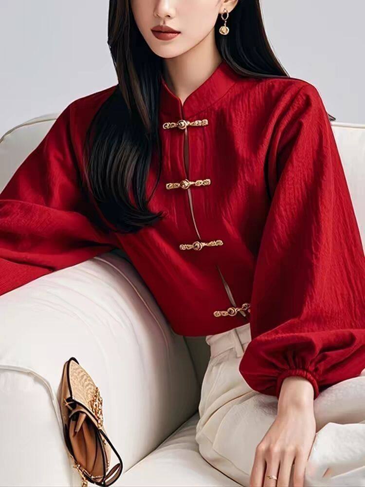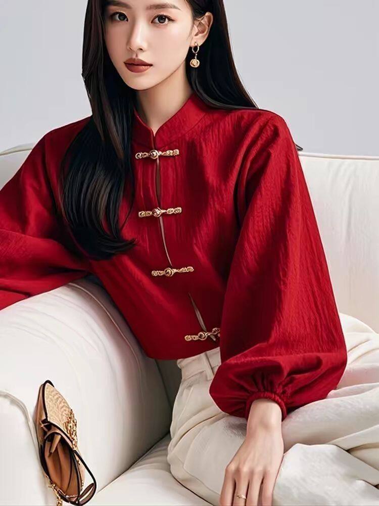 新中式國風紅色燈籠袖盤釦襯衫女春秋季2025年氣質小衫