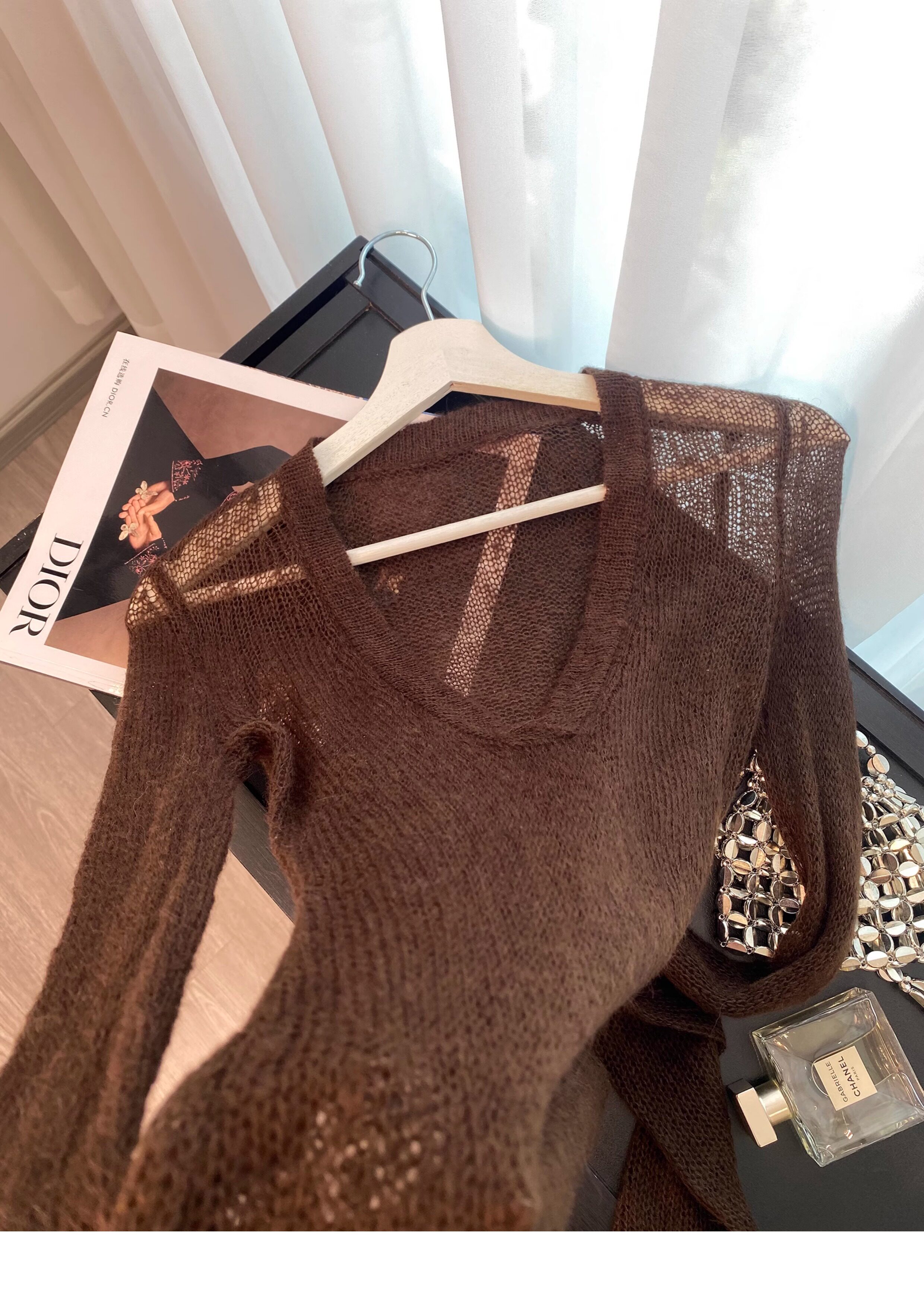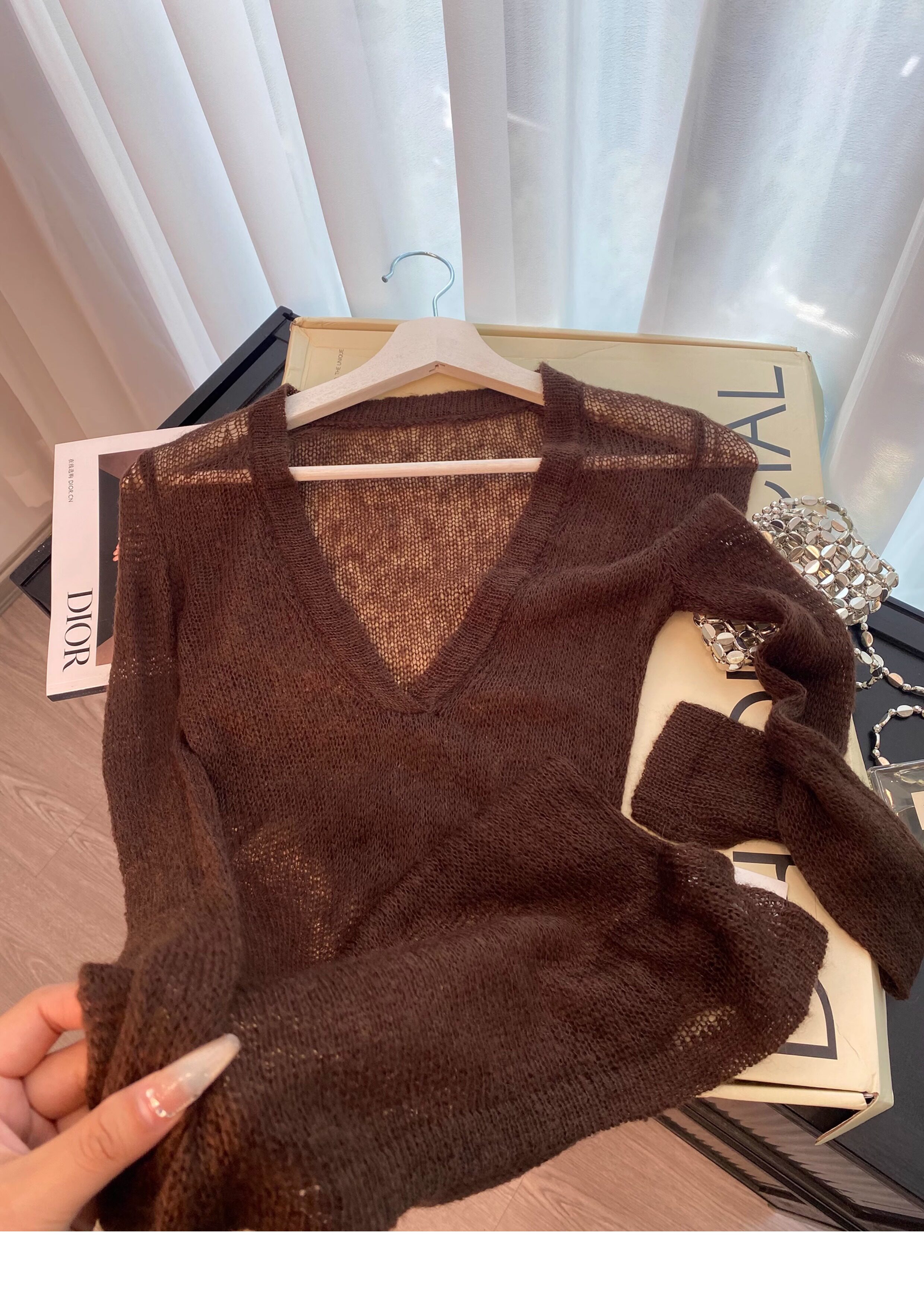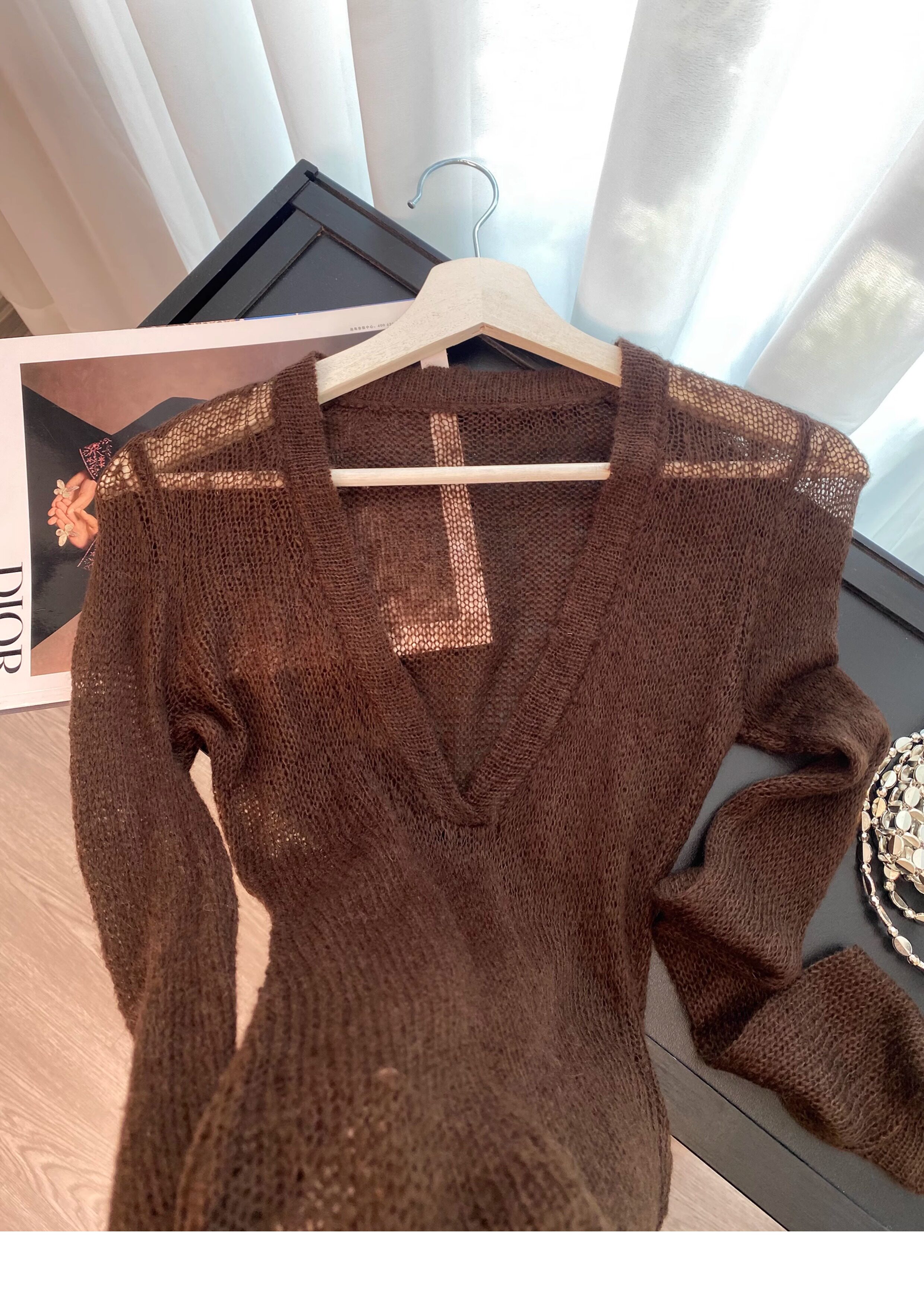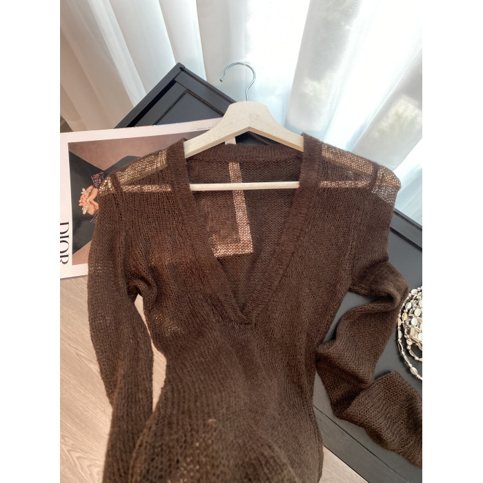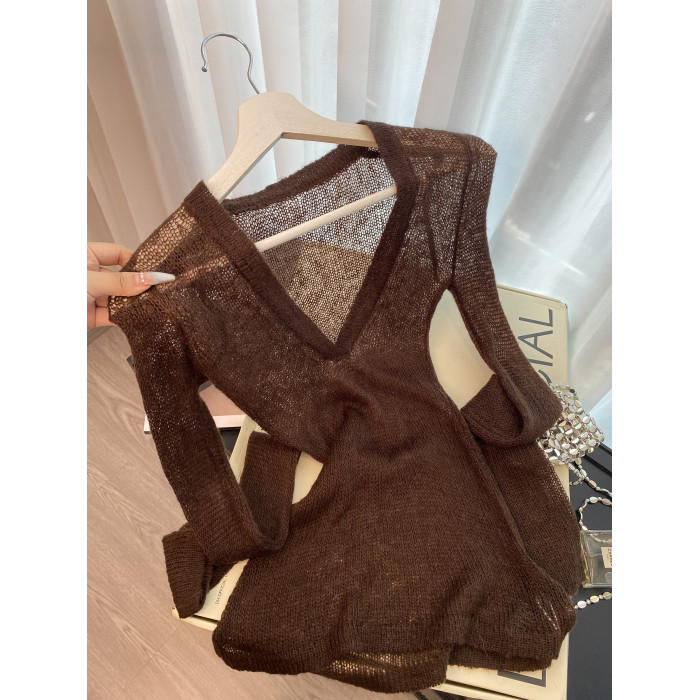 復古咖色V領針織防曬罩衫女夏季新款高級感松弛老錢百搭長袖上衣