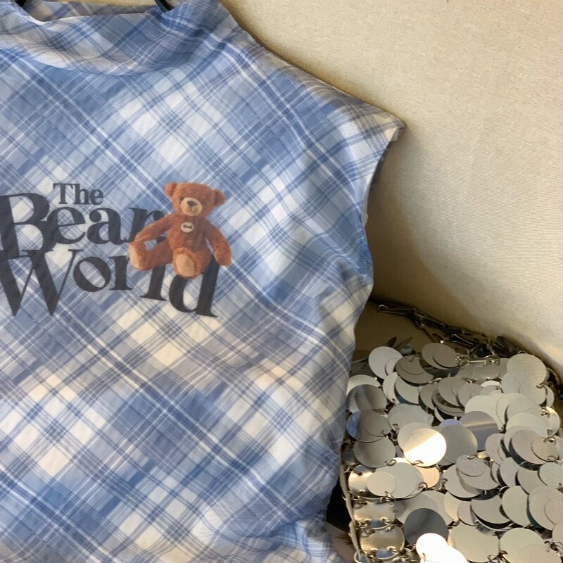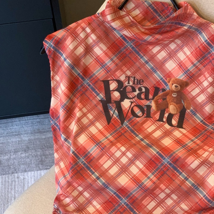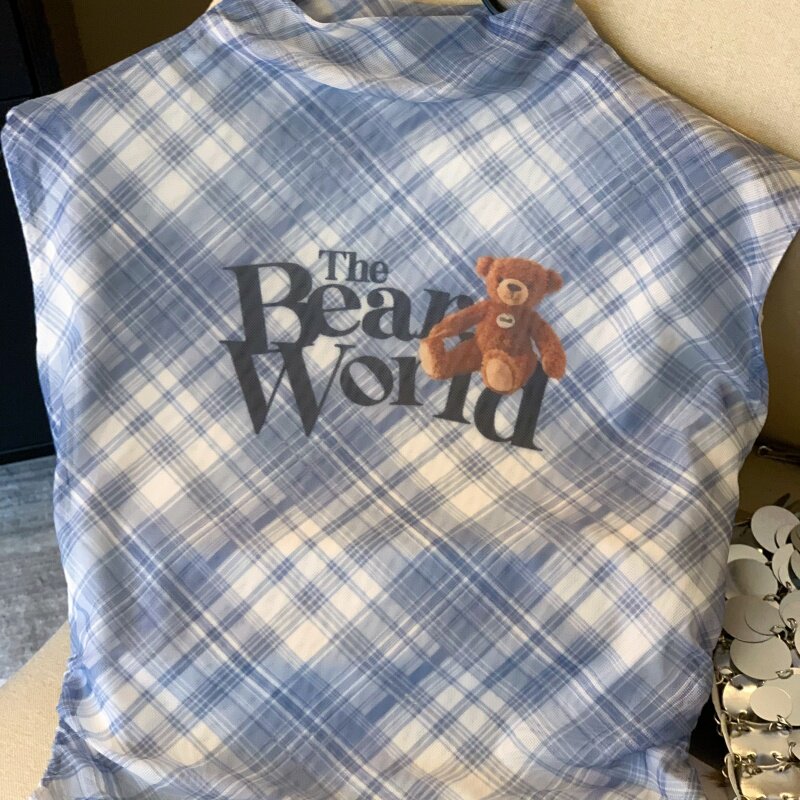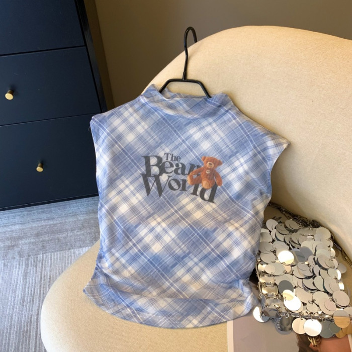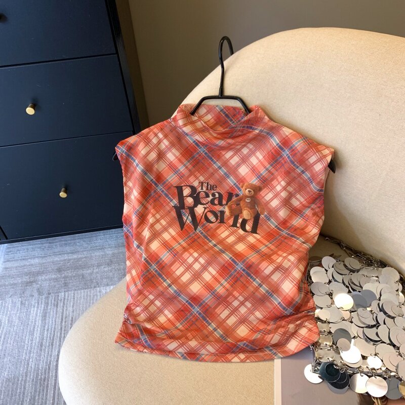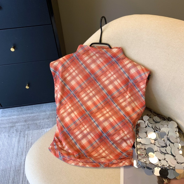 專櫃撤廻剪標美式辣妹格子半高領無袖背心女夏季新款別致短款上衣