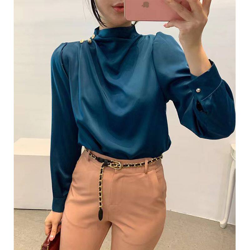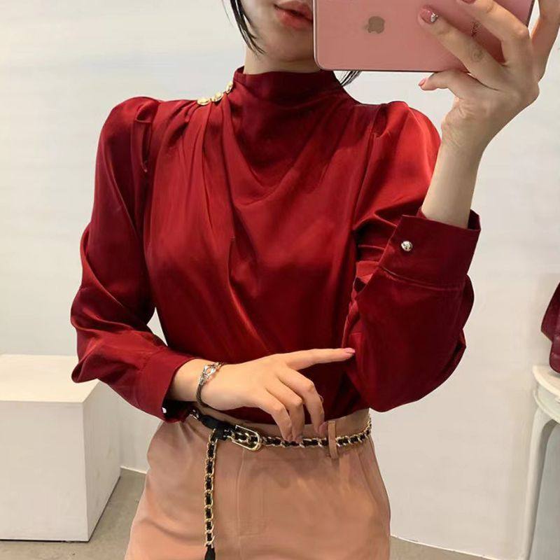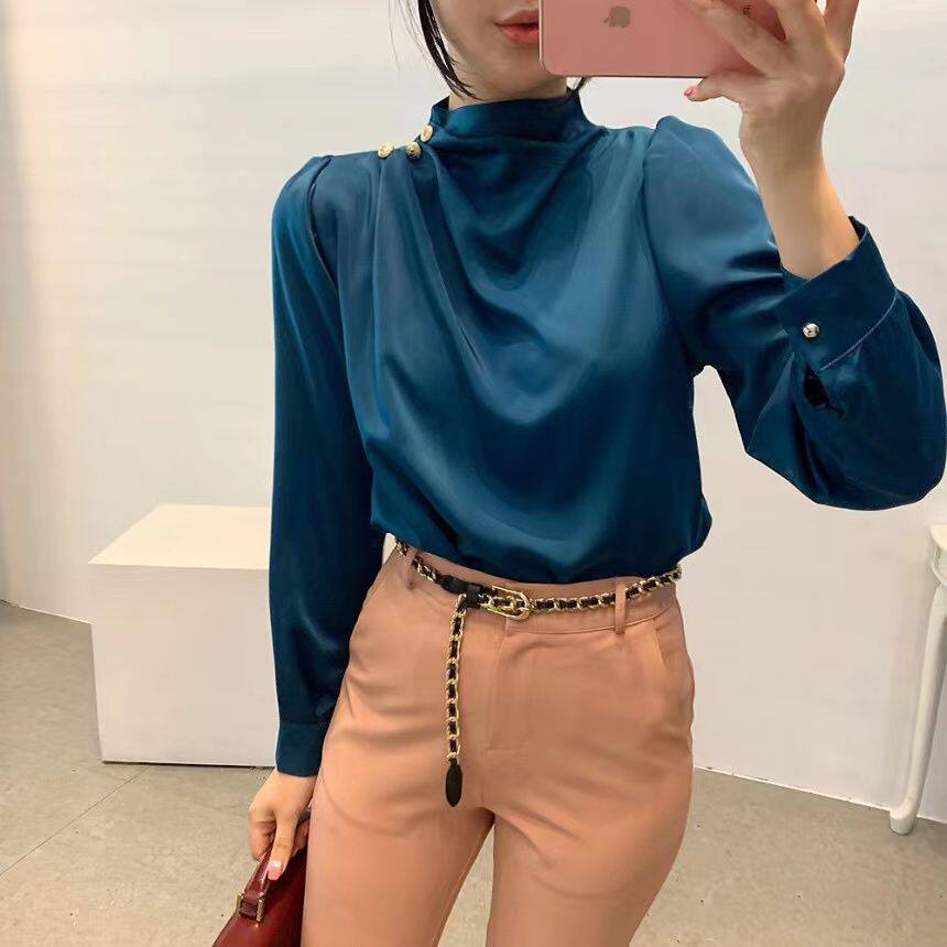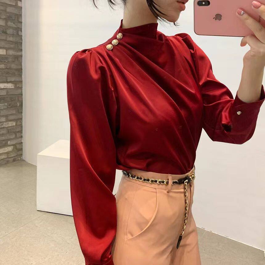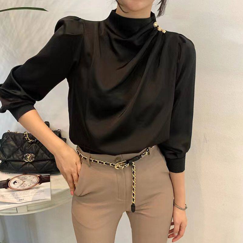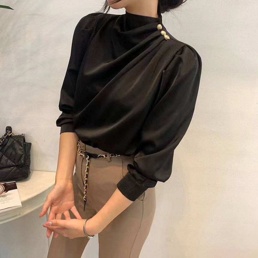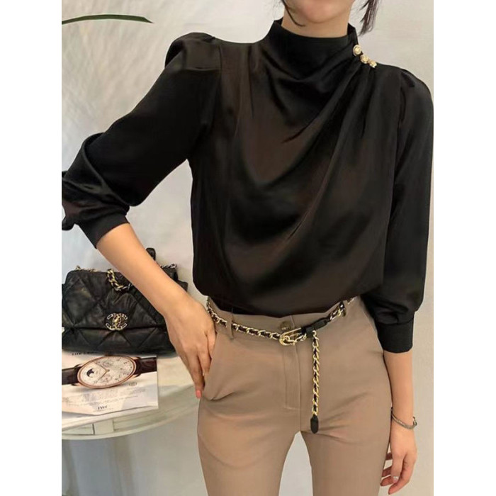 2025秋季薄款優雅氣質緞面高領側邊紐釦設計上衣女通勤輕熟風襯衫