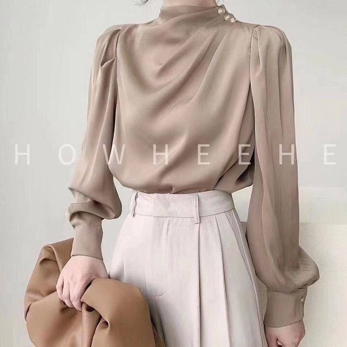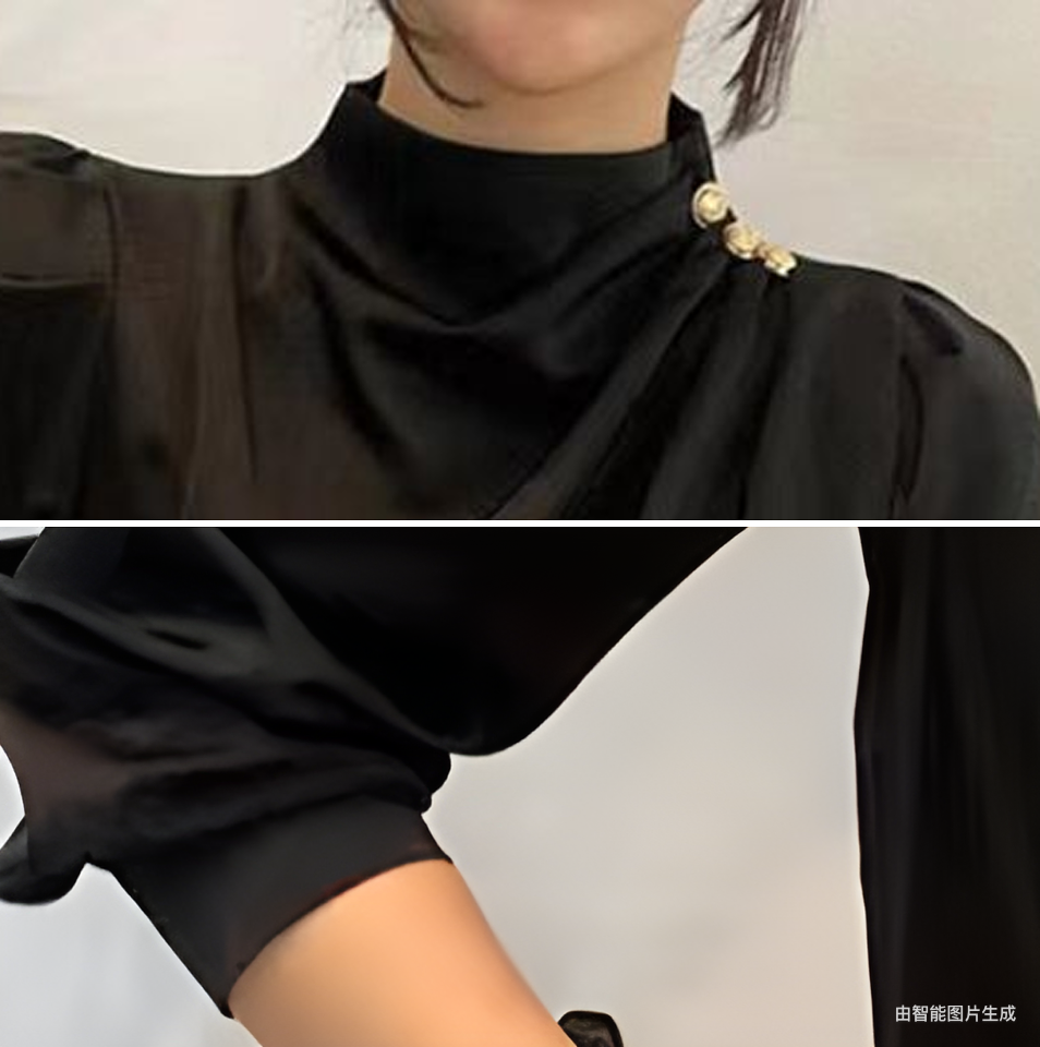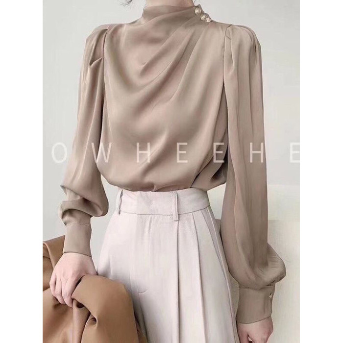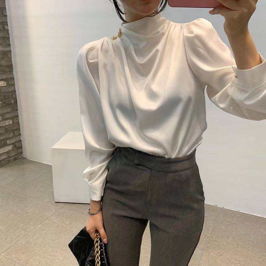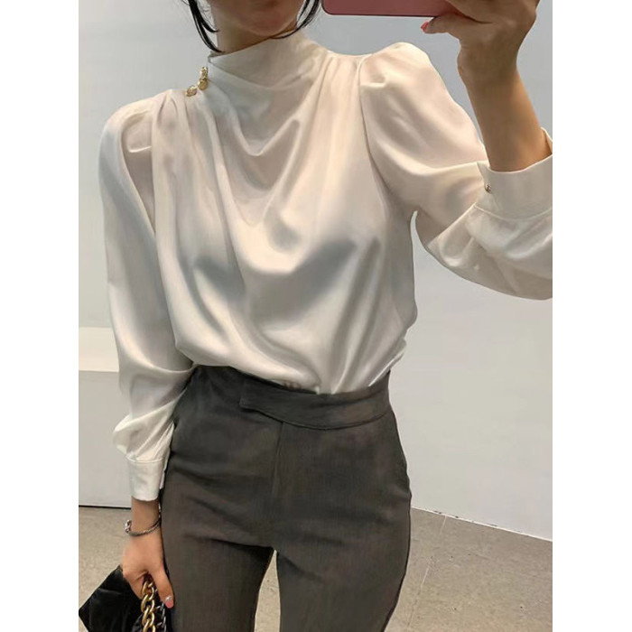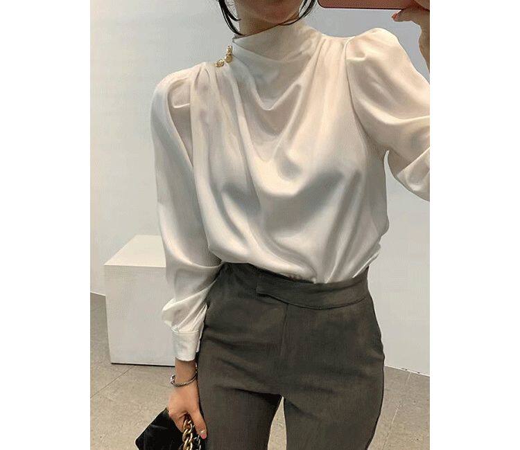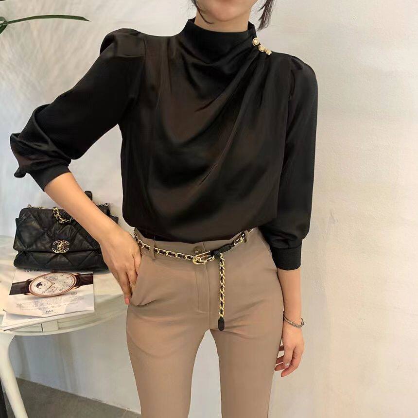 2025秋季薄款優雅氣質緞面高領側邊紐釦設計上衣女通勤輕熟風襯衫