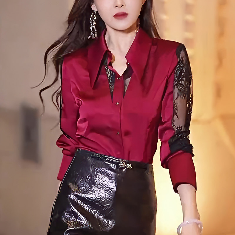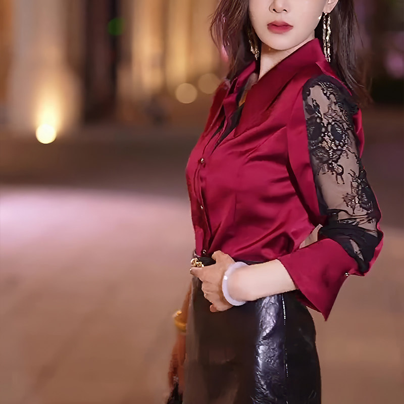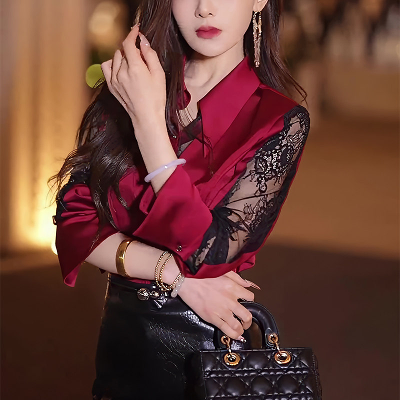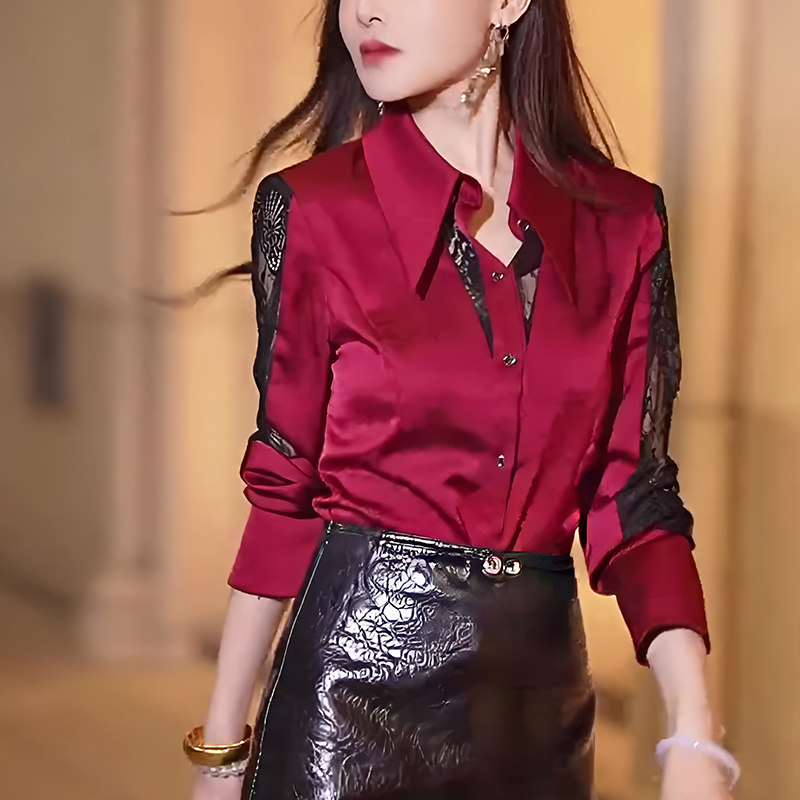 蕾絲拼接輕奢酒紅色襯衫女秋2025高級洋氣設計感獨特別致長袖襯衣