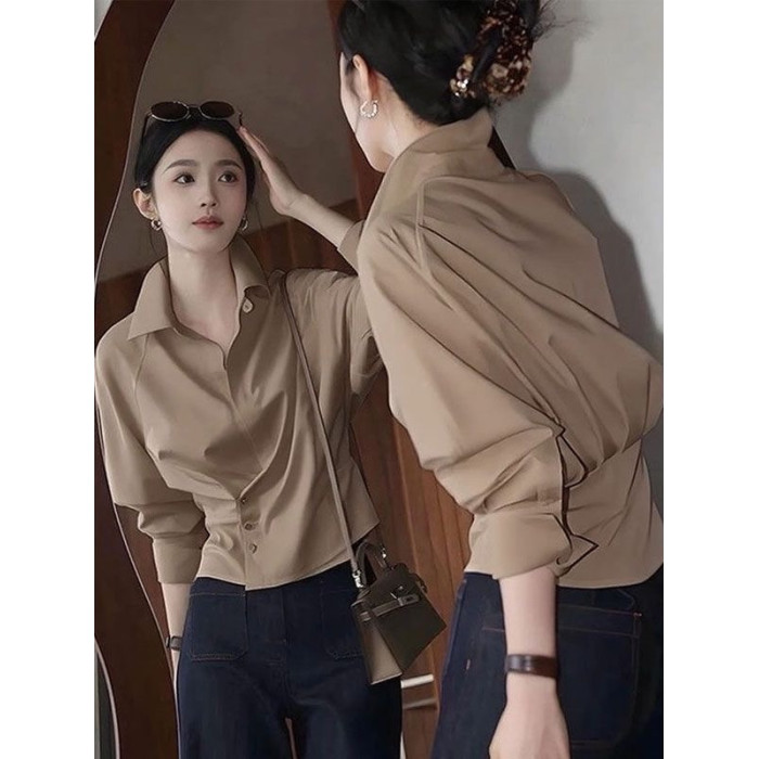 高級感復古咖色繙領長袖襯衫女2025秋季新款時髦洋氣掐腰短款襯衣