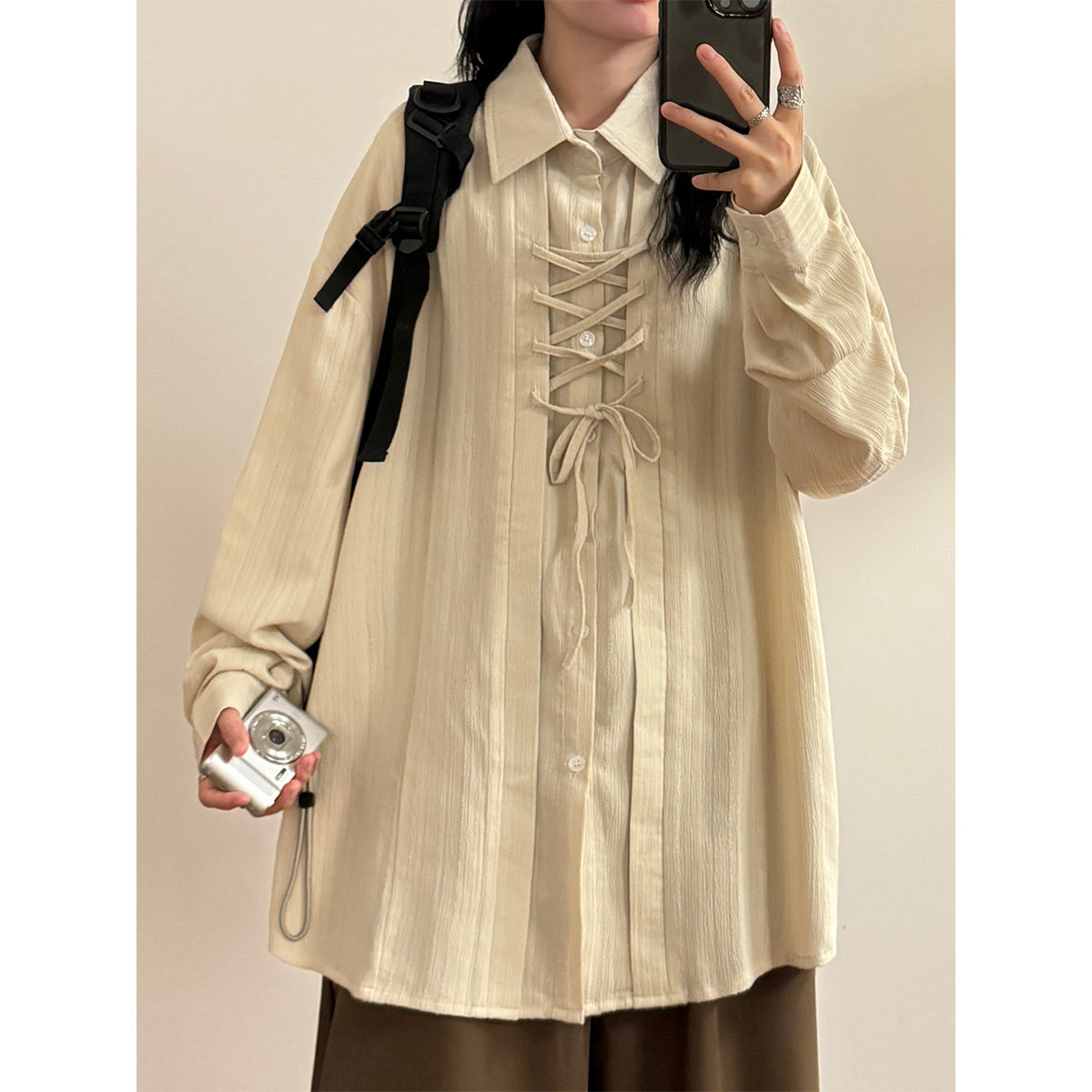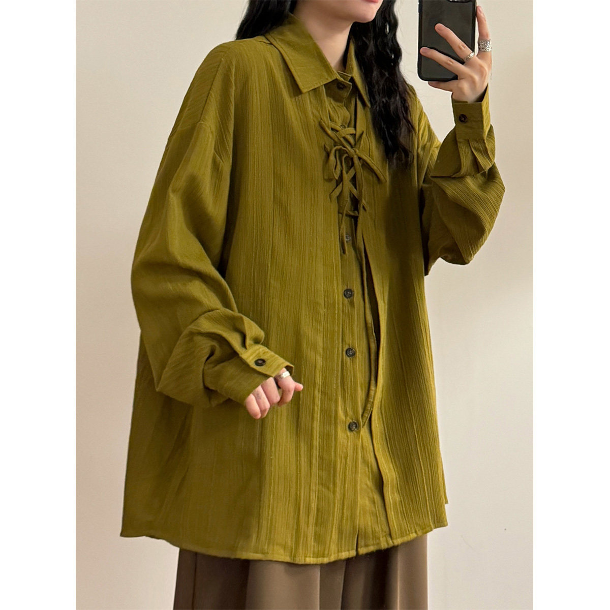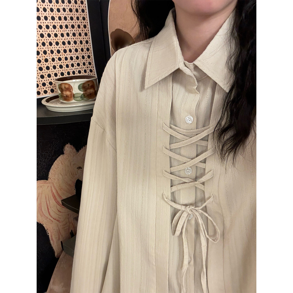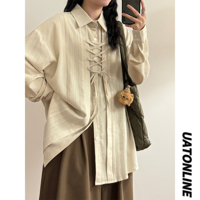 UATONLINE秋季日系休閒高級感交叉綁帶假兩件設計感長袖襯衫上衣
