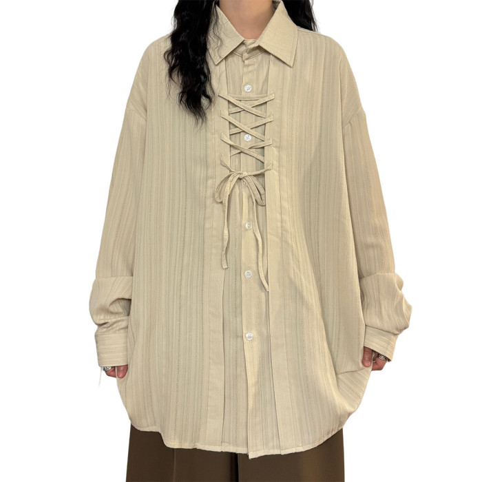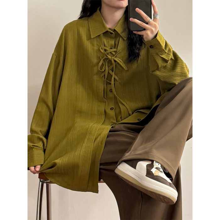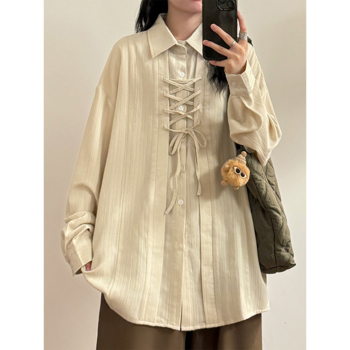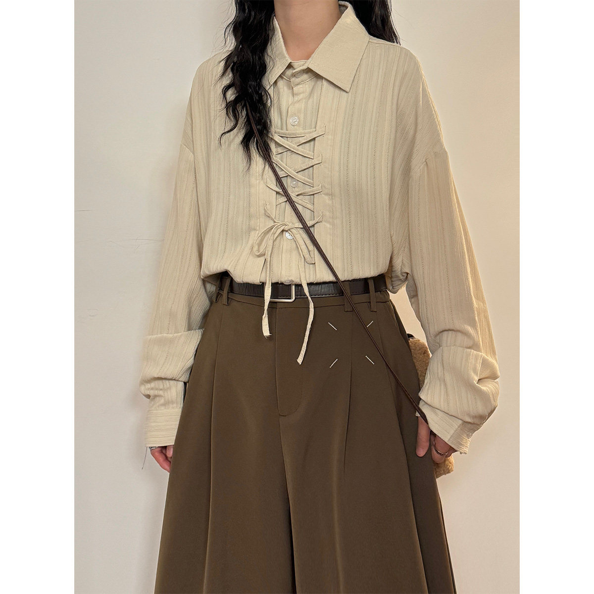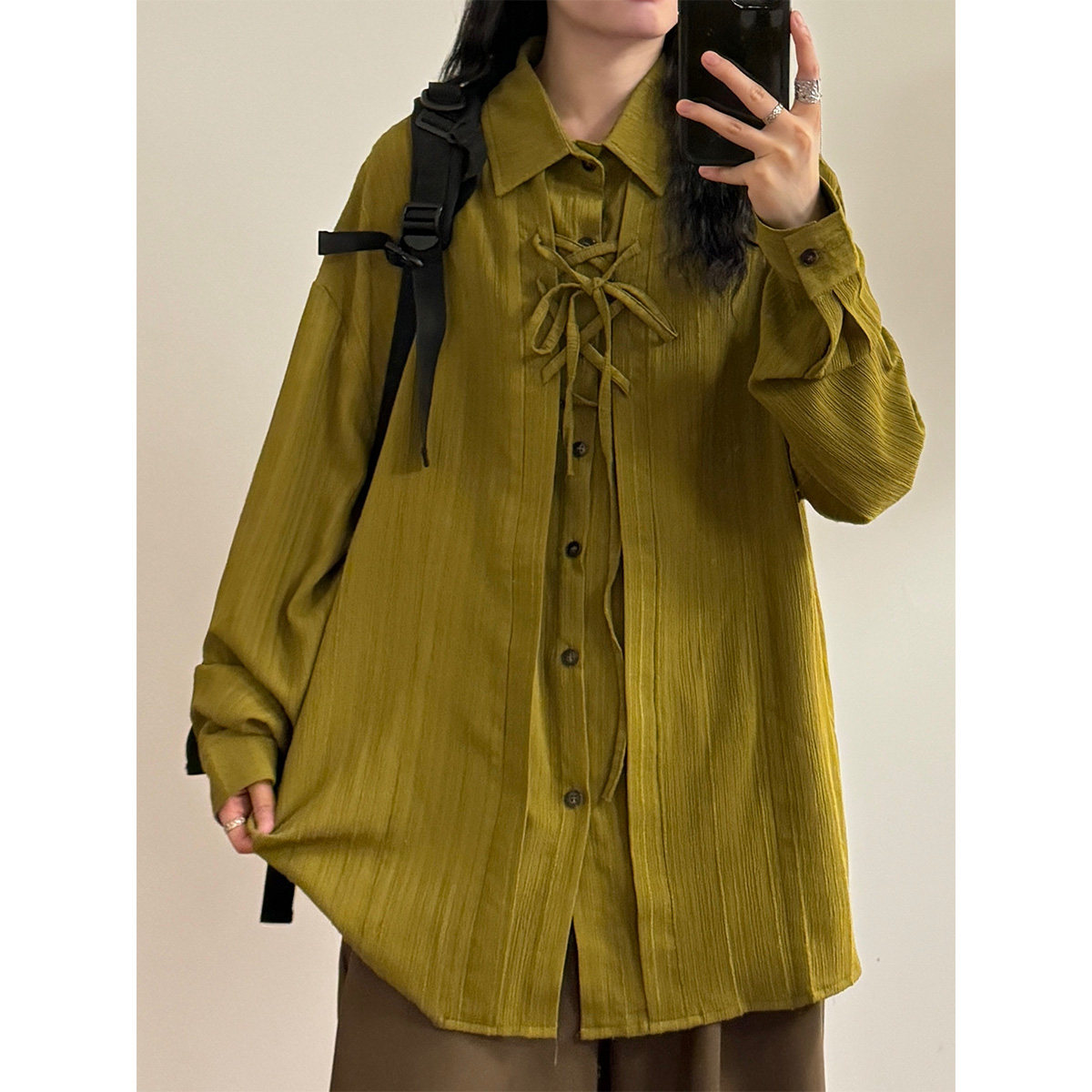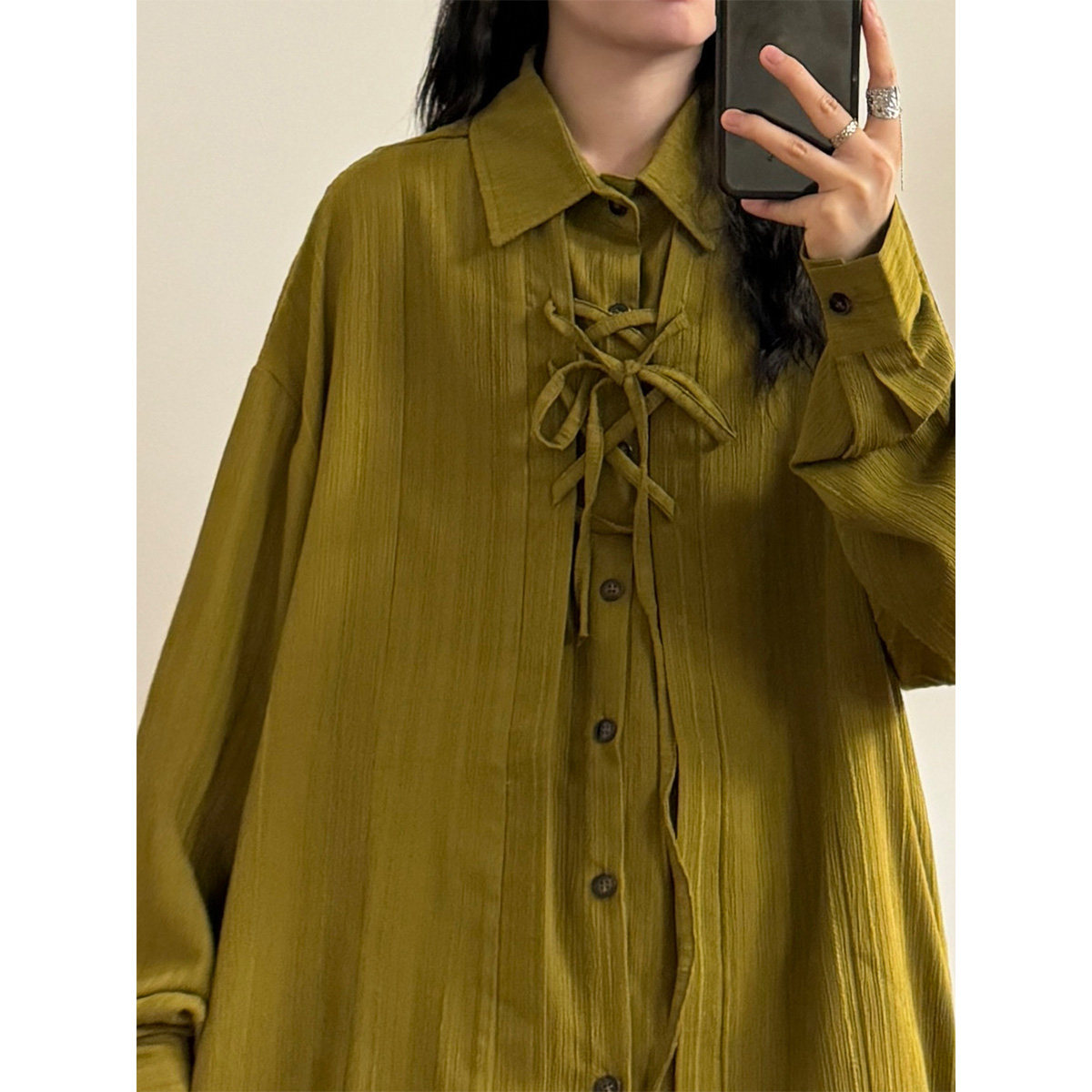 UATONLINE秋季日系休閒高級感交叉綁帶假兩件設計感長袖襯衫上衣