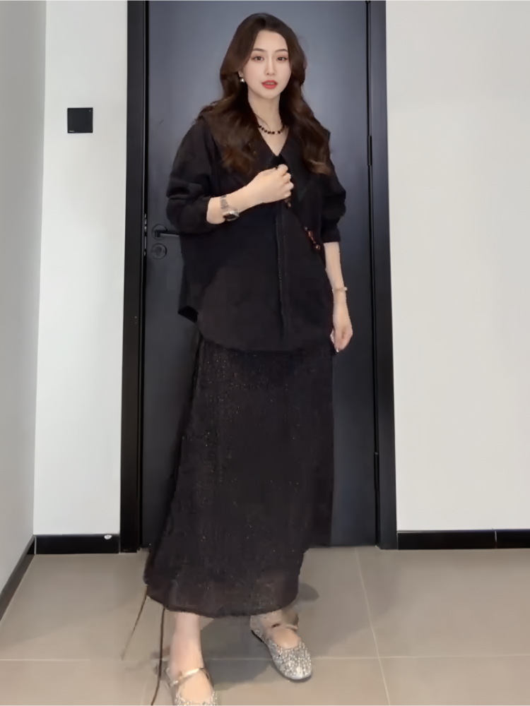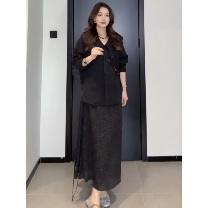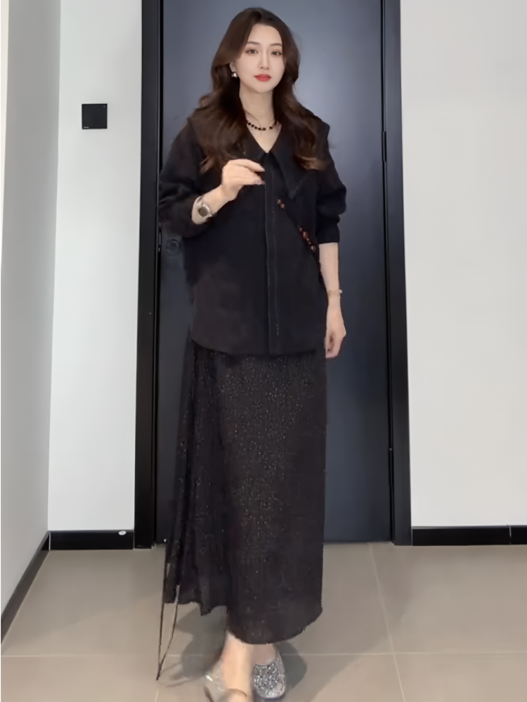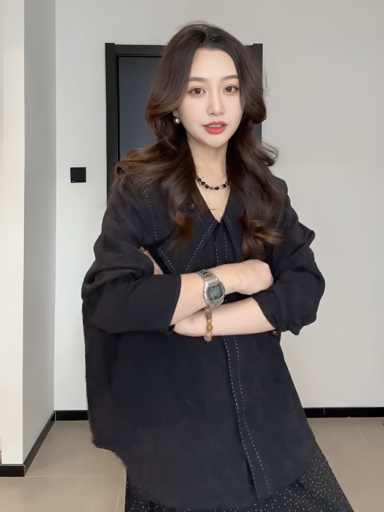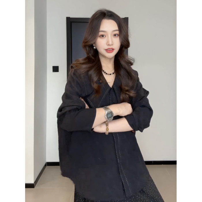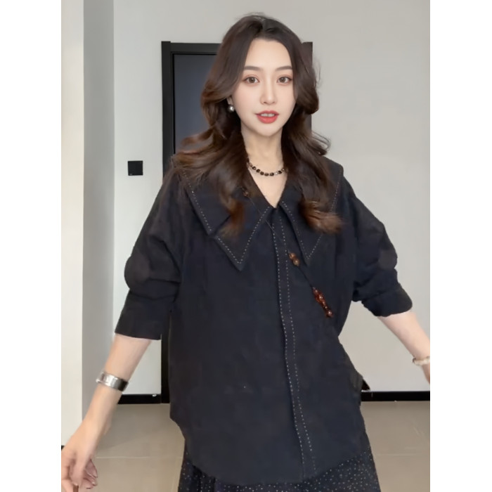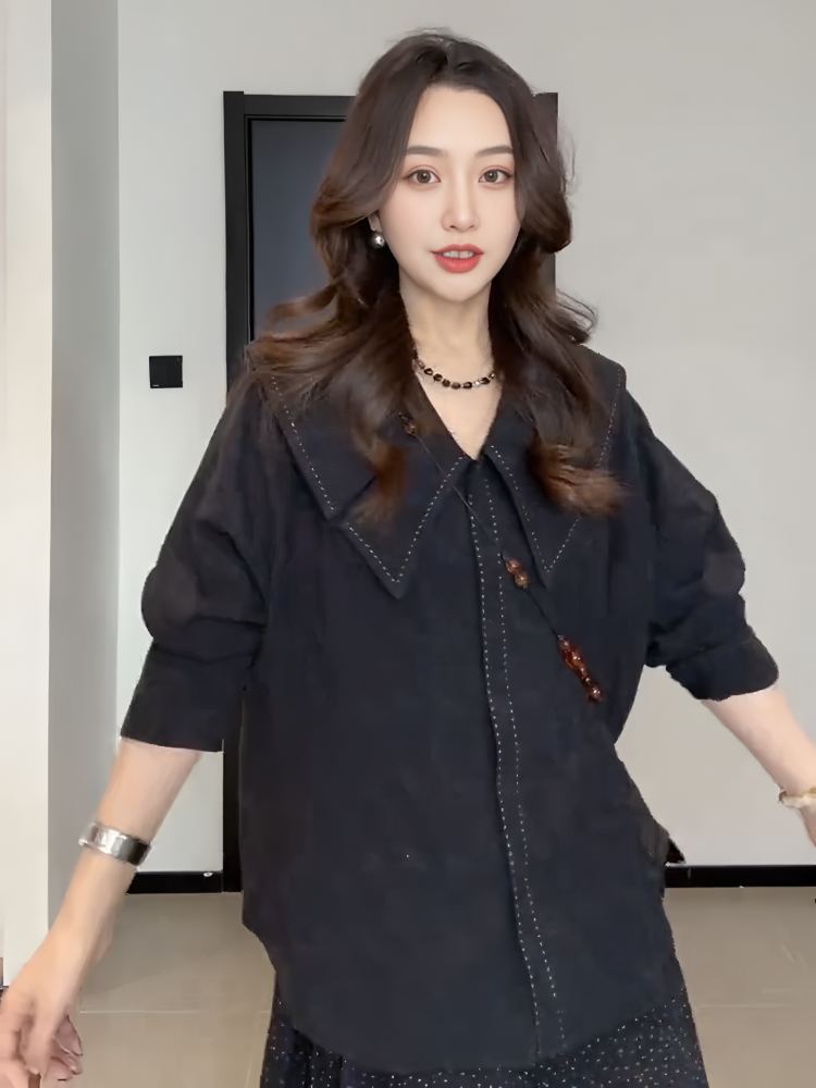 大碼黑色減齡娃娃領襯衫2025超火上衣女秋季胖mm寬鬆顯瘦小衫襯衣
