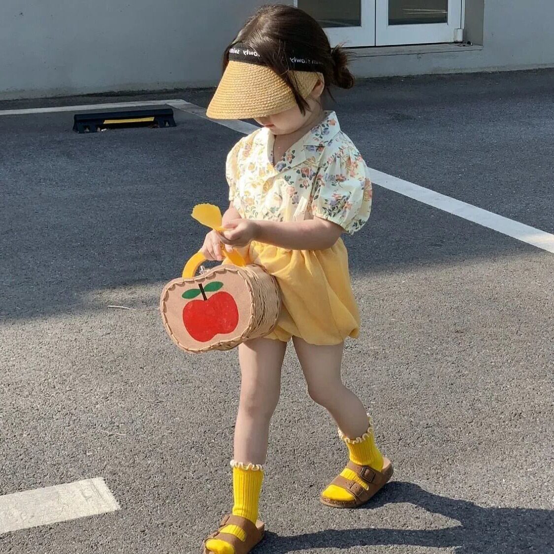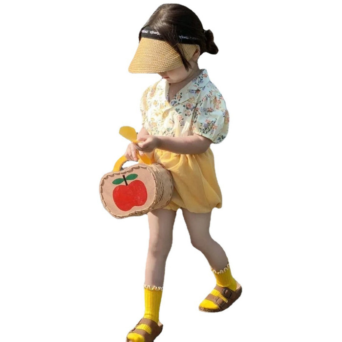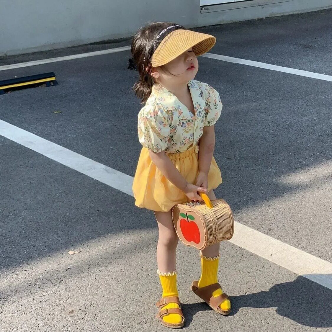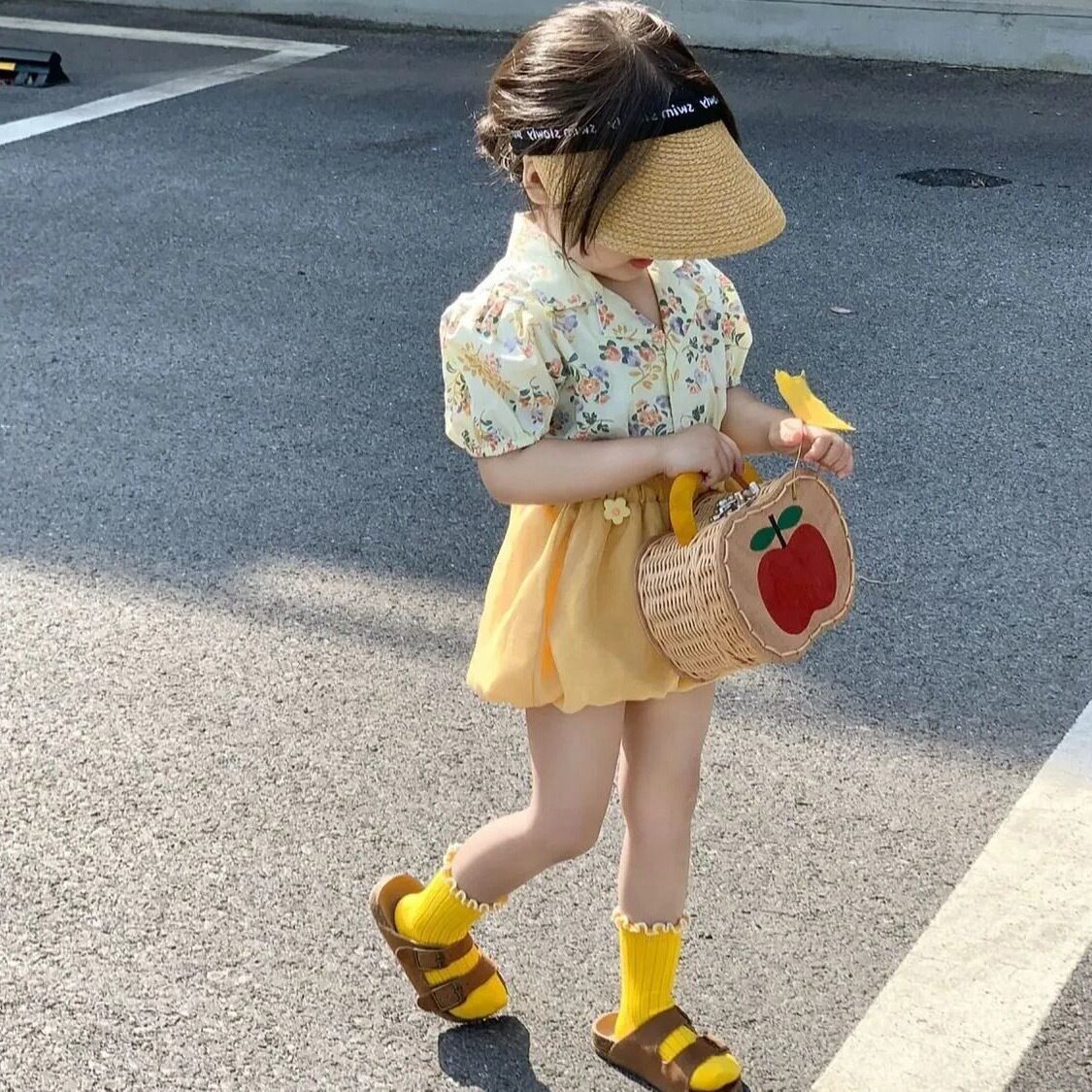 2025夏款韓系女小童炸街款復古碎花繙領襯衫+黃色燈籠褲兩件套裝
