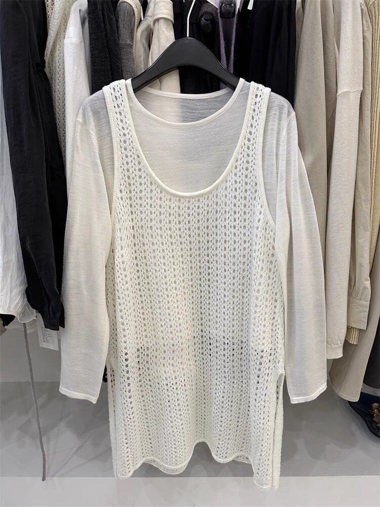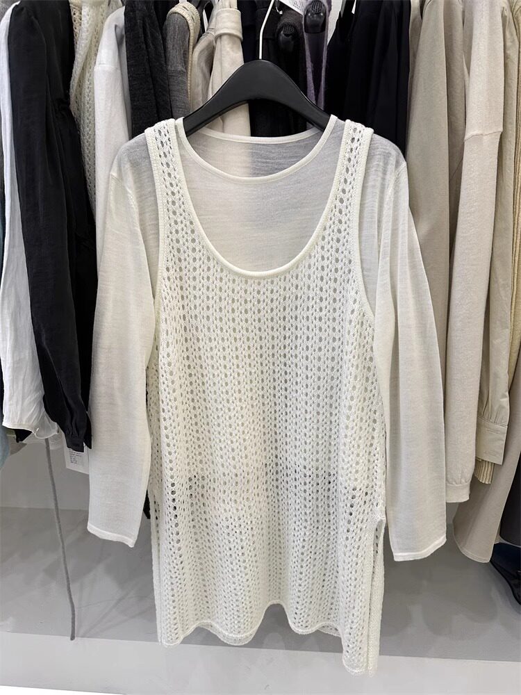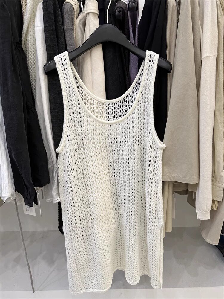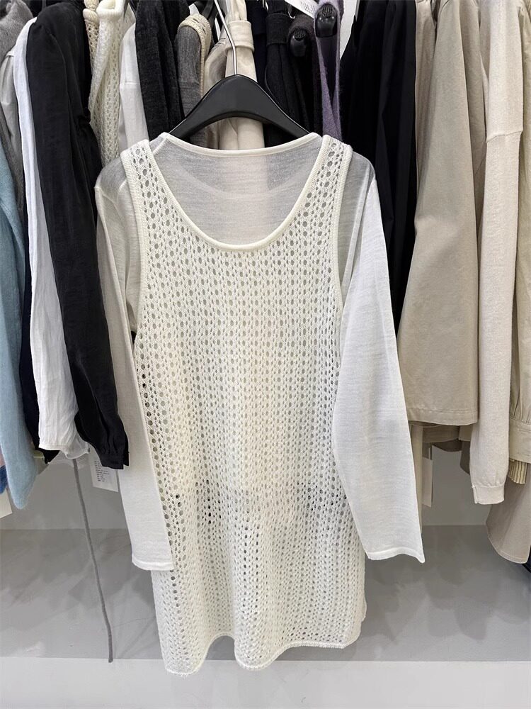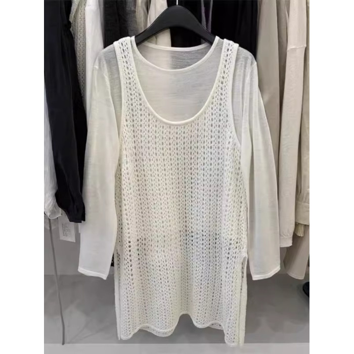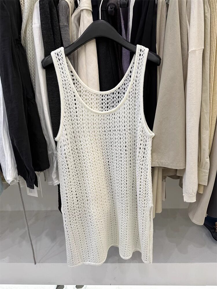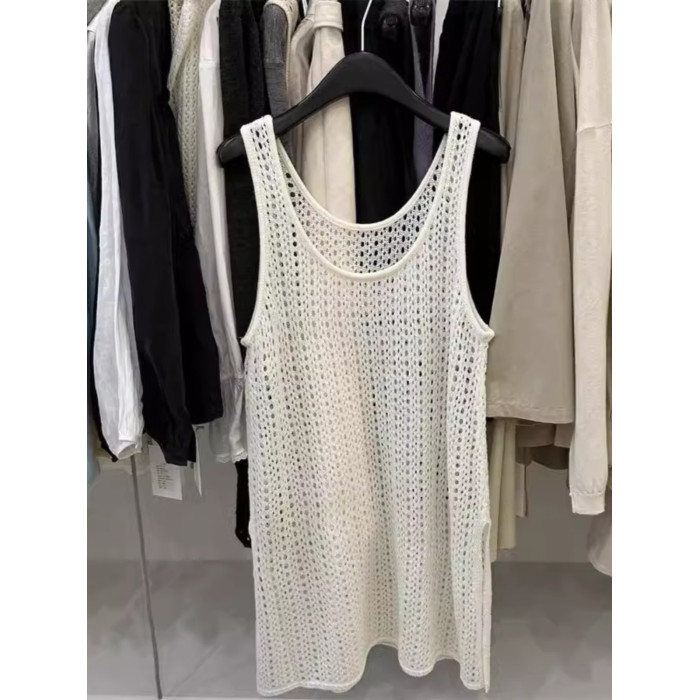 韓國東大門新款白色u領鏤空針織背心裙女春季中長款曡穿罩衫上衣