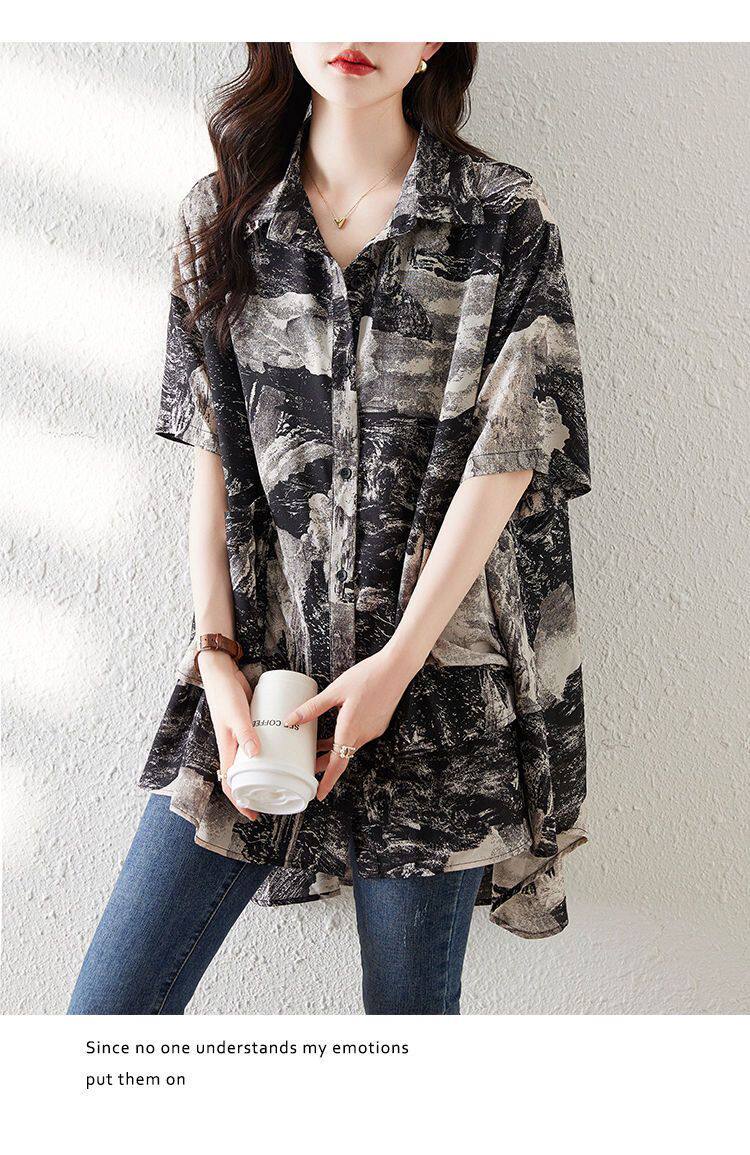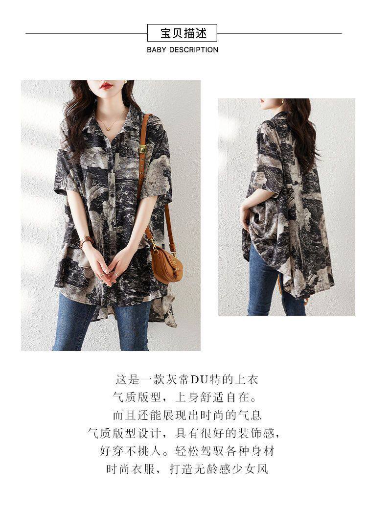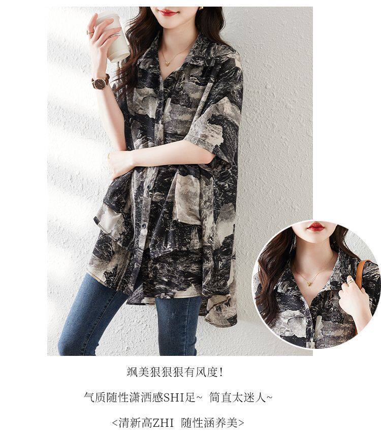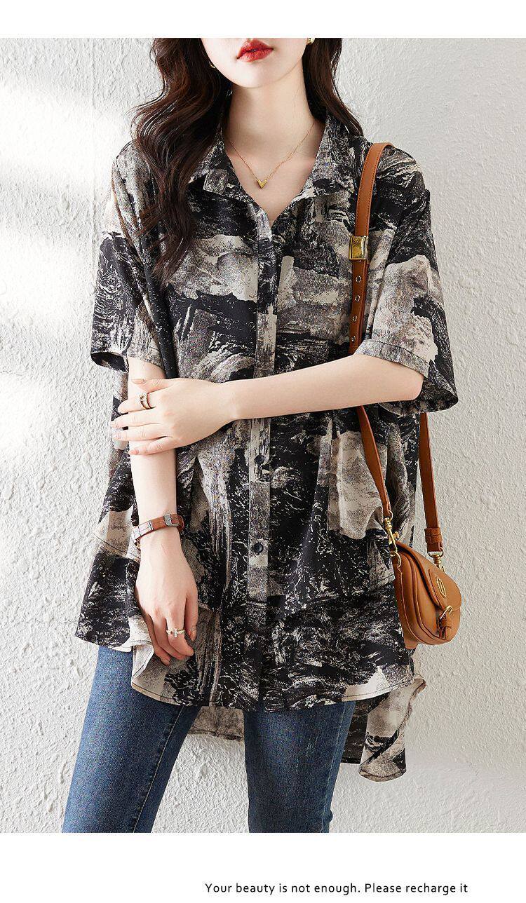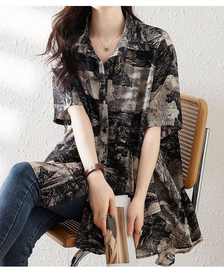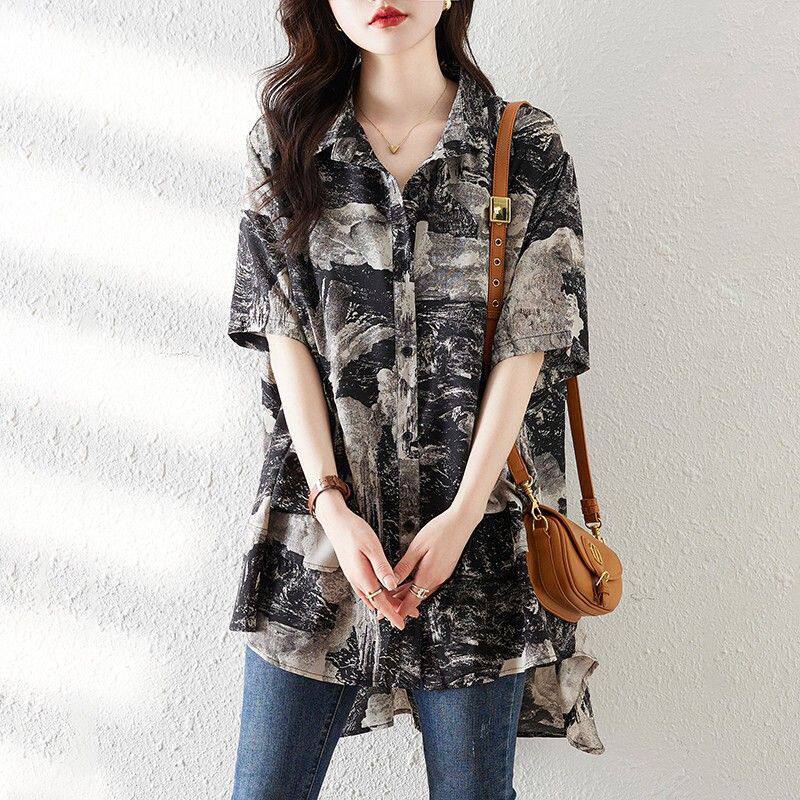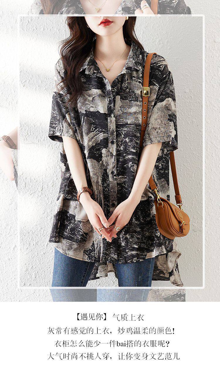 大碼復古印花休閒襯衫女夏裝2025年新款寬鬆遮肚子中長款雪紡上衣
