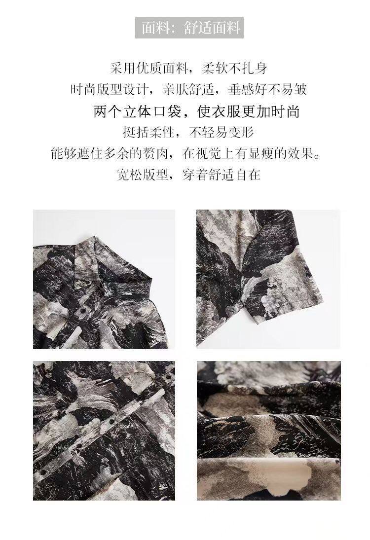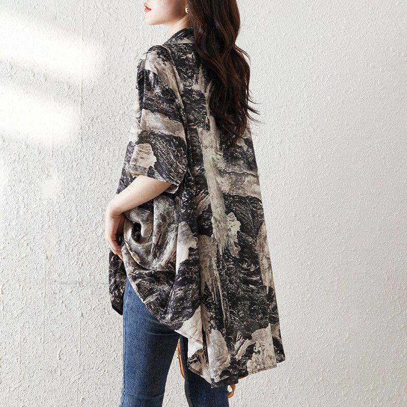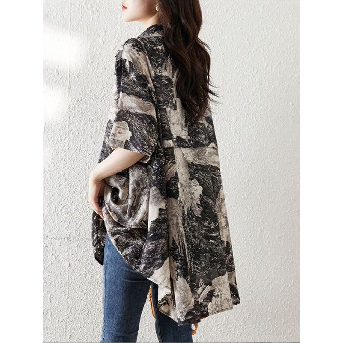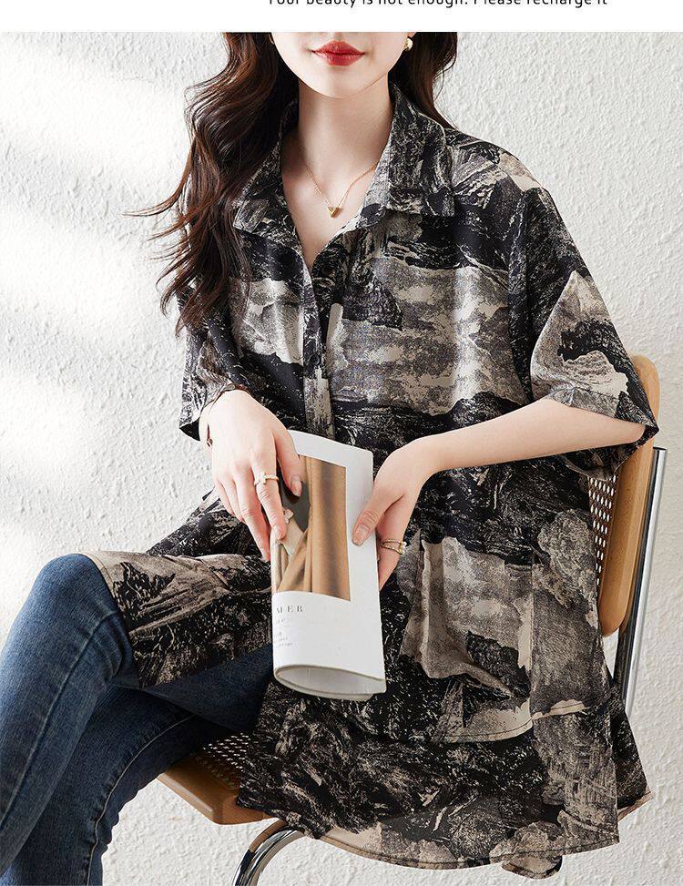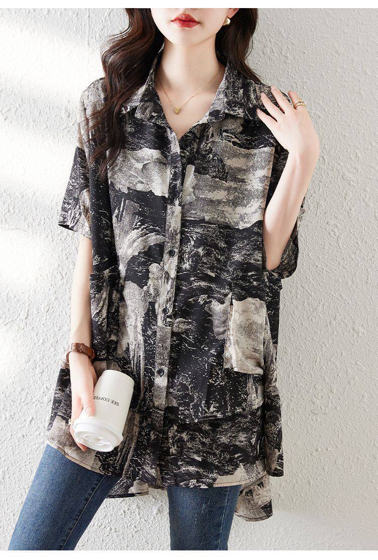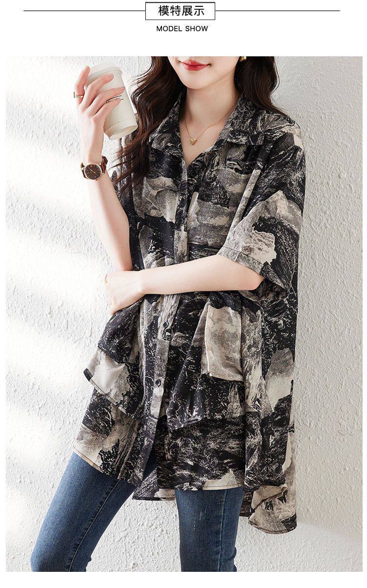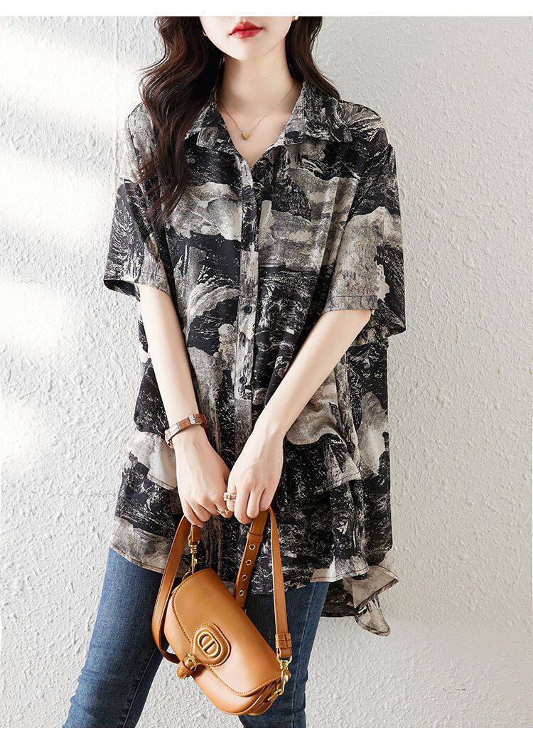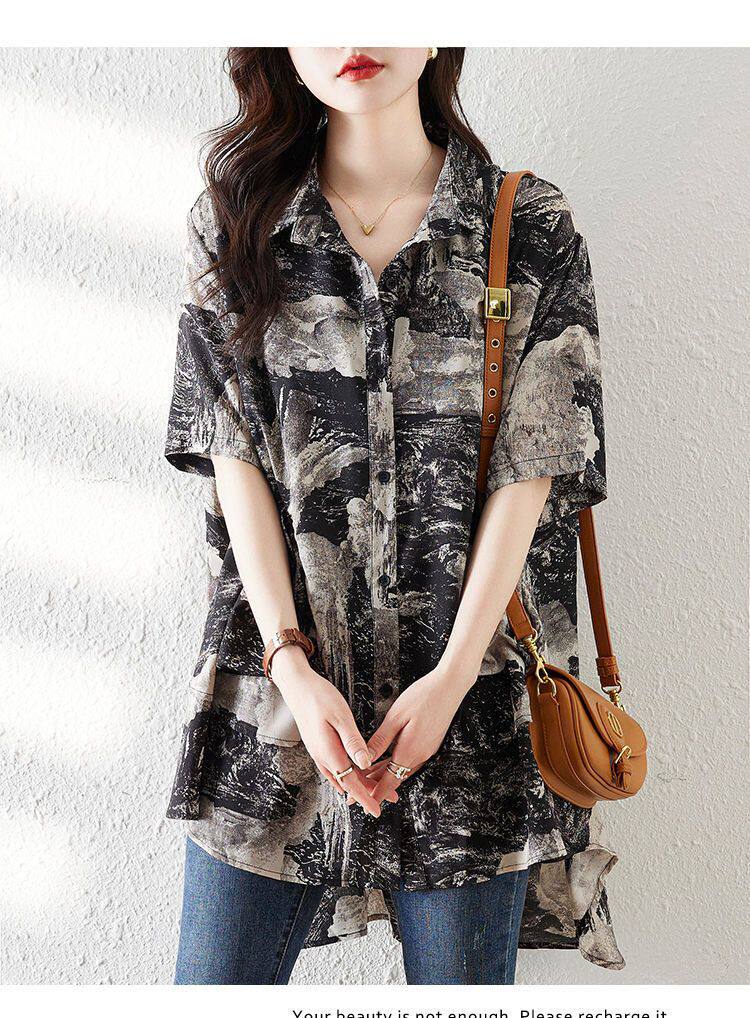 大碼復古印花休閒襯衫女夏裝2025年新款寬鬆遮肚子中長款雪紡上衣