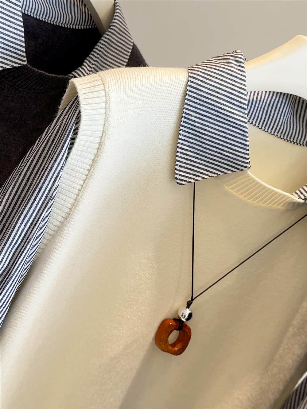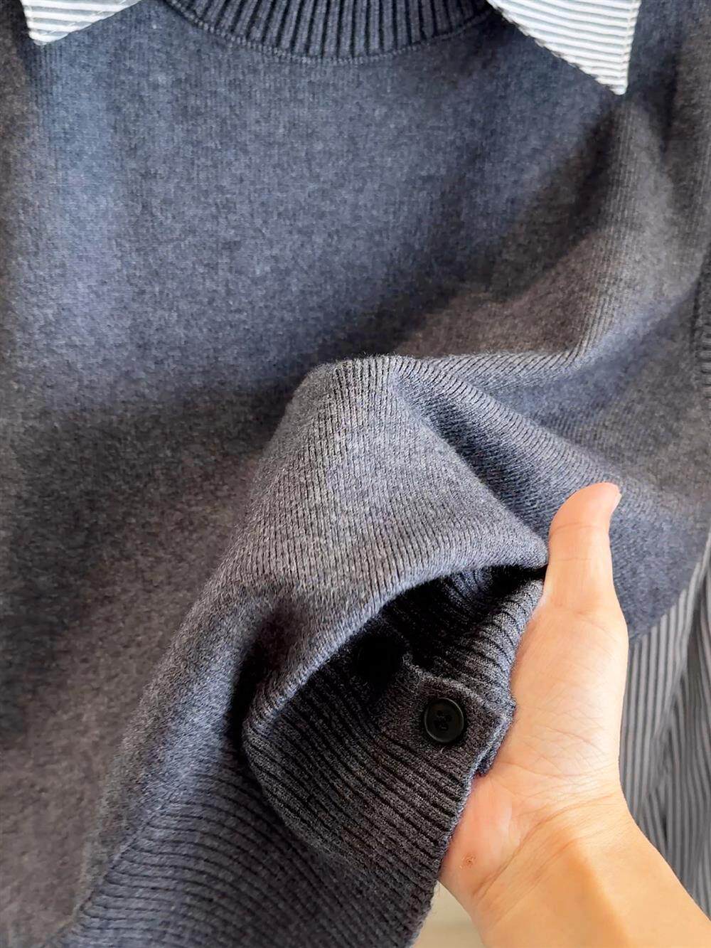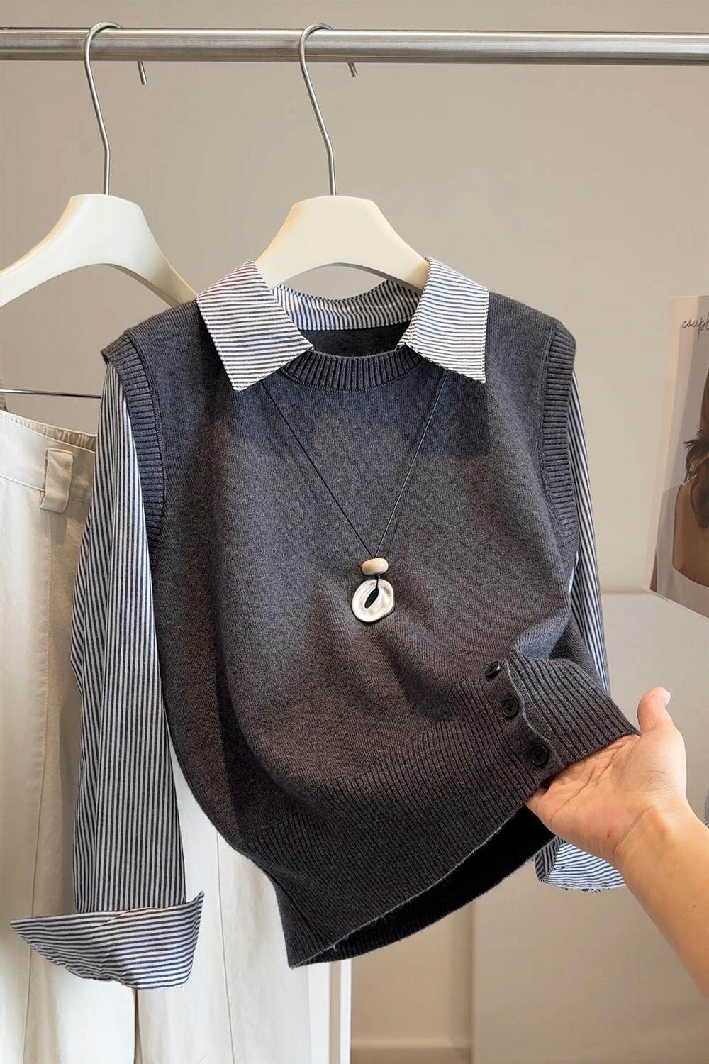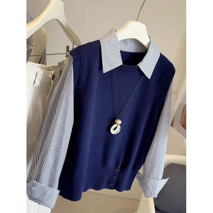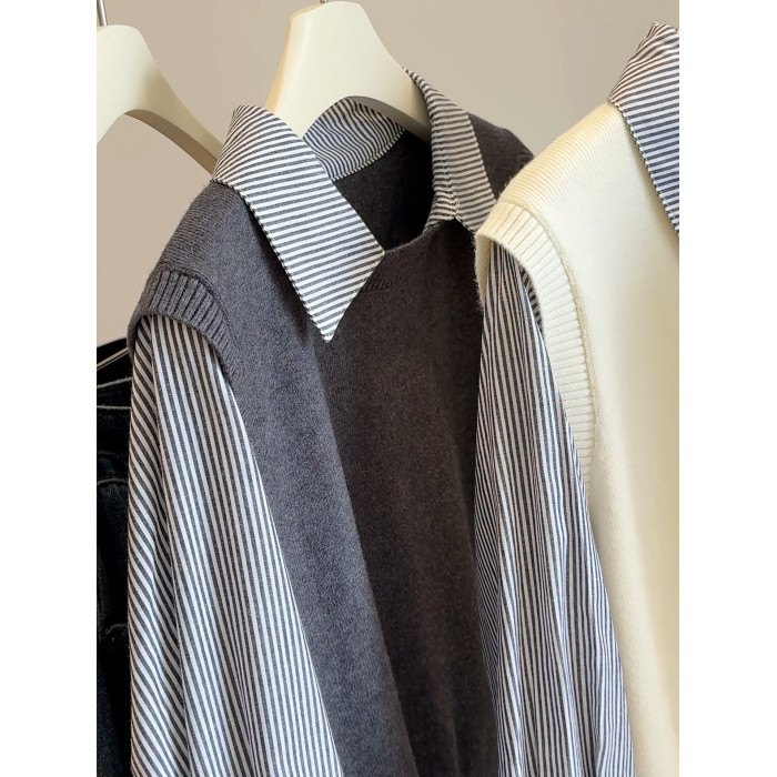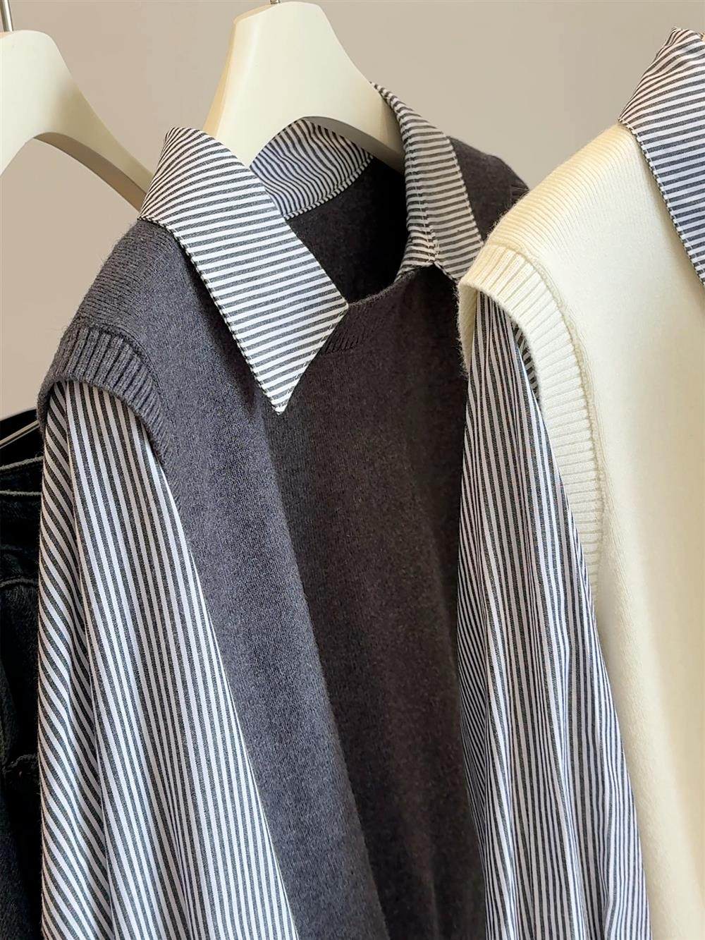 韓版25秋裝時尚休閒假兩件上衣女針織拼接條紋襯衫女減齡百搭襯衣