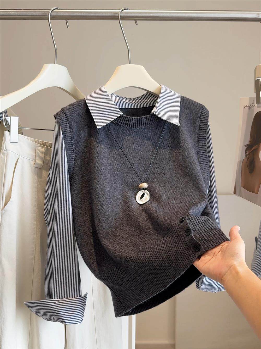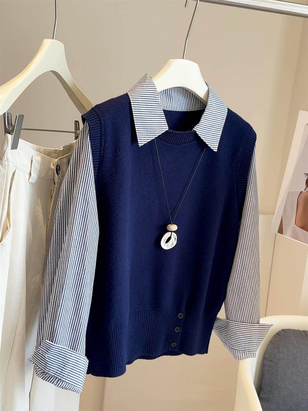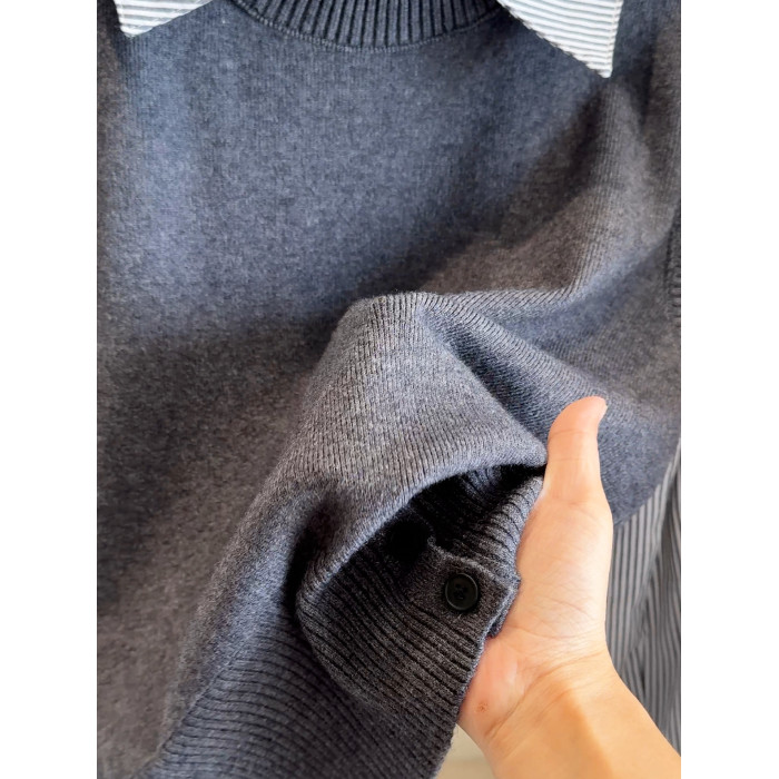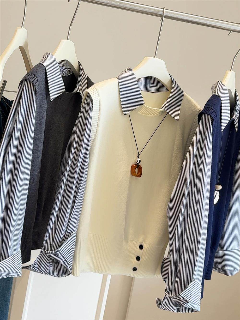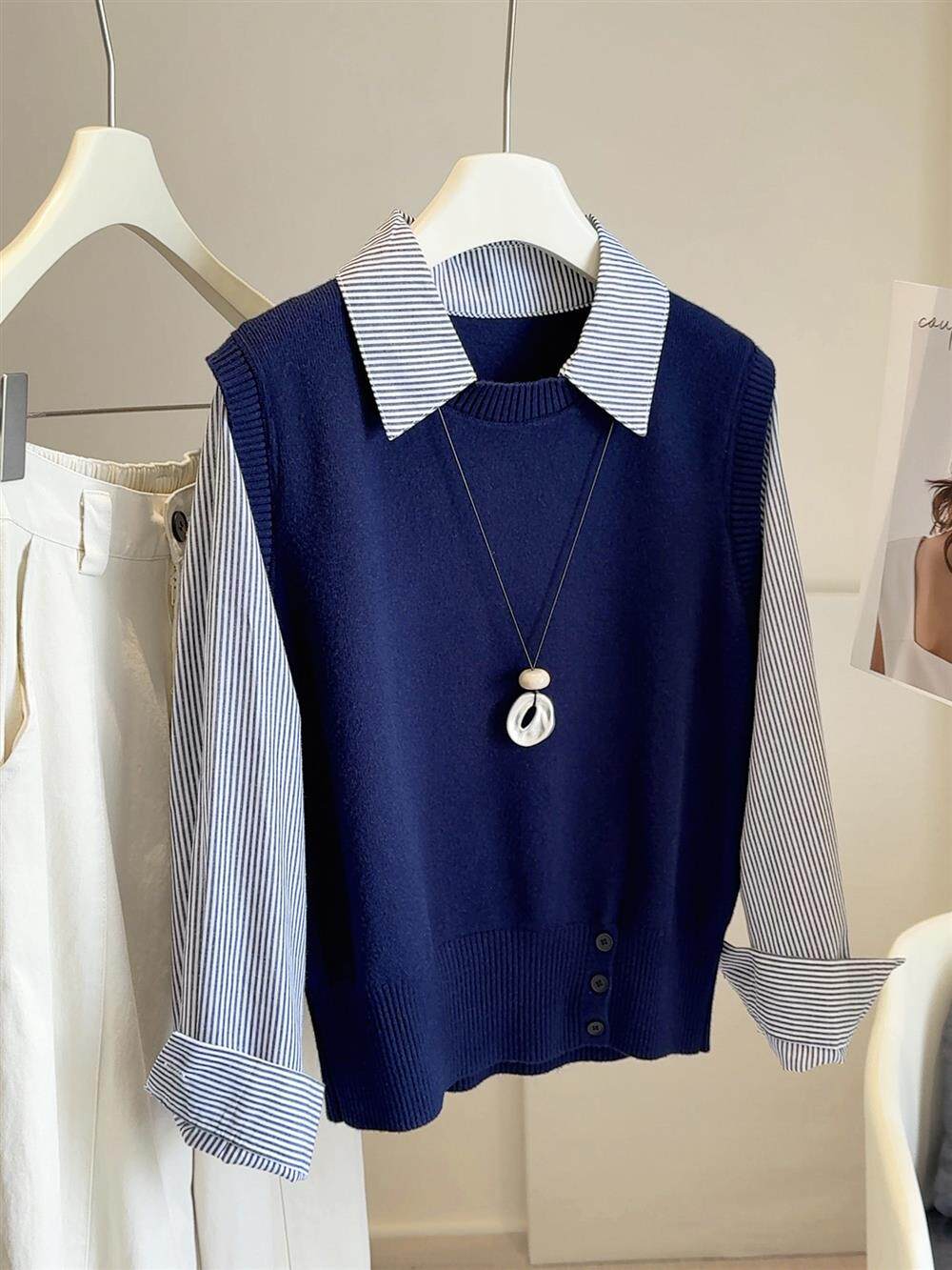 韓版25秋裝時尚休閒假兩件上衣女針織拼接條紋襯衫女減齡百搭襯衣